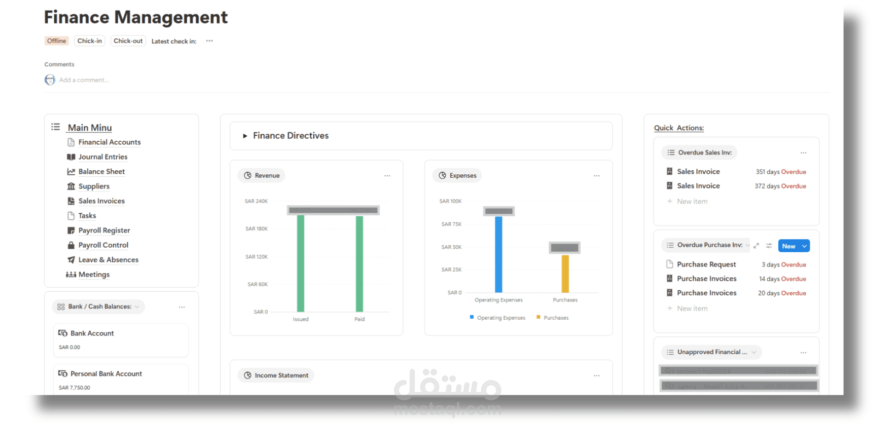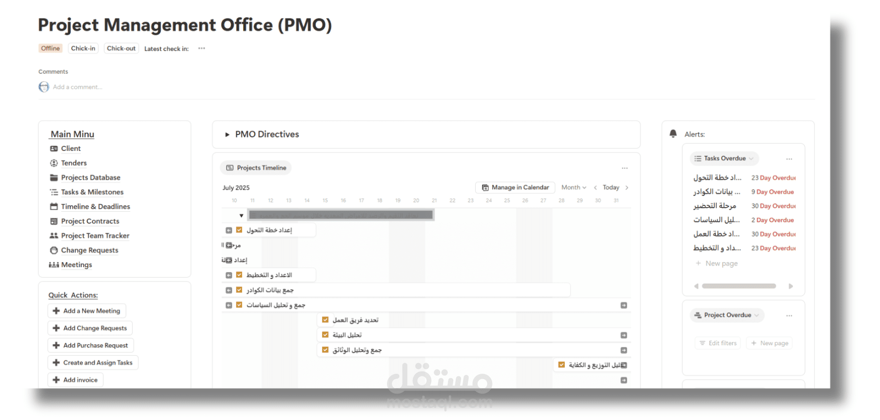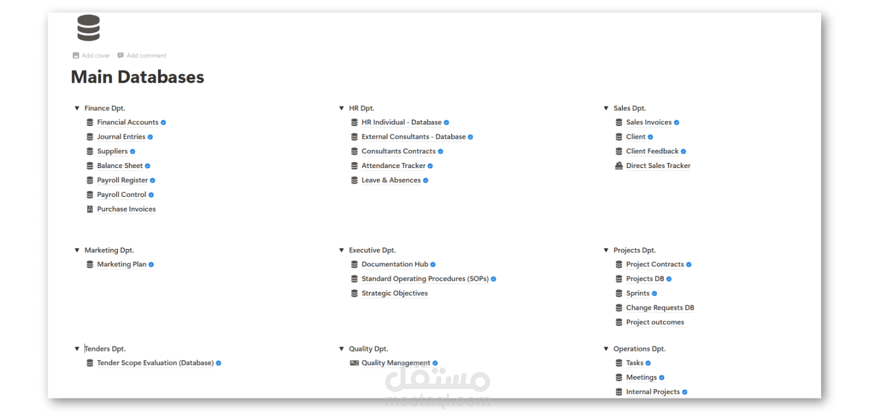 قمت بتصميم وتنفيذ نظام تشغيل رقمي متكامل لشركة متخصصة في تقديم خدمات استشارية علي منصة Notion، بهدف تحسين كفاءة إدارة العمليات وزيادة الإنتاجية.