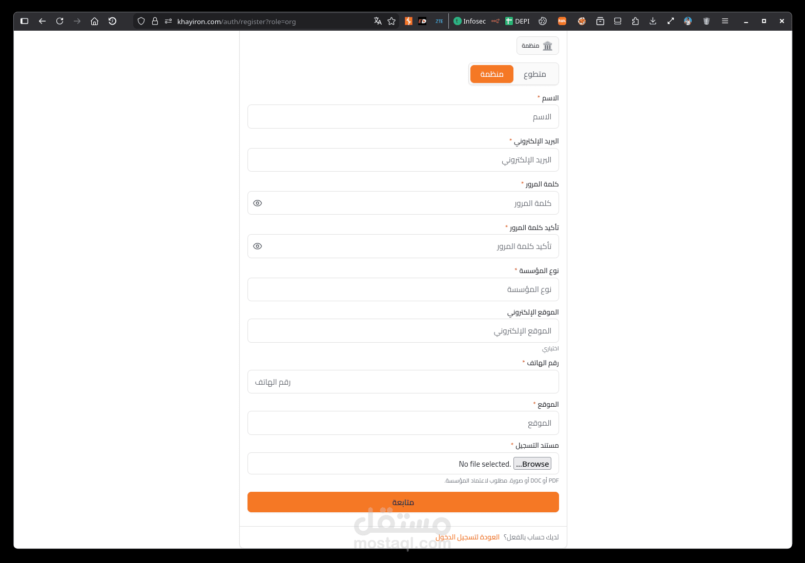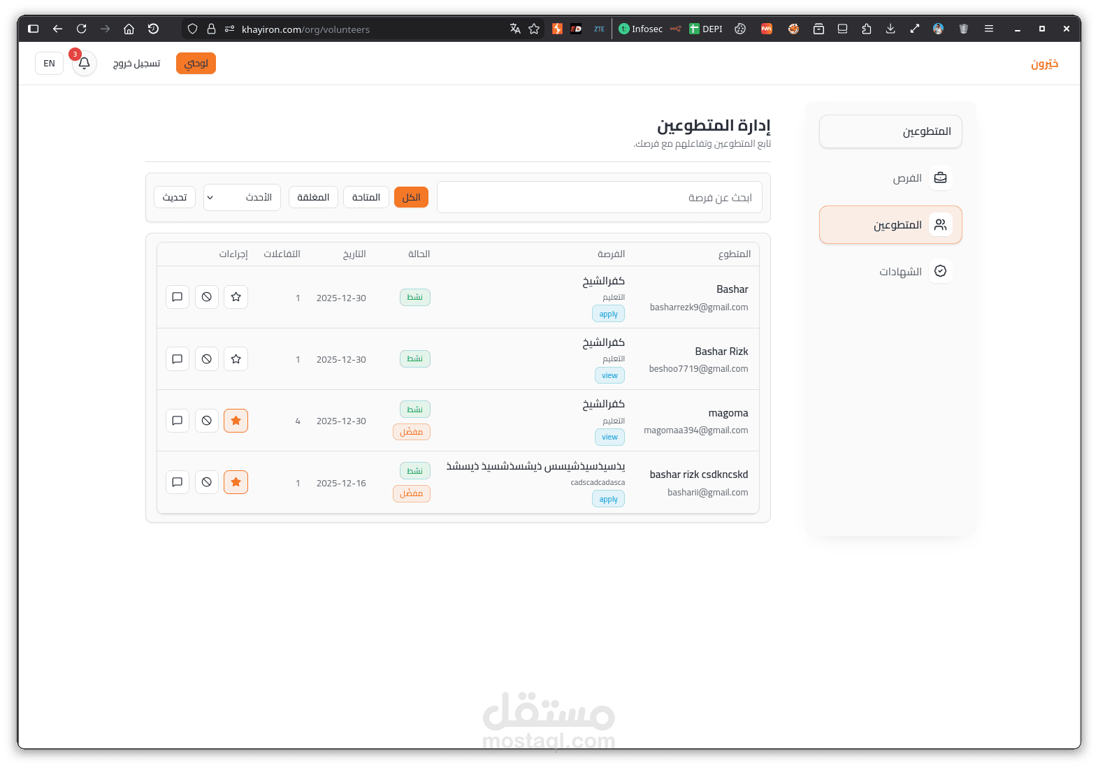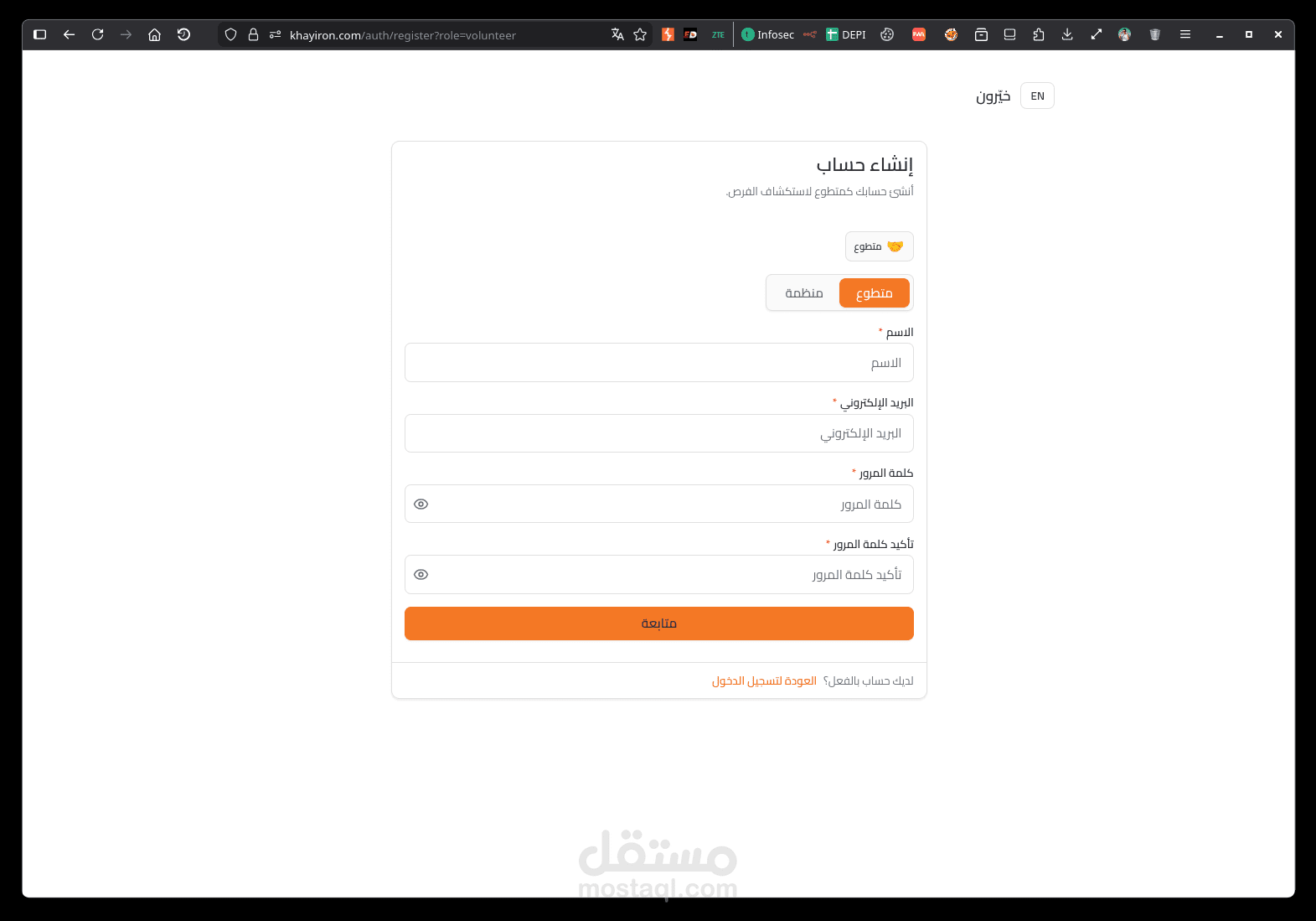 تسجيل دخول متعدد الأدوار (المتطوعون، المؤسسات، المديرون)