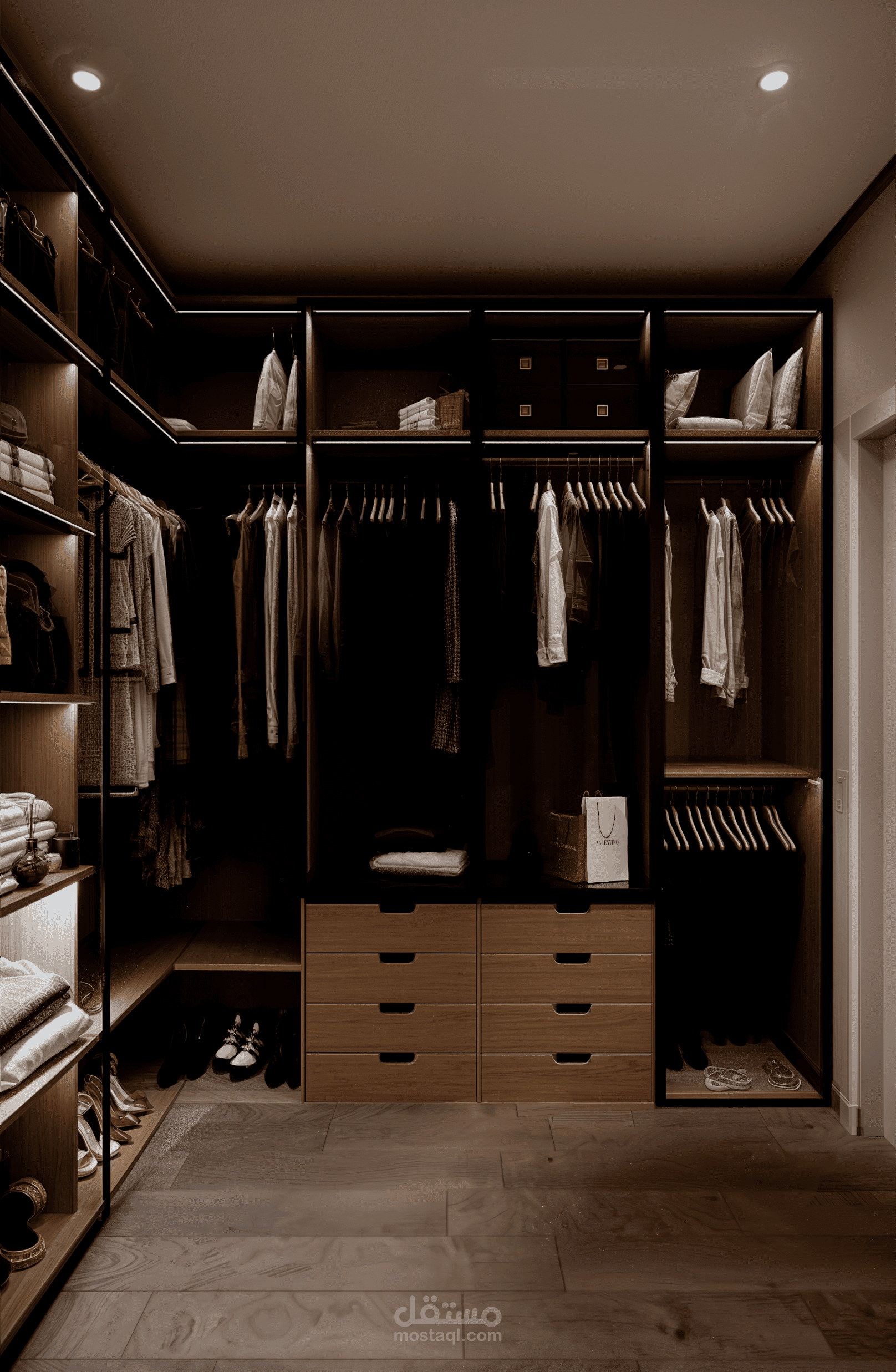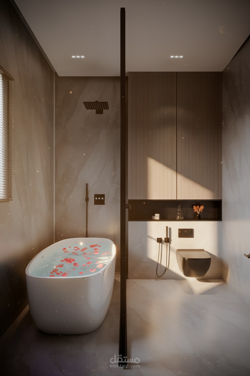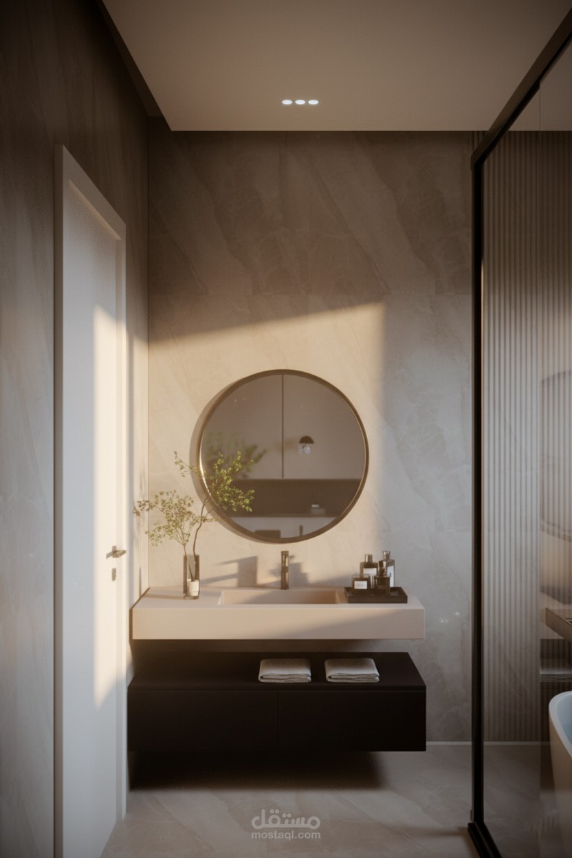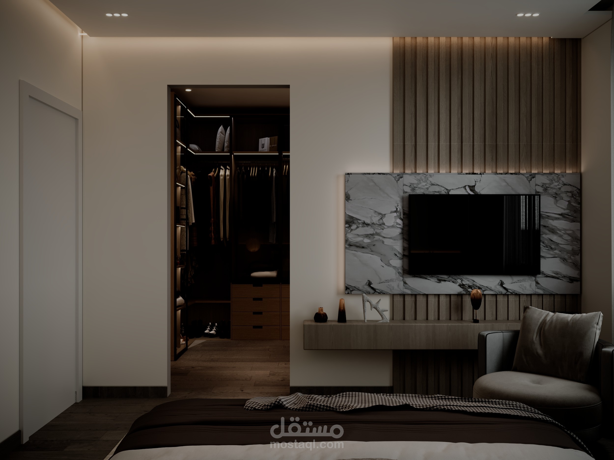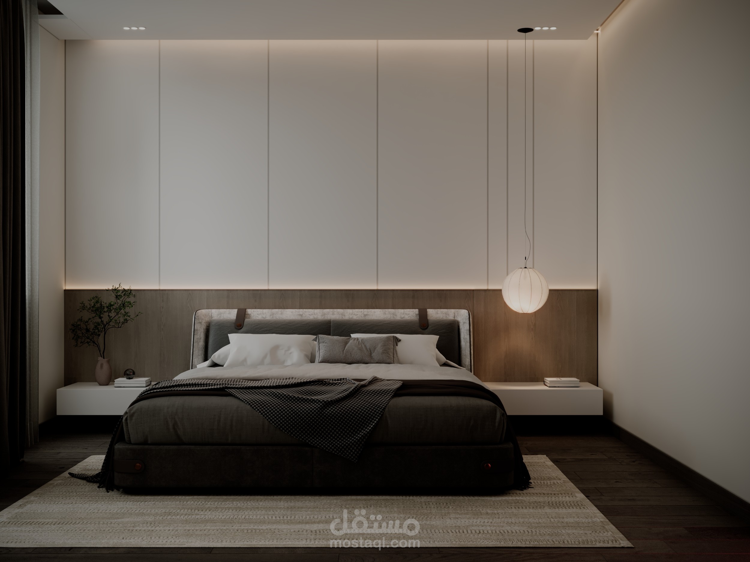 تصميم غرفة نوم مودرن أنيق يجمع بين البساطة والفخامة، حيث تتناغم الألوان الهادئة مع الخطوط العصرية لتوفير أجواء مريحة ومثالية للاسترخاء. يضفي الأثاث المصمم بعناية لمسة من العملية والجمال، بينما تضيف الإضاءة المخفية والخامات الفاخرة إحساسًا بالدفء والرفاهية، لتصبح الغرفة ملاذًا هادئًا ينبض بالراحة والأناقة.