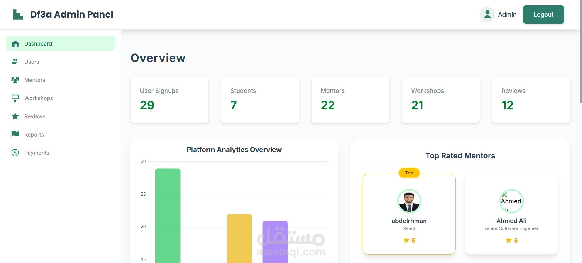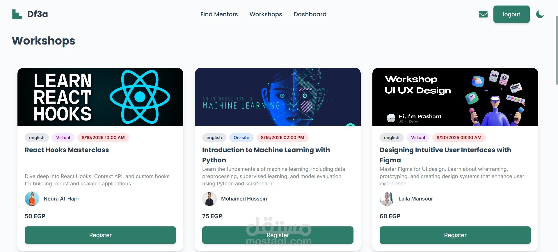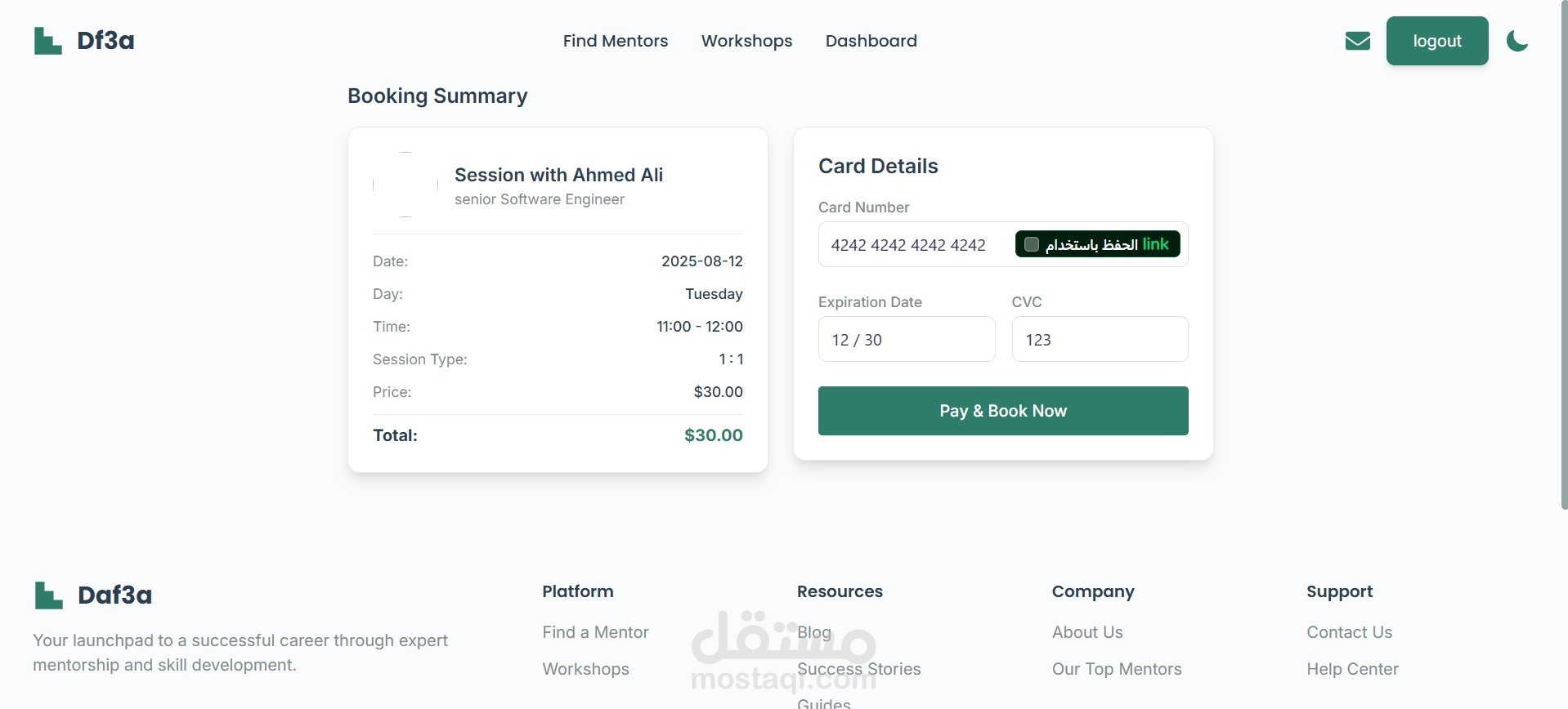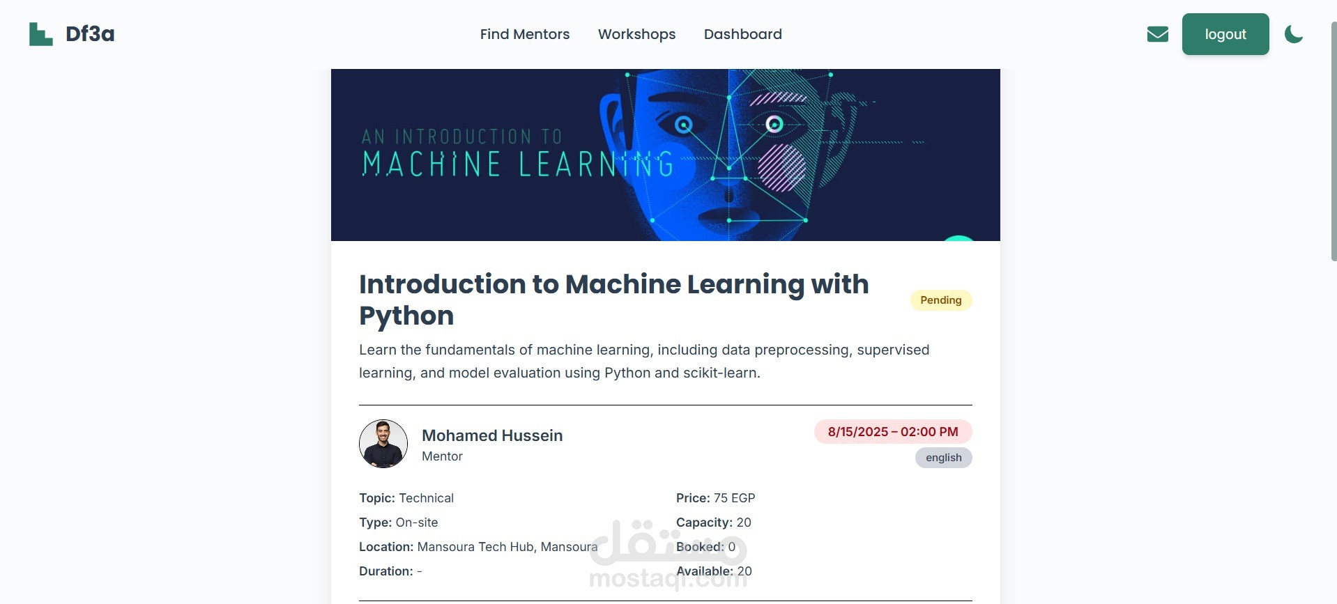 مشروع دفعة (Daf3a) هو منصة ويب متكاملة تهدف لربط الطلاب بالموجهين لدعم النمو والتطوير من خلال ورش العمل، الجلسات الفردية، المحادثات الفورية، وتوجيه المسار المهني بمساعدة الذكاء الاصطناعي.
