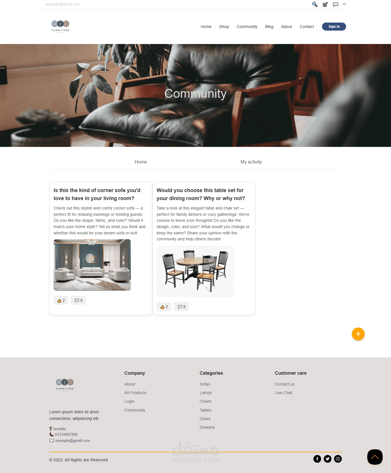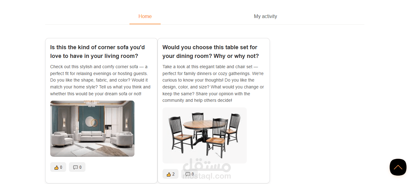 موقع إلكتروني عصري لعرض منتجات الأثاث مع قسم مدونة (Blogs) تفاعلي يتيح للمستخدمين إضافة منشوراتهم وعرضها مباشرة في نفس اللحظة باستخدام تقنيات JavaScript، مما يخلق تجربة سلسة وديناميكية.