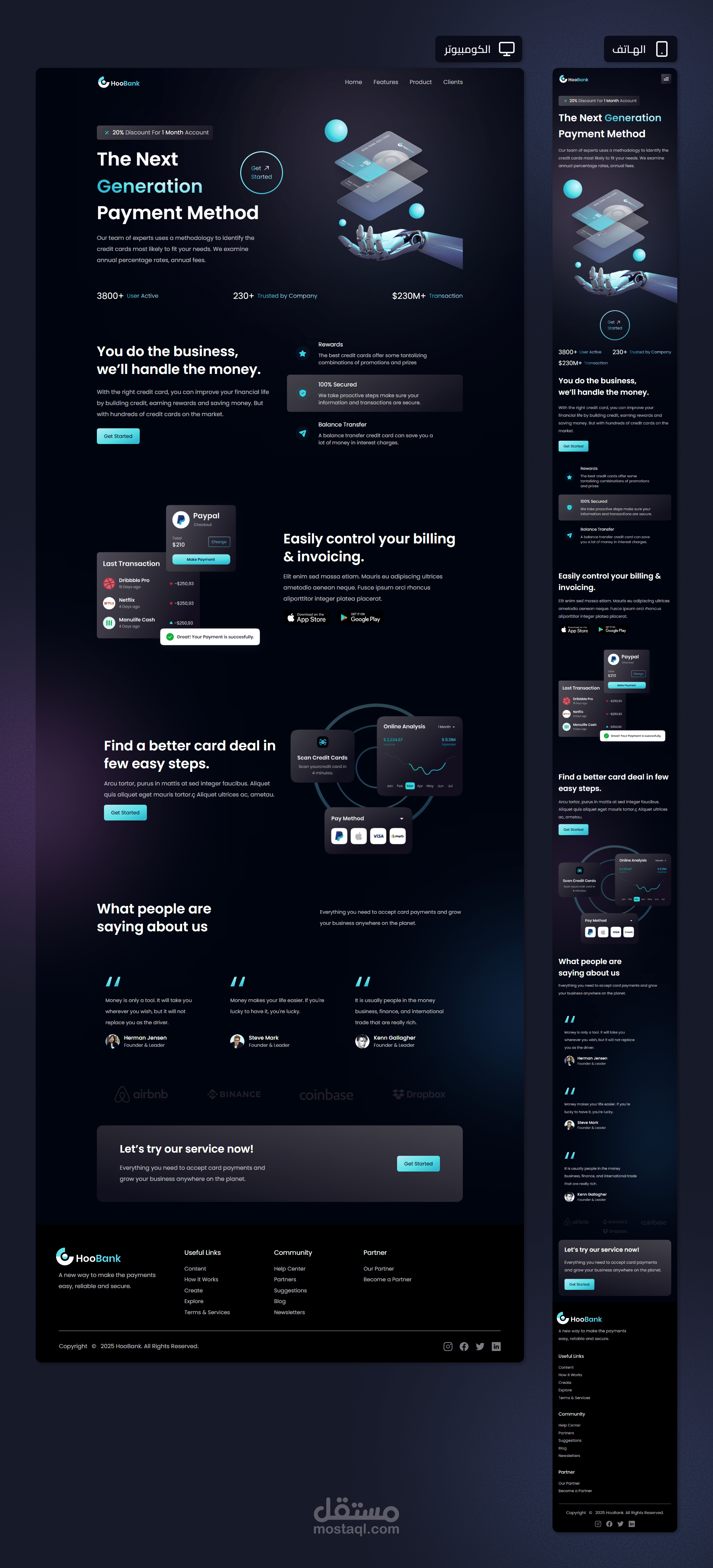 ⁖ صفحة هبوط Landing Page جذابة و عصرية لتطبيق إلكتروني اسمه Hoobank — نفذتها كثاني تطبيق عملي بعد تعلمي لـ TailwindCSS — تتميز هذه الصفحة بالتالي: