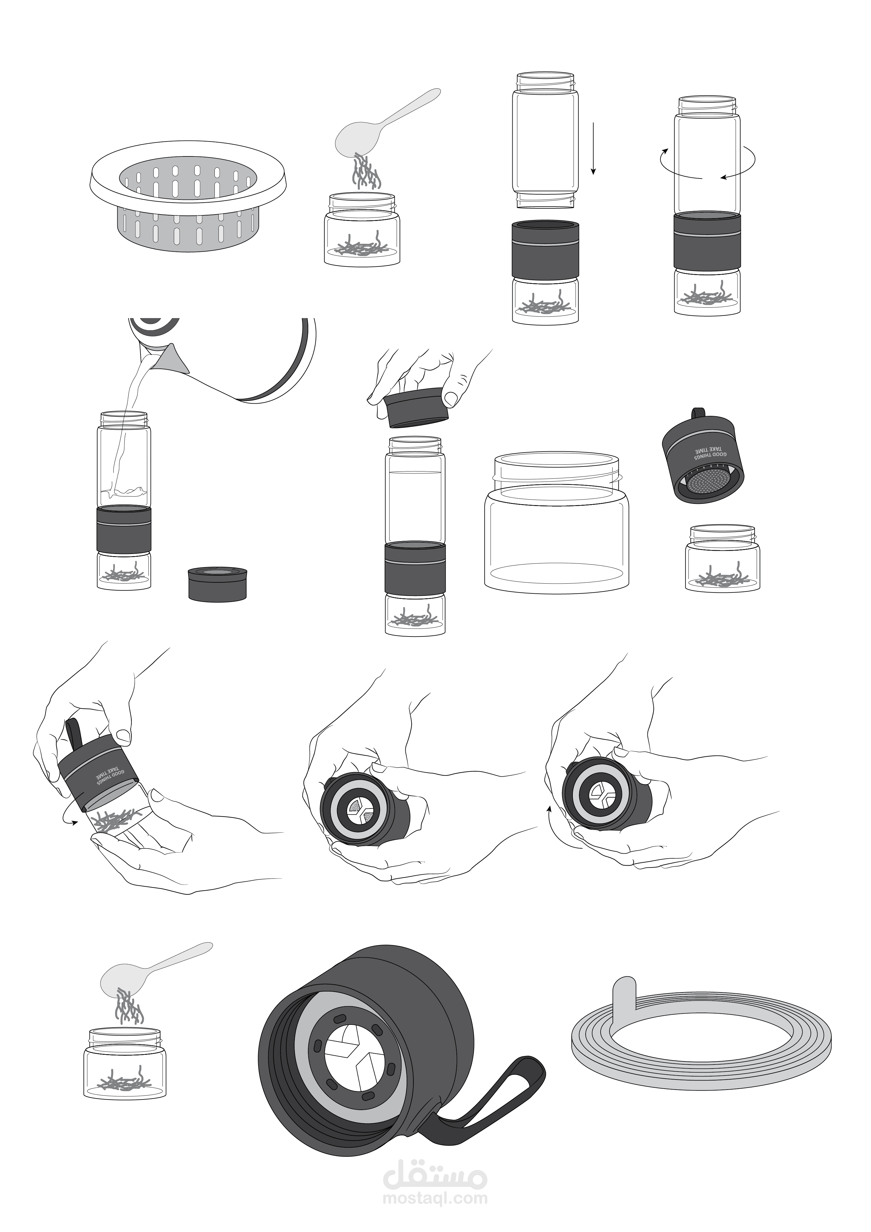 صممت دليل منتج واضح وجذاب باللغتين الإنجليزية والألمانية لماكينة الشاي. يتضمن الرسم البياني معلومات عن المكونات، وطريقة التركيب خطوة بخطوة، وتعليمات الاستخدام، مع رسوم توضيحية واضحة لضمان سهولة الفهم للمستخدمين.