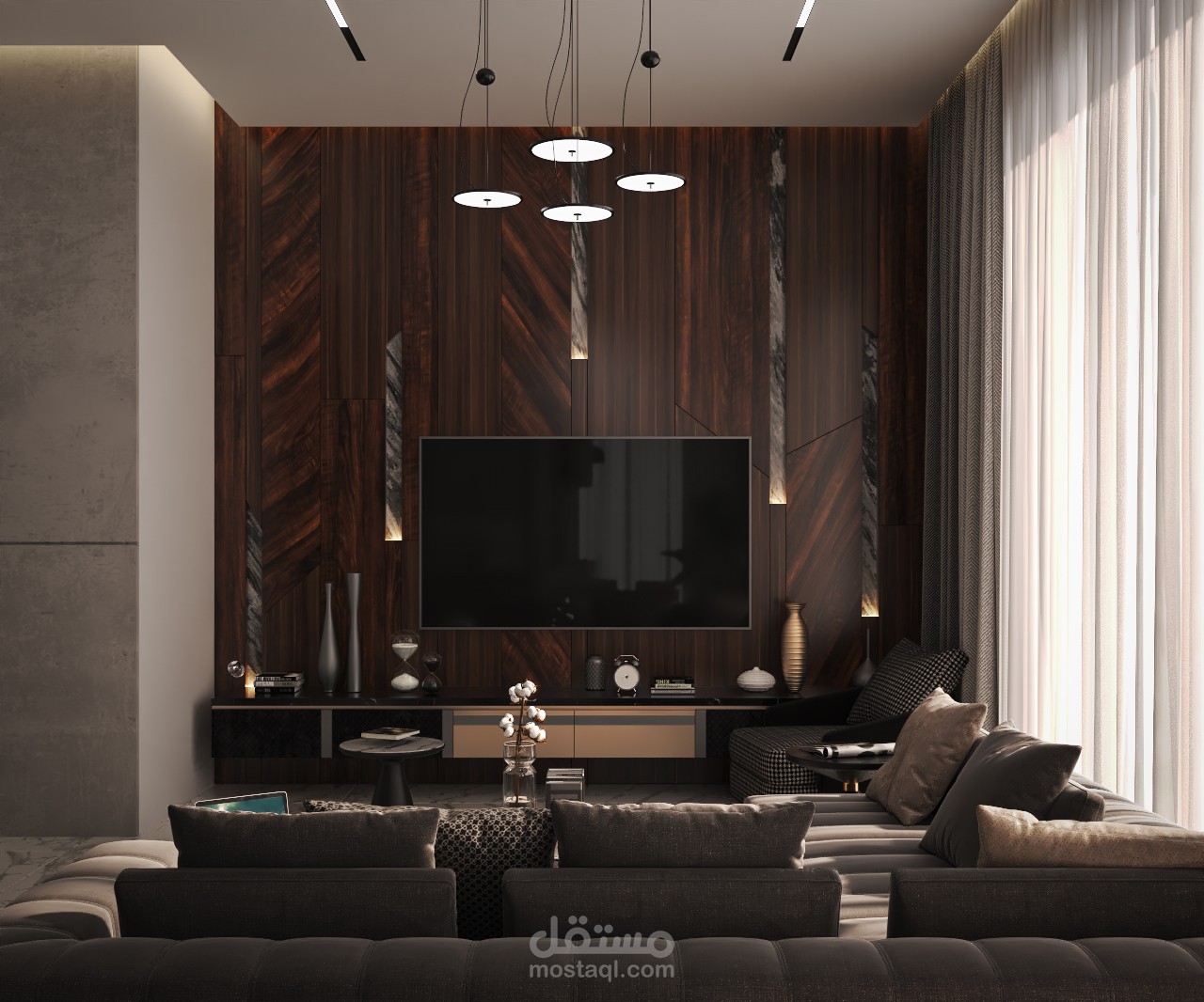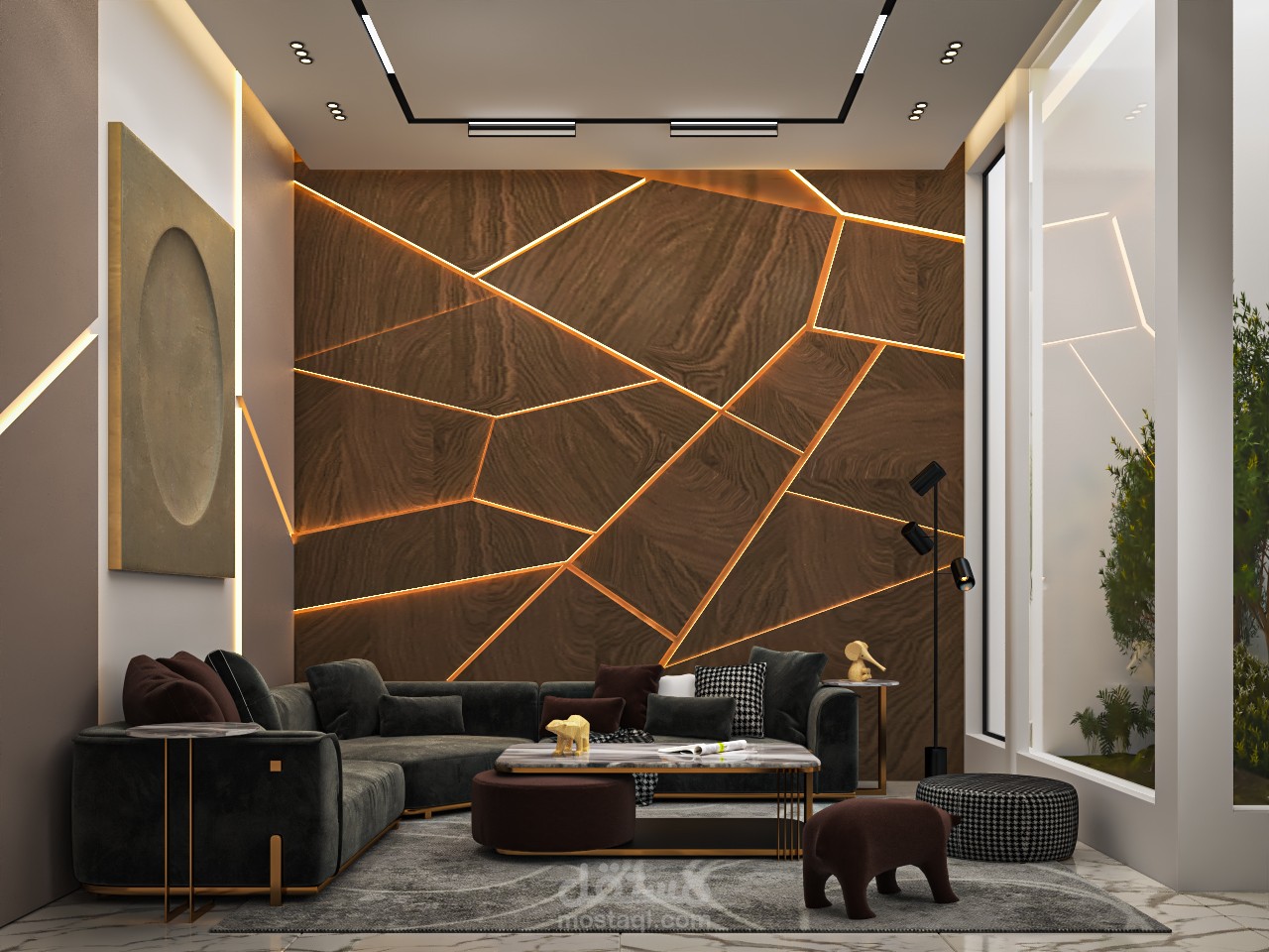 غرفة المعيشة : تم تنسيقها بألوان حيادية مع لمسات خشبية دافئة واضاءة مخفية تضيف عمقاً وأناقة للمكان .