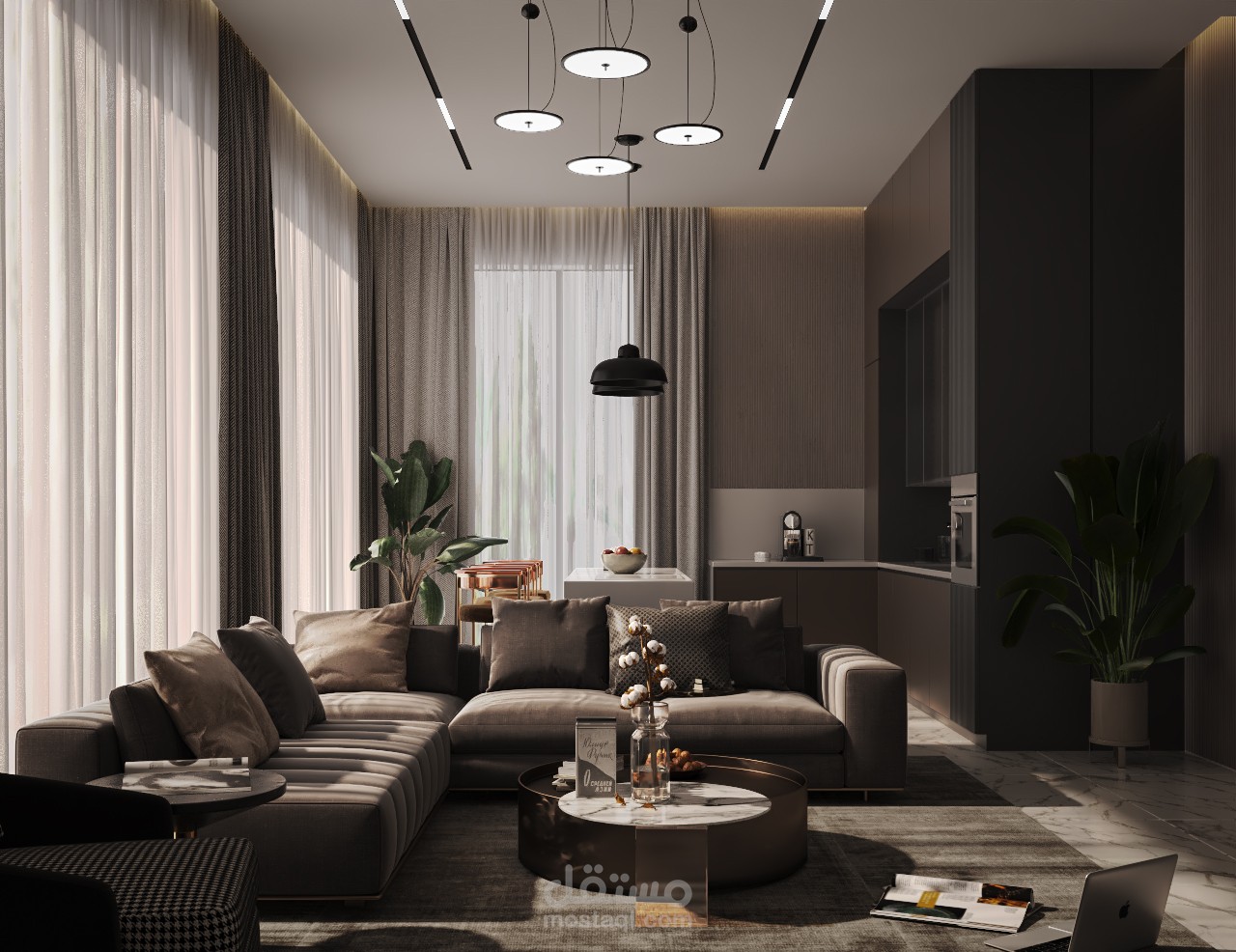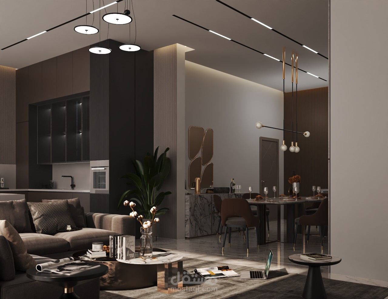 * الأسلوب المعتمد : مزيج بين الطابع العصري واللمسات الشرقية، مع التركيز على التوازن البصري وتوزيع الاضاءة الطبيعية والصناعية .