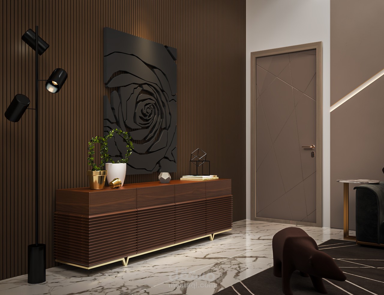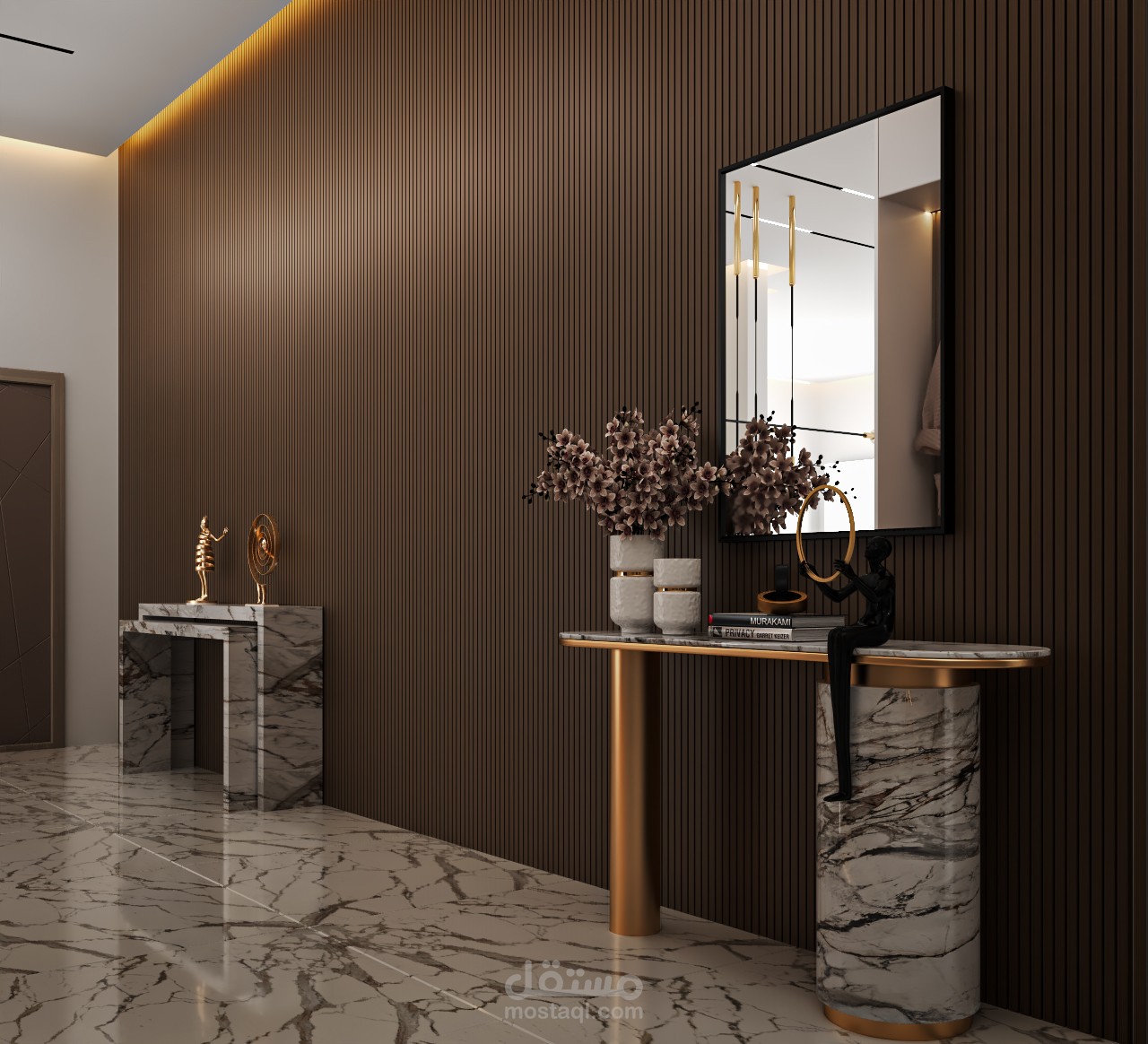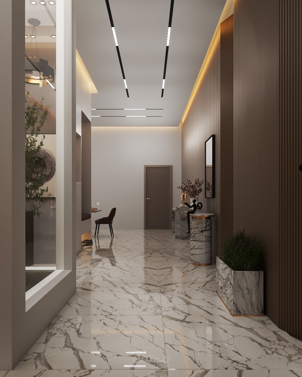 بهو الدخول و الممرات : استخدمت فيها عناصر زخرفية مثل بديل الخشب و الإضاءة الخطية لتوجيه الحركة وإضفاء طابع معماري مميز .