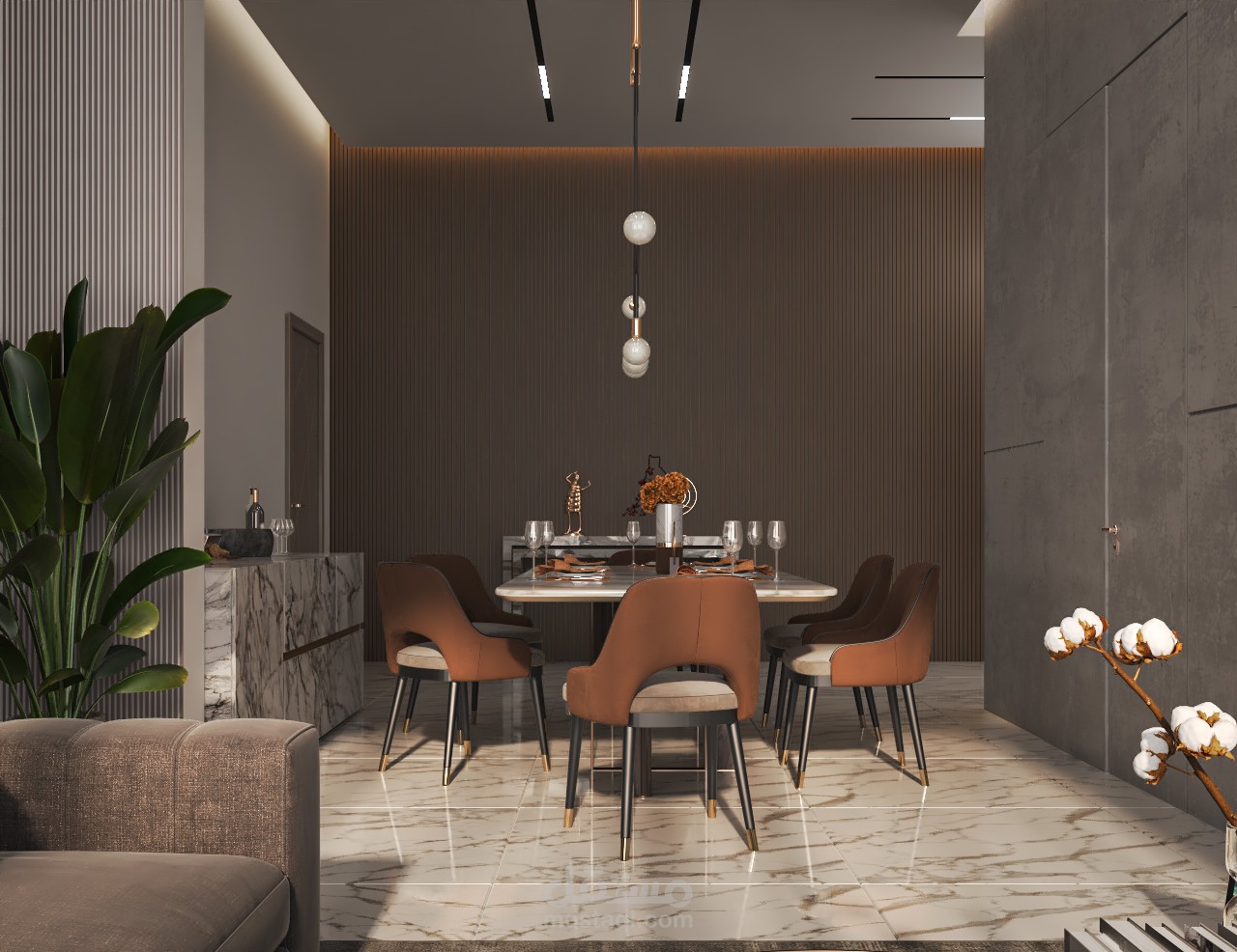 ركن الطعام : طاولة أنيقة محاطة بكراسي مريحة، تحت اضاءة معلقة تضيف لمسة فنية .