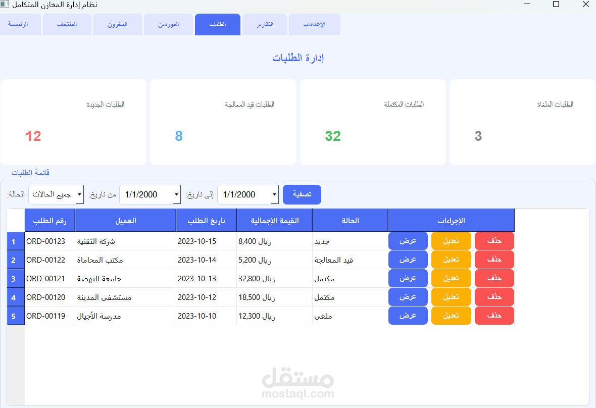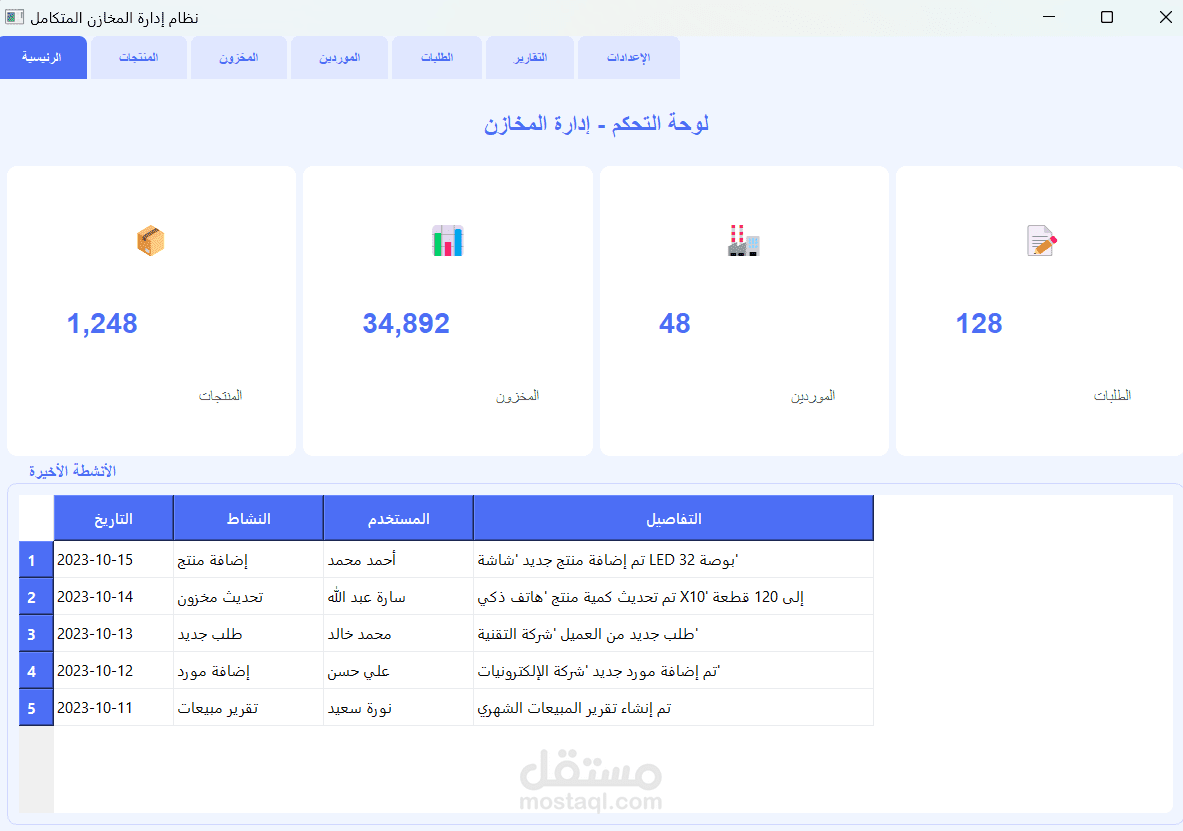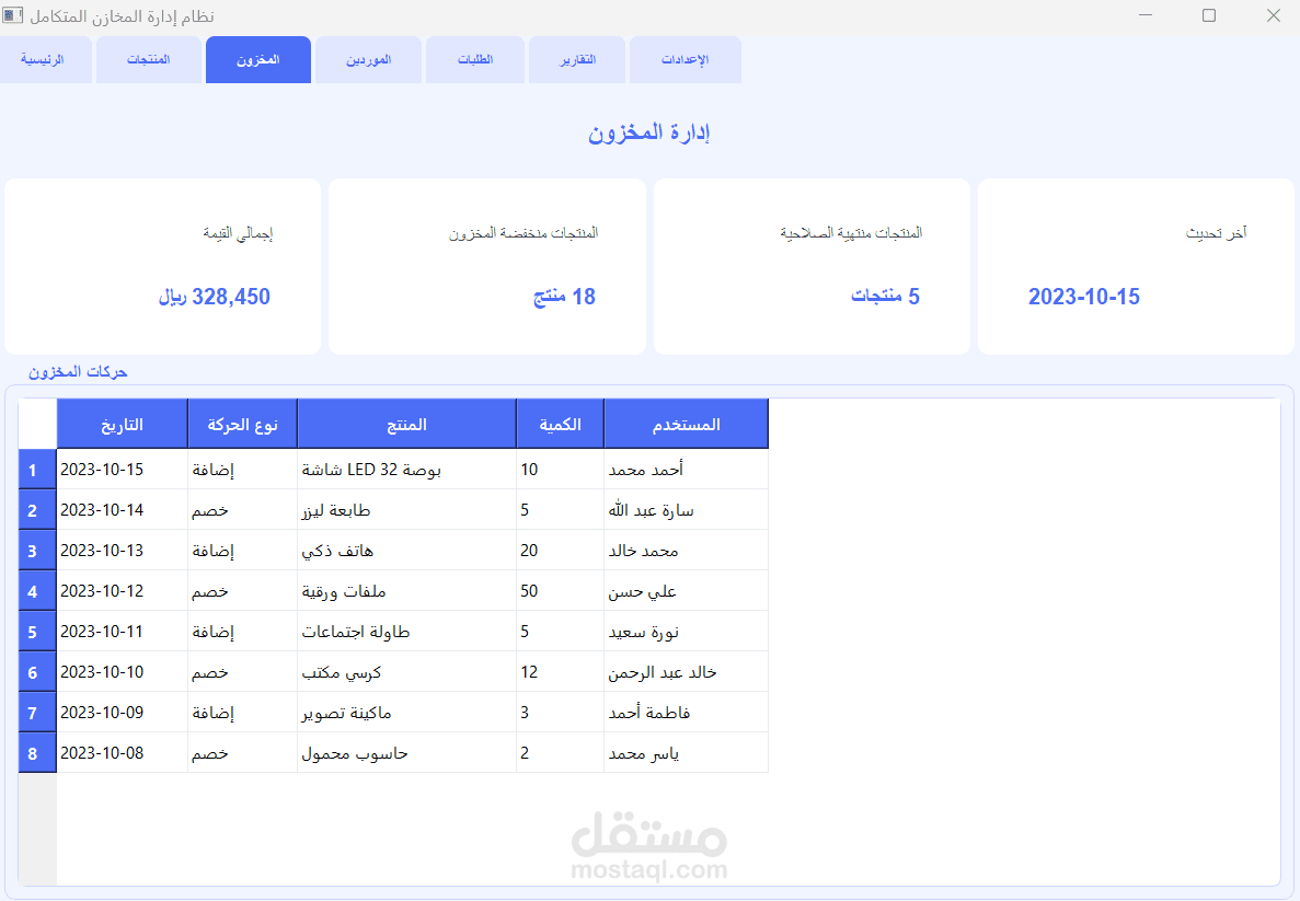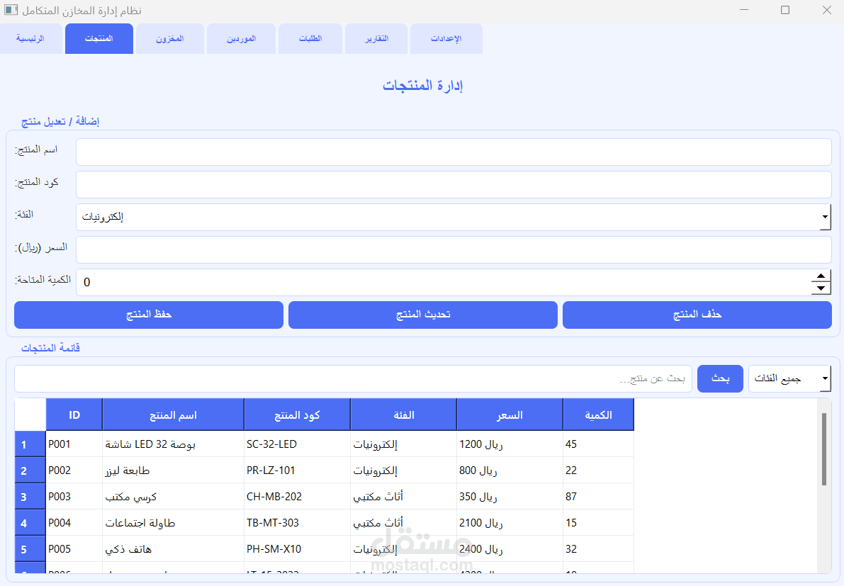 مشروع برنامج سطح مكتب متكامل لإدارة المخازن تم تطويره باستخدام لغة بايثون مع واجهة مستخدم رسومية سهلة الاستخدام. يتيح البرنامج تخزين وإدارة بيانات المنتجات، تتبع الكميات، تسجيل عمليات الدخول والخروج، وإدارة الموردين والعملاء. يعتمد البرنامج على قاعدة بيانات منظمة لضمان دقة وسرعة الوصول للمعلومات، مع ميزات مثل البحث والتصفية والتقارير الدورية لمتابعة المخزون ومستوى المخزون الأدنى. تم تصميم الواجهة لتكون بديهية تساعد المستخدمين على تنفيذ المهام بسرعة وكفاءة، كما يدعم النظام عمليات النسخ الاحتياطي واسترجاع البيانات لضمان أمان المعلومات واستمرارية العمل.