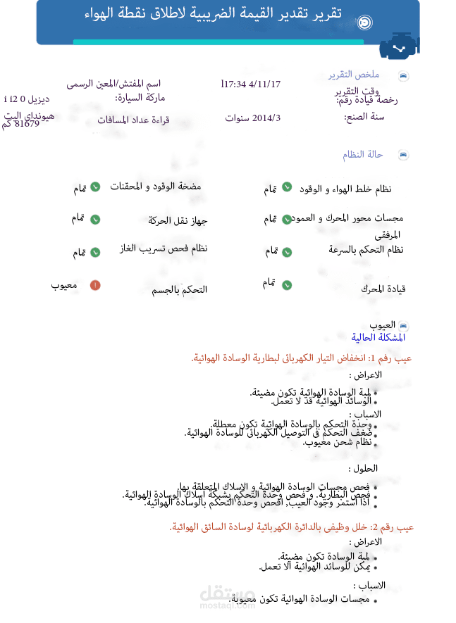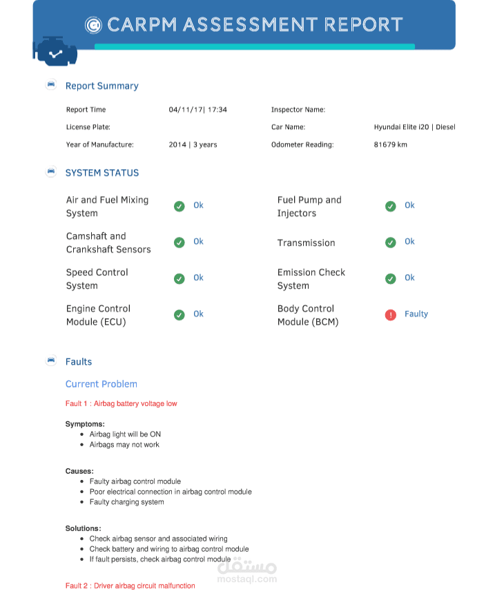 This is a sample on my work on an English Arabic Technical Translated pages, it is a report summary assessment related to a specific Car plate, with its all related systems status, such as; Air and Fuel Mixing System, Camshaft and Crankshaft Sensor, Speed Control System, Engine Control Module (ECU),....etc.Also Faults, Symptoms, Causes and Solutions are included.