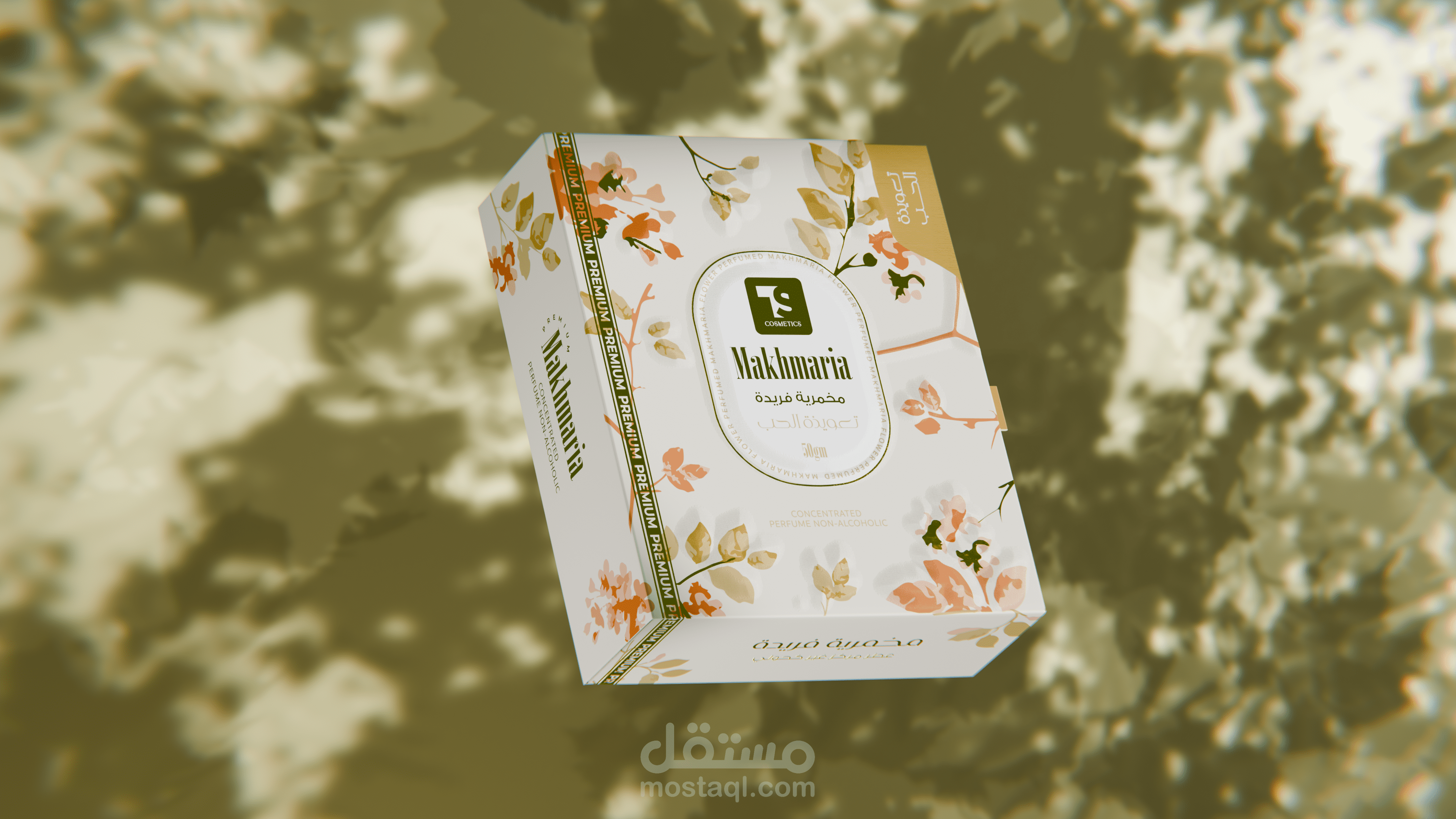 تم تصميم العلبة بخلفية فنية مموهة تعطي إحساساً بالعمق والرقي، مع مراعاة دقة الألوان وتناسقها لتعكس هوية المنتج.