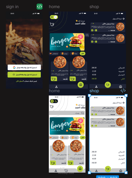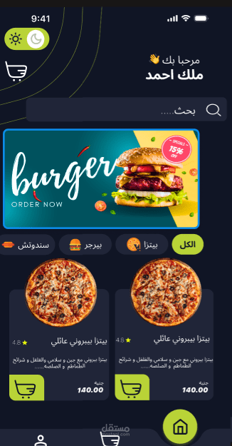 قائمة أصناف الطعام بشكل بطاقات مع صورة، اسم، وسعر.