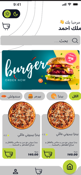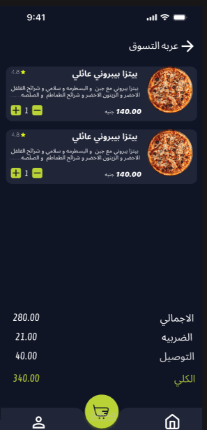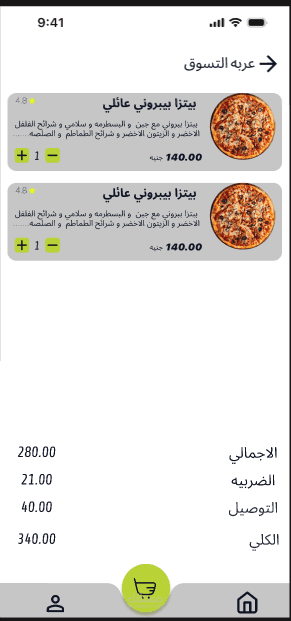 شريط تنقل سفلي يحتوي على أيقونات (السلة، الرئيسية، القائمة).