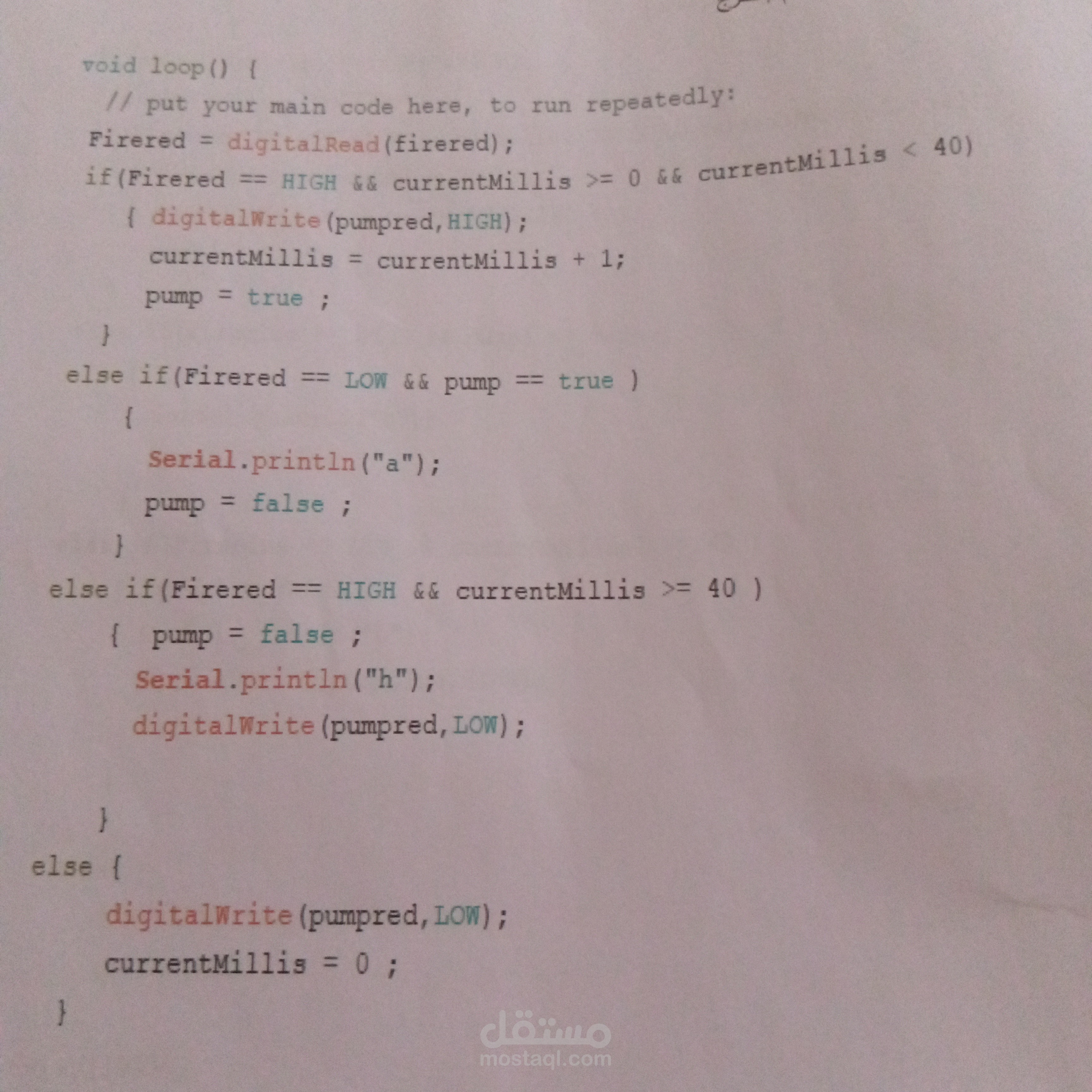 سأساعدك في تنفيذ فكرتك من شرح طبيعة الحساسات ومنافذهم وطريقة توصيلهم مع شريحة الاردوينو وكتابة الكود البرمجي الخاص بالمشروع مع إضافة التعليقات الهامة وسيتم إرفاق بملف word /pdf لشرح كامل ومفصل عن الحل وآليه العمل حيث الصور المرفقة جزء من مشروعي في نظام إطفاء الحرائق تم الاعتماد فيه ع شريحة اردوينو و حساس مشعل اللهب والمرحل والمضخة بإضافة الىشريحة البلوتوث لتؤمن الإتصال مع قسم السوفت وير
