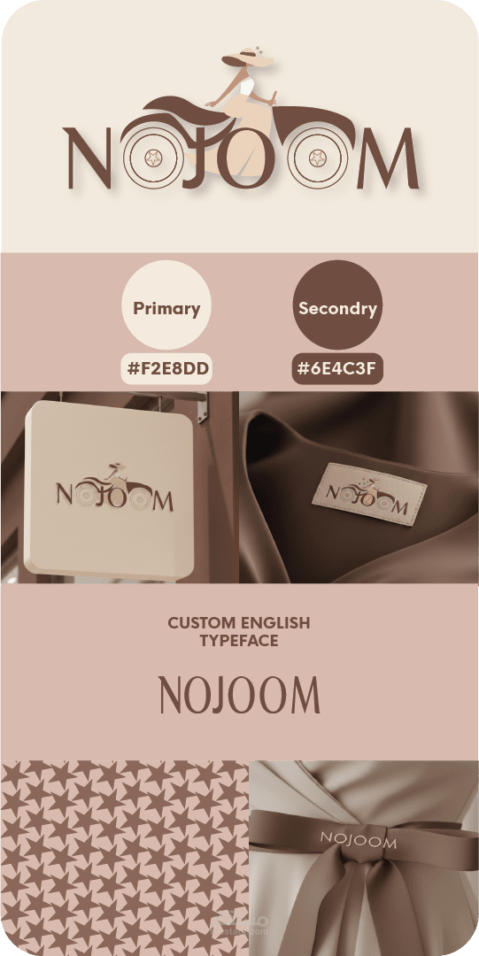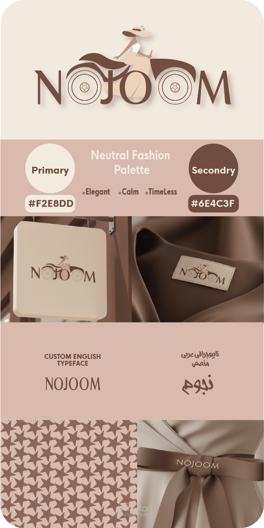 هوية بصرية كاملة لبراند ملابس نسائية تخيلي باسم "نجوم – NOJOOM"، تشمل شعار باللغة الإنجليزية ودليل الألوان والخطوط. التصميم عصري، بسيط، أنثوي وراقي، مع ألوان هادئة مثل Nude، بيج، وكريمي، وخطوط ناعمة جدًا. العمل يعكس مهارات تصميم الشعارات وبناء هوية متكاملة للبراندات النسائية، ويعد شغل Portfolio لتوضيح المستوى الاحترافي والإبداعي، ولا يمثل عميل حقيقي.