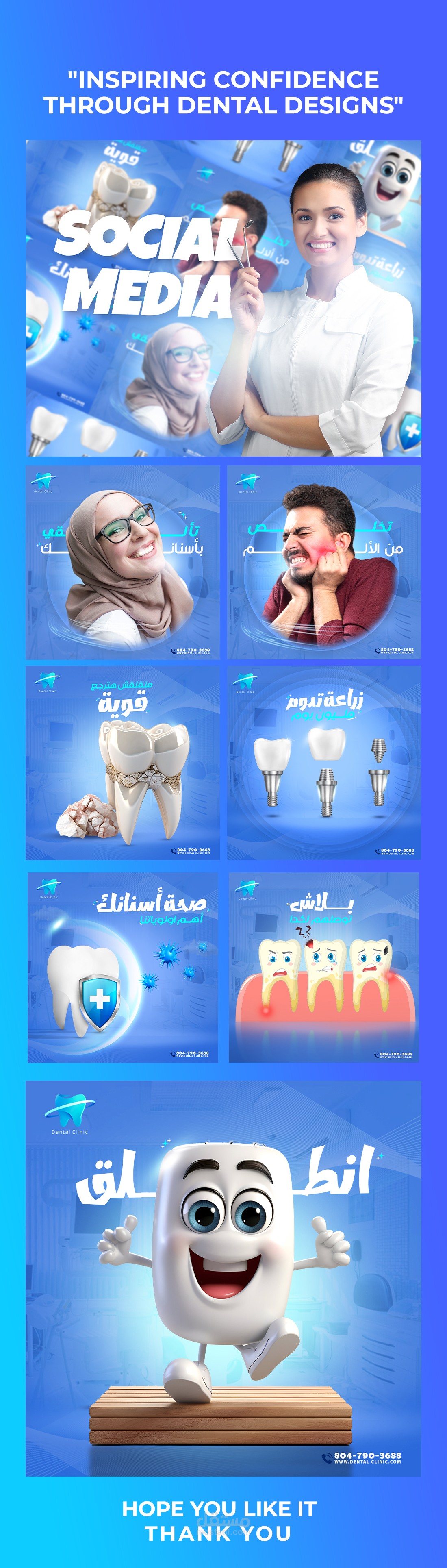 قمت بتنفيذ مشروع متكامل لعيادة أسنان، شمل ابتكار وتصميم مجموعة من العناصر الدعائية التي تبرز احترافية العيادة وتجذب العملاء.