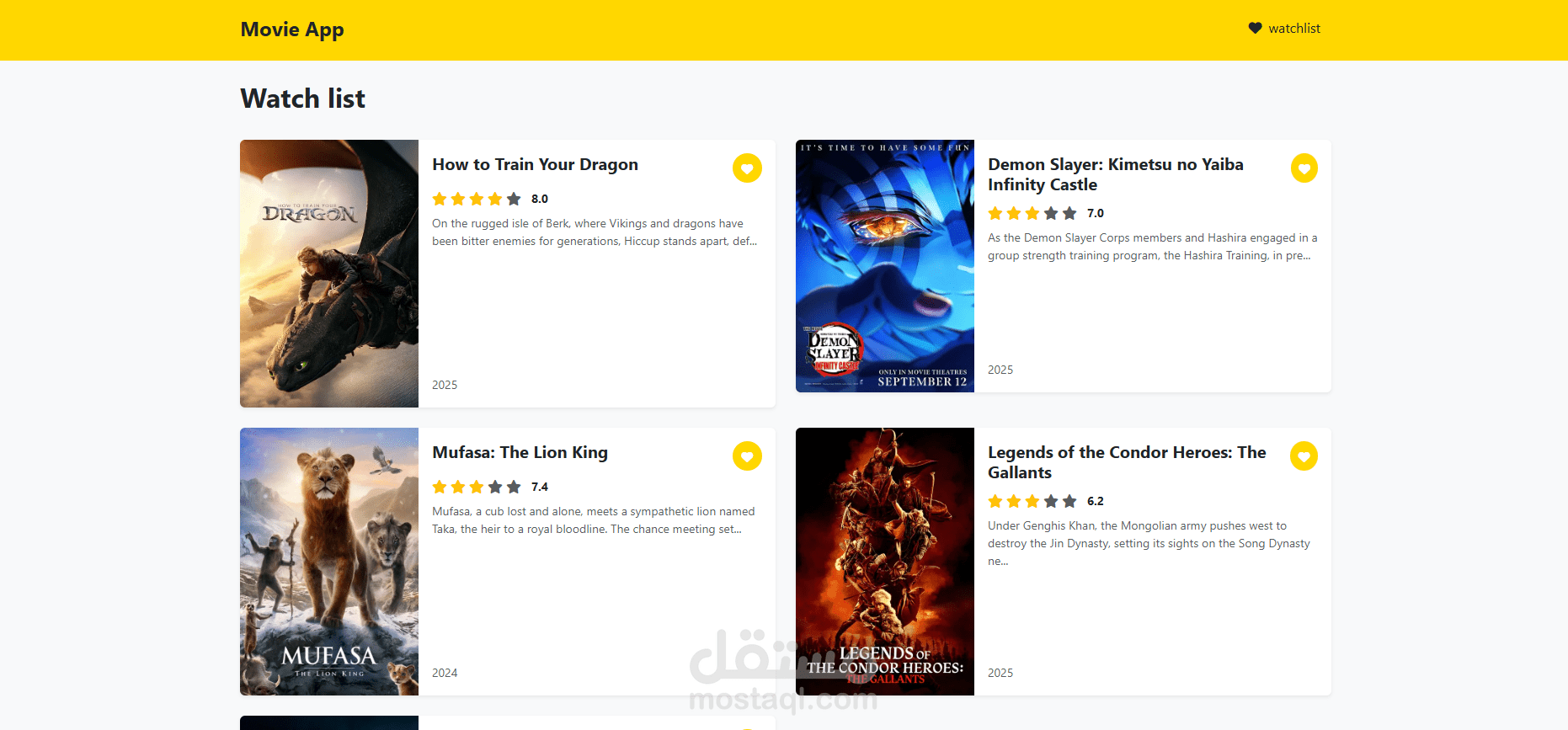 تطبيق Movie App هو موقع ويب تفاعلي لعرض ومتابعة قوائم الأفلام، تم تطويره باستخدام تقنيات MEAN Stack (MongoDB، Express.js، Angular، Node.js)، ويتميز بتصميم عصري متجاوب يعمل بسلاسة على جميع الأجهزة (كمبيوتر، تابلت، وموبايل). يتيح للمستخدمين استعراض معلومات الأفلام مثل العنوان، التقييم، السنة، والوصف من قاعدة بيانات ديناميكية، مع تجربة تصفح سريعة بفضل استخدام Angular Routing. كما يوفر التطبيق ميزة حفظ الأفلام المفضلة في قائمة خاصة لسهولة الوصول إليها لاحقًا، مع عرض منظم لتلك القائمة ضمن واجهة المستخدم. يعتمد التطبيق على واجهة منظمة وسهلة الاستخدام، ويقدم أداءً ممتازًا سواء في الواجهة الأمامية أو الخلفية، مع استضافة مرنة عبر Vercel.