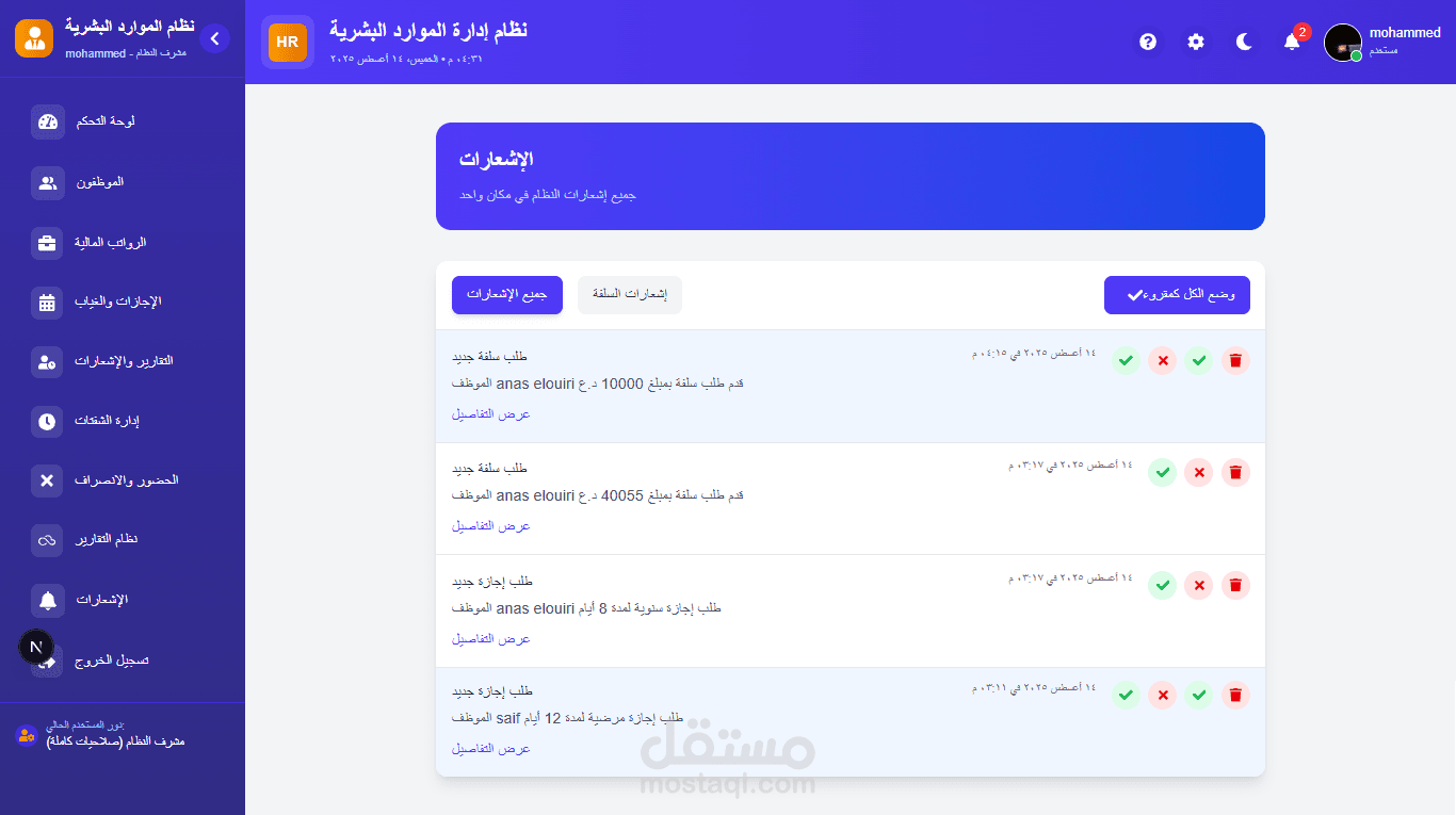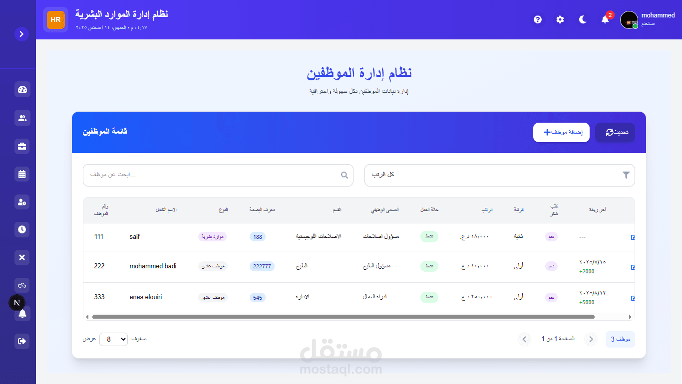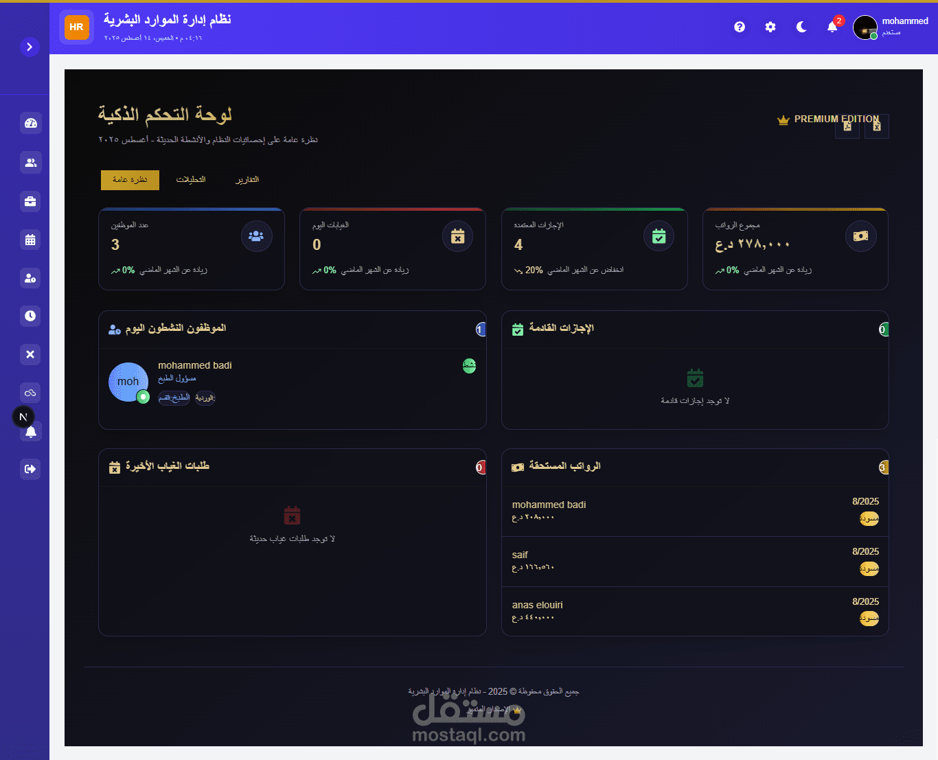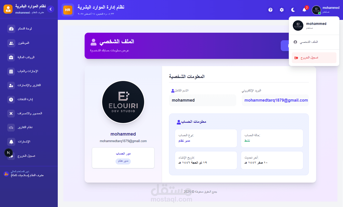 طوّرت نظامًا احترافيًا لإدارة الموارد البشرية يجمع بين القوة الدقة وسهولة الاستخدام يوفّر النظام إدارة شاملة لملفات الموظفين، الرواتب، الإجازات والحضور والانصراف