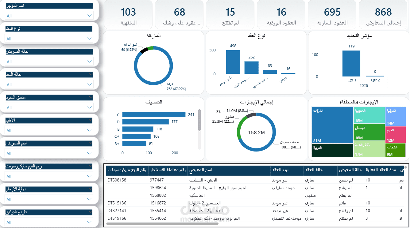 Built an interactive Contract Management Dashboard in Power BI to track active, expired, expiring, and pending contracts, analyze rental distribution, monitor renewal indicators, and provide detailed operational visibility across regions, contract types, and showrooms to support data-driven decision-making.