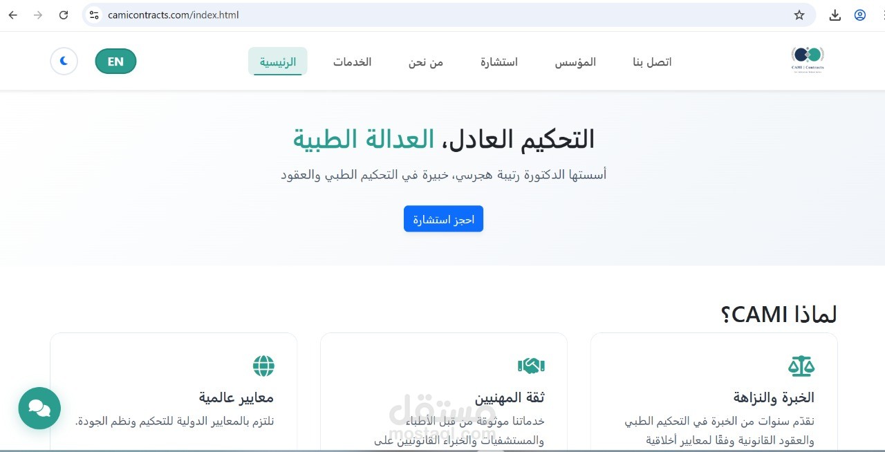 قمت بتصميم وتطوير موقع CAMI Contracts، وهو منصة متخصصة في التحكيم الطبي والعقود القانونية، مع لوحة تحكم متكاملة لإدارة الاستشارات والمحتوى.