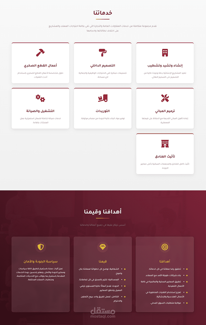يهدف إلى إبراز خبرة الشركة في مجالات البناء، التشيد، الترميم، والأعمال الصخرية بأسلوب عصري وجذاب.