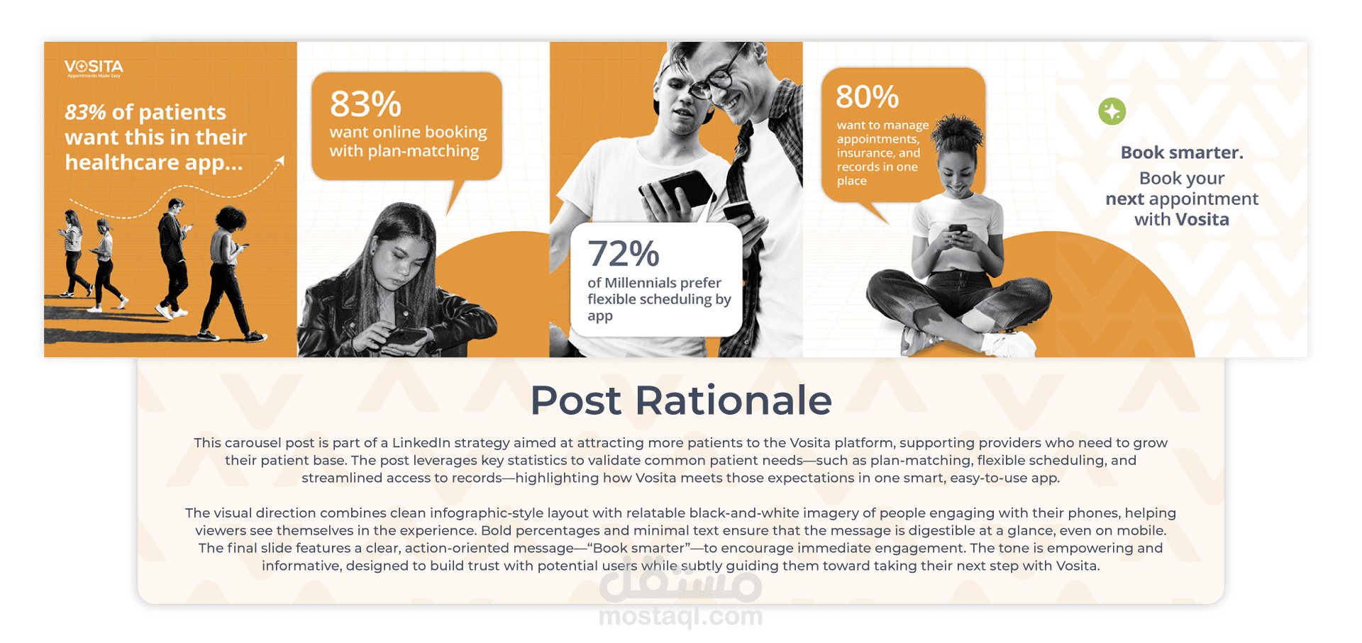 This carousel post is part of a LinkedIn strategy aimed at attracting more patients to the Vosita platform, supporting providers who need to grow their patient base. The post leverages key statistics to validate common patient needs—such as plan-matching, flexible scheduling, and streamlined access to records—highlighting how Vosita meets those expectations in one smart, easy-to-use app.