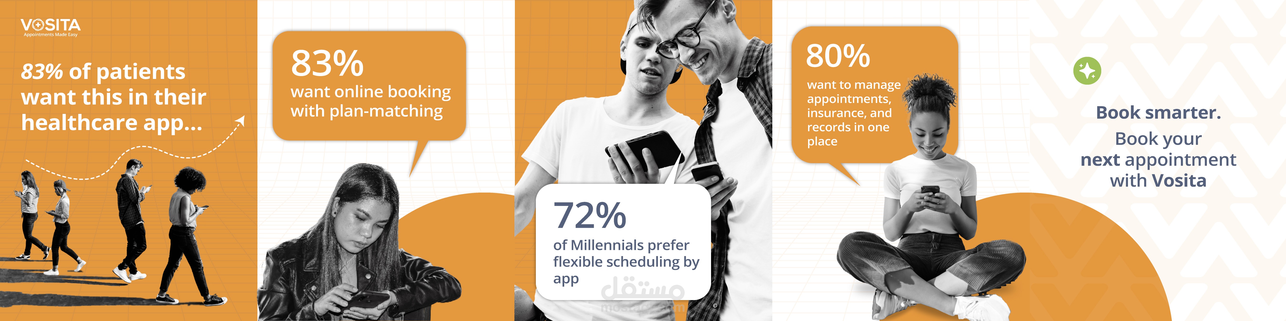The visual direction combines clean infographic-style layout with relatable black-and-white imagery of people engaging with their phones, helping viewers see themselves in the experience. Bold percentages and minimal text ensure that the message is digestible at a glance, even on mobile. The final slide features a clear, action-oriented message—“Book smarter”—to encourage immediate engagement. The tone is empowering and informative, designed to build trust with potential users while subtly guiding them toward taking their next step with Vosita.