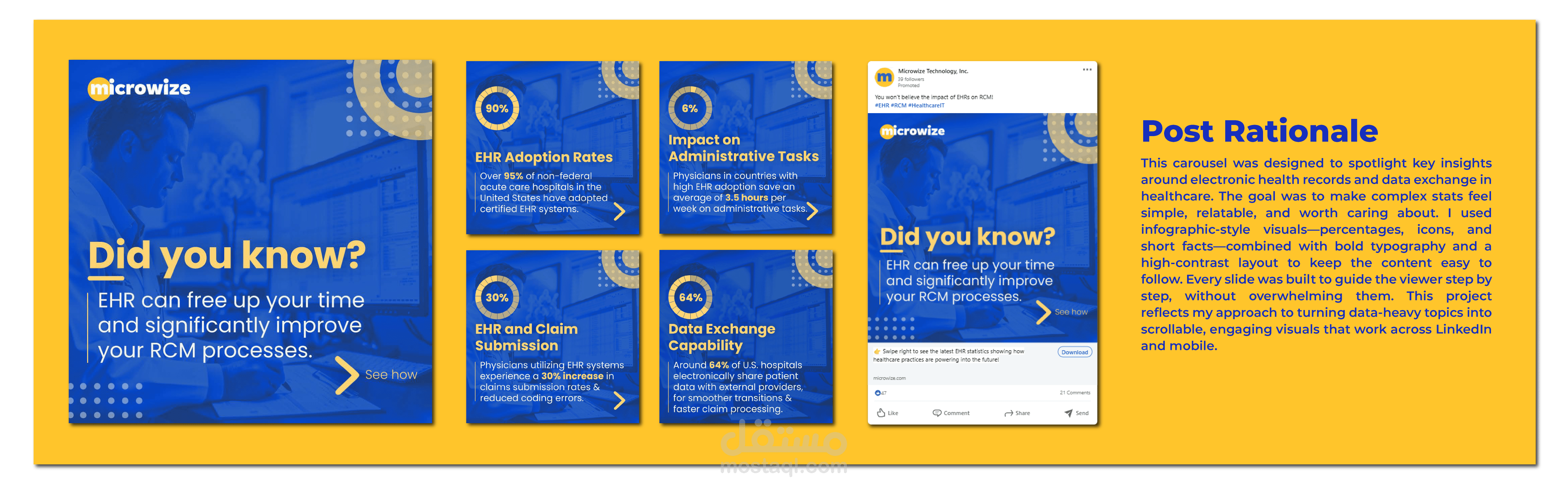 This carousel was designed to spotlight key insights around electronic health records and data exchange in healthcare. The goal was to make complex stats feel simple, relatable, and worth caring about. I used infographic-style visuals—percentages, icons, and short facts—combined with bold typography and a high-contrast layout to keep the content easy to follow. Every slide was built to guide the viewer step by step, without overwhelming them. This project reflects my approach to turning data-heavy topics into scrollable, engaging visuals that work across LinkedIn and mobile.