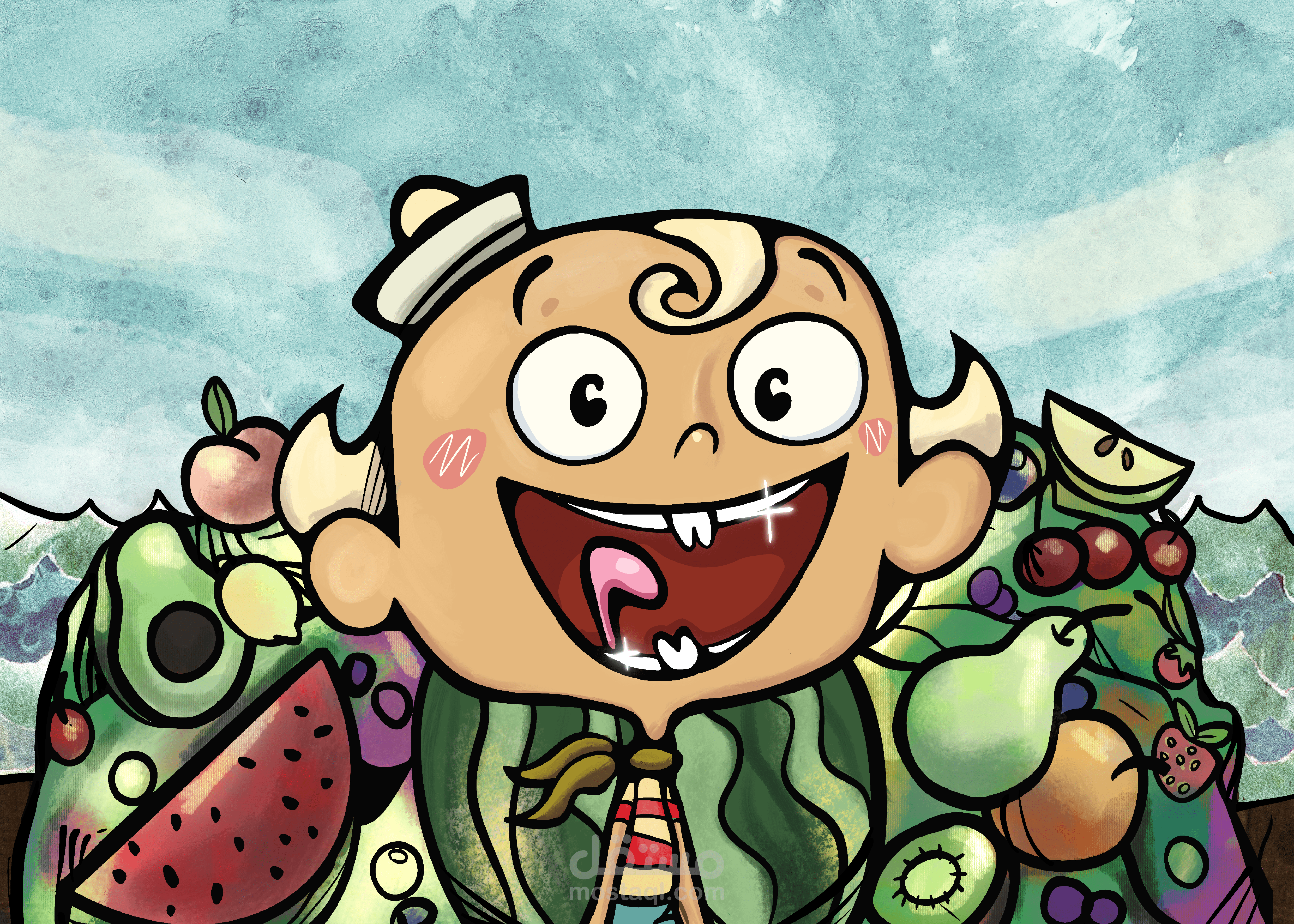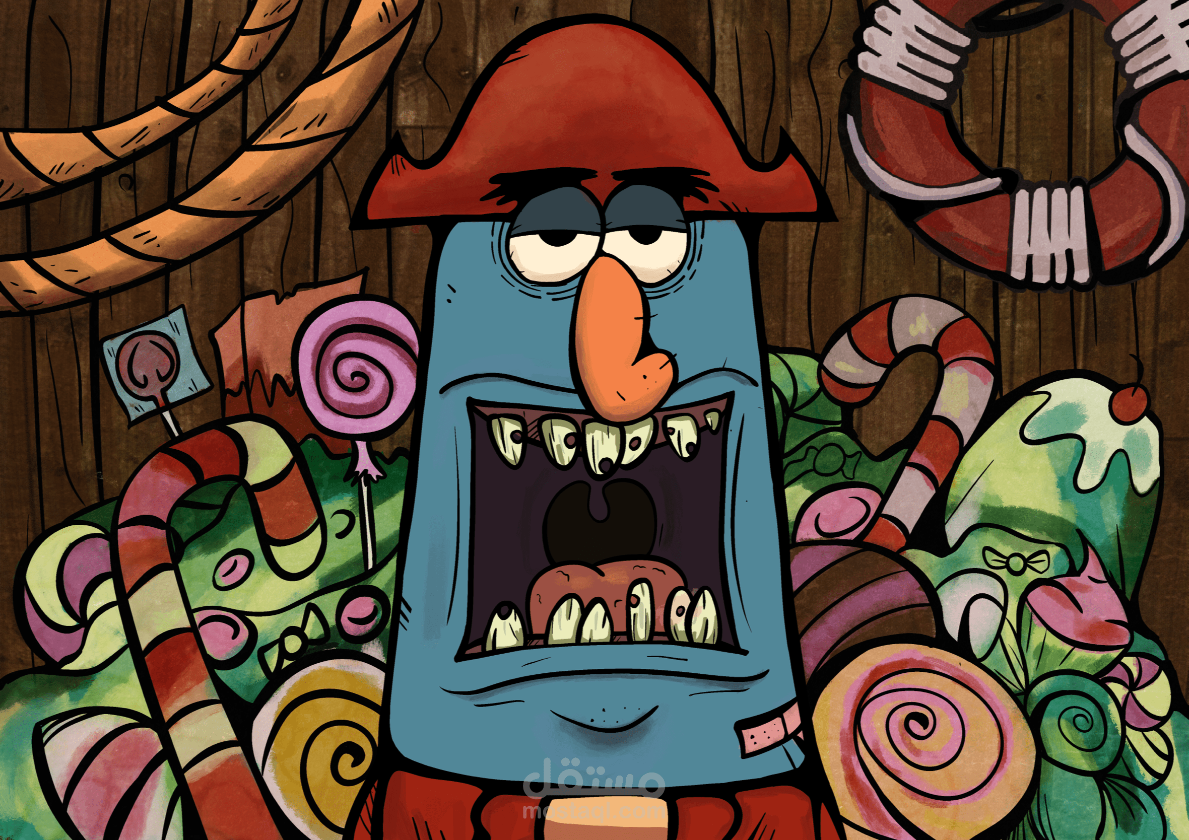 These Are 2 pages of children book about health , This project aimed to raise awareness about the harmful effects of sweets and junk food on children's teeth, advocating for their substitution with fruits for a healthier alternative To achieve this goal, the project utilized cartoon characters called "Captain K'nuckles" and "Jack" as adventurers. Captain K'nuckles represented a character who consumed sweets, resulting in unhealthy and deteriorated teeth, while Jack consumed fruits, leading to shiny and healthy teeth.