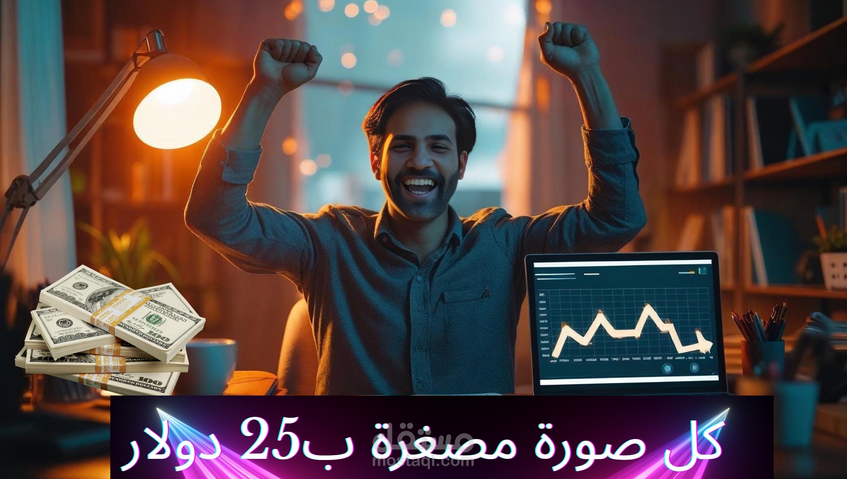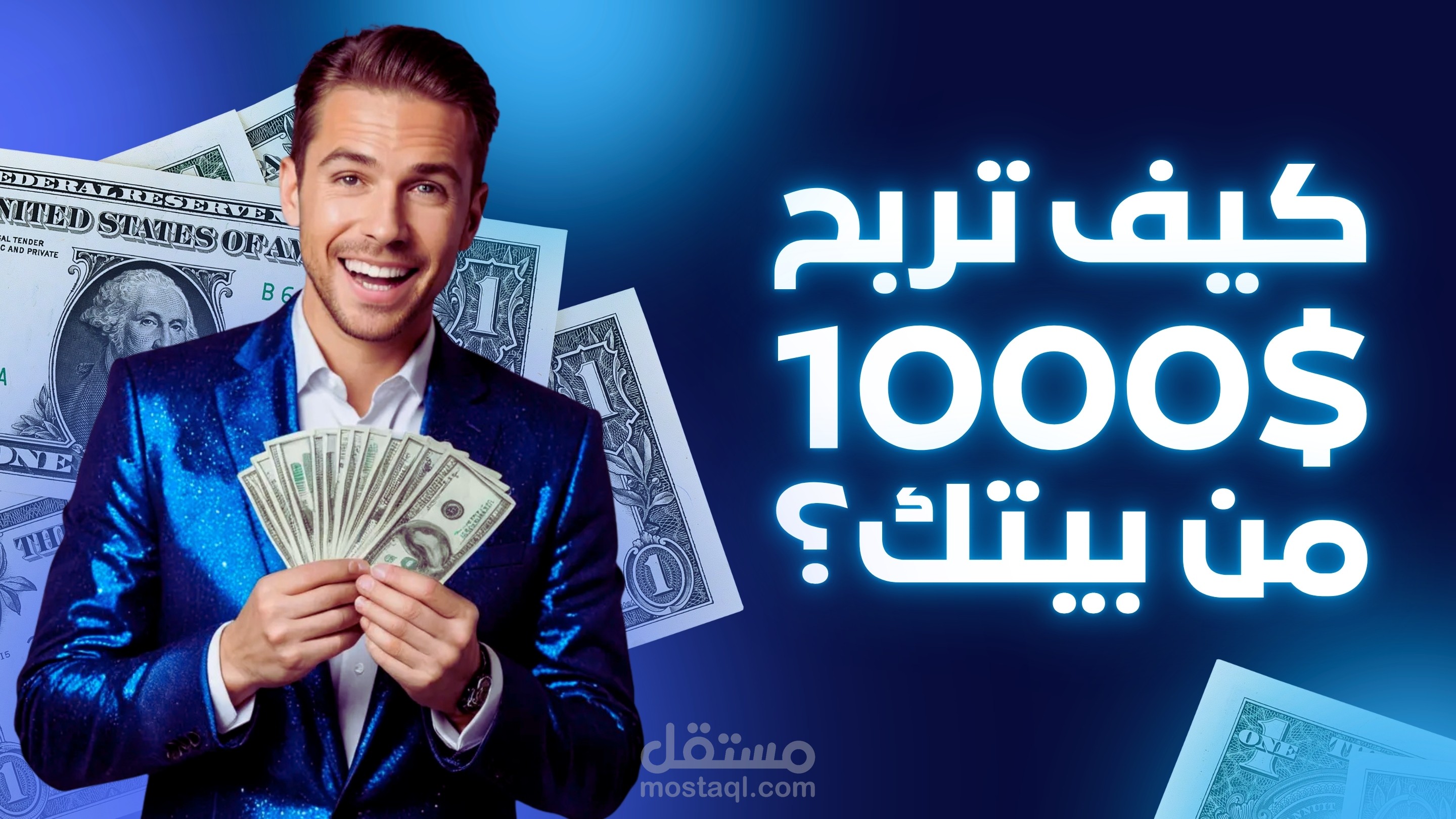 "قمت بتصميم صورة مصغّرة مميزة لفيديو على يوتيوب حول الربح من الإنترنت، ركزت فيها على الألوان الجذابة والخطوط الواضحة لشد الانتباه، مع استخدام عناصر بصرية مرتبطة بمجال العمل الحر والدخل أونلاين، بهدف زيادة نسب المشاهدة وجذب الجمهور المستهدف."