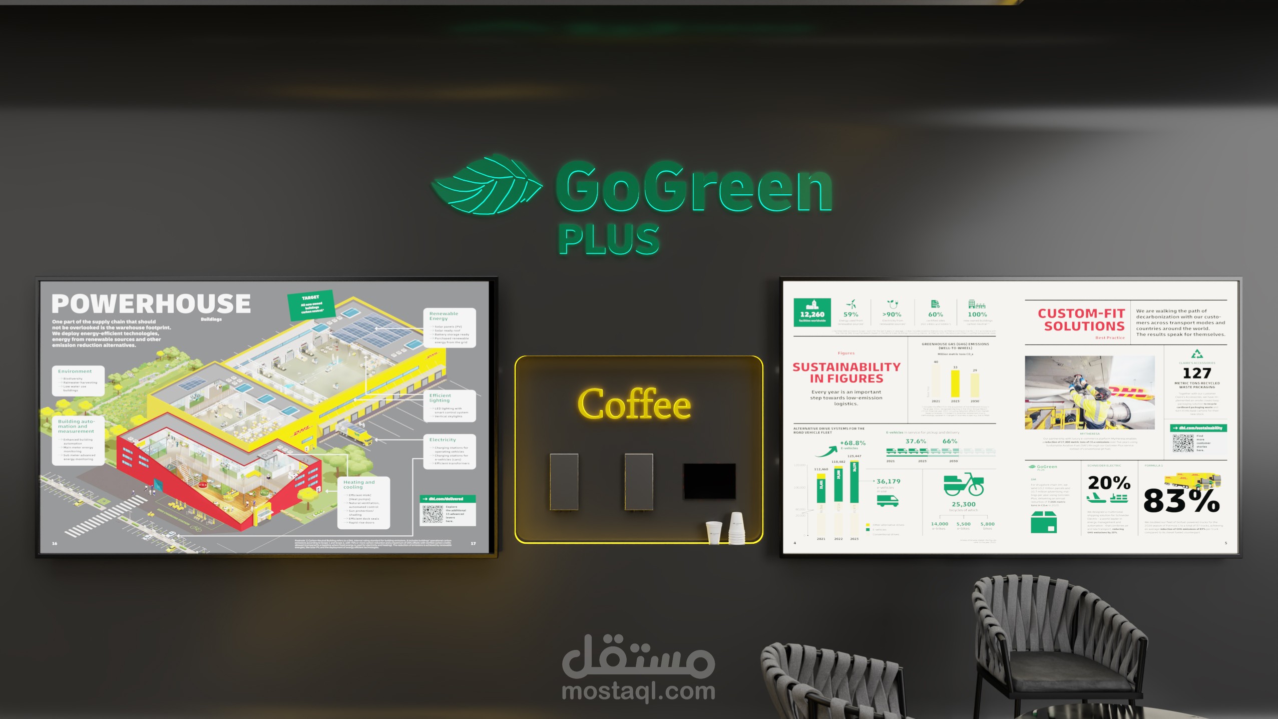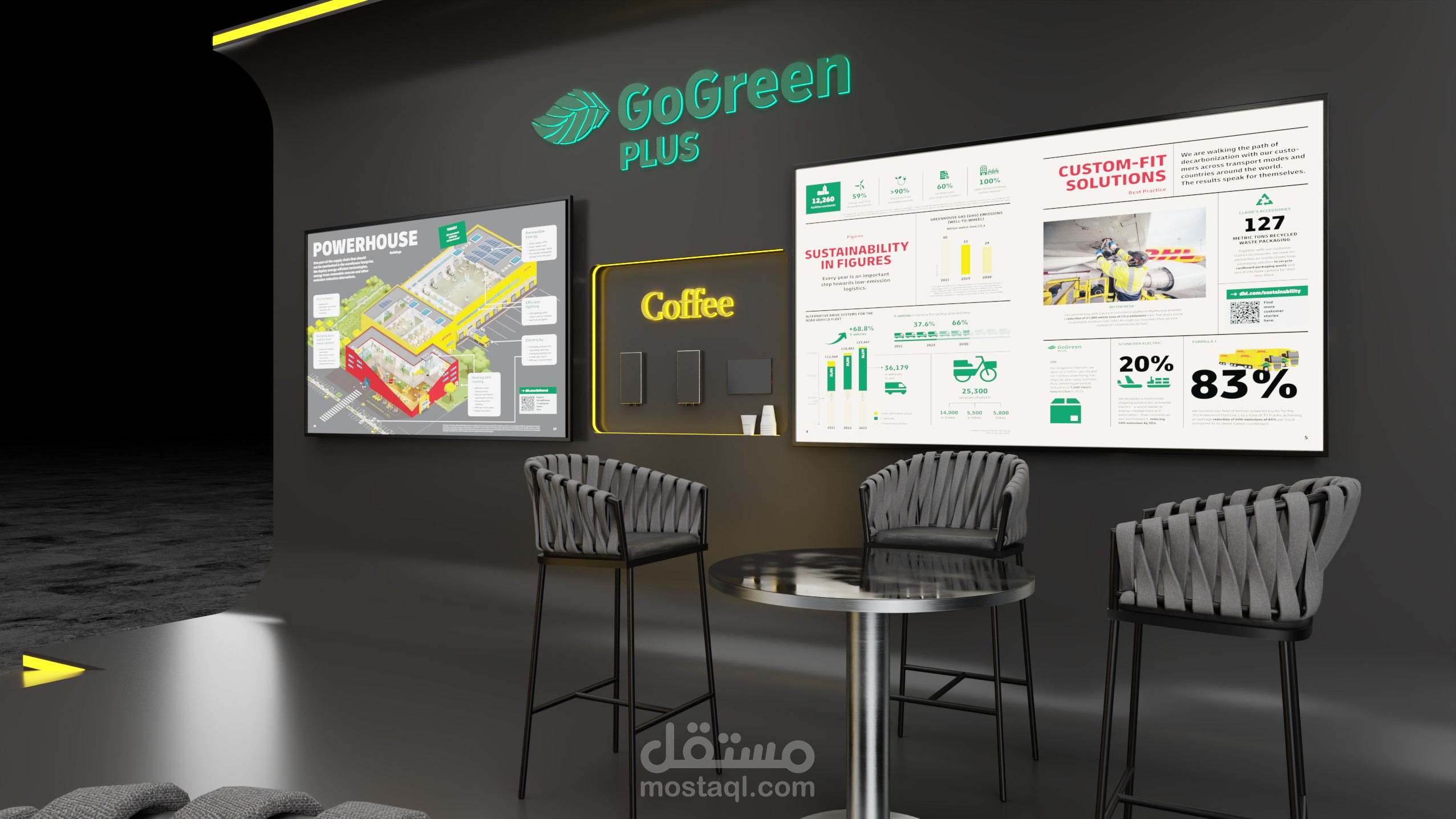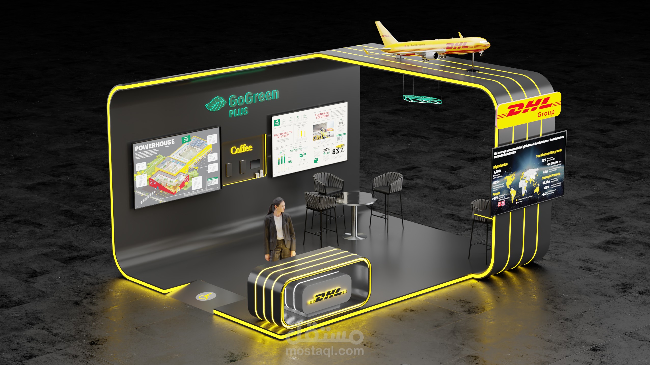 a 6m x 5m exhibition booth concept designed for DHL, blending innovation, branding, and sustainability. The design incorporates sleek curves, bold yellow LED accents, and a dynamic layout to create an engaging visitor experience.