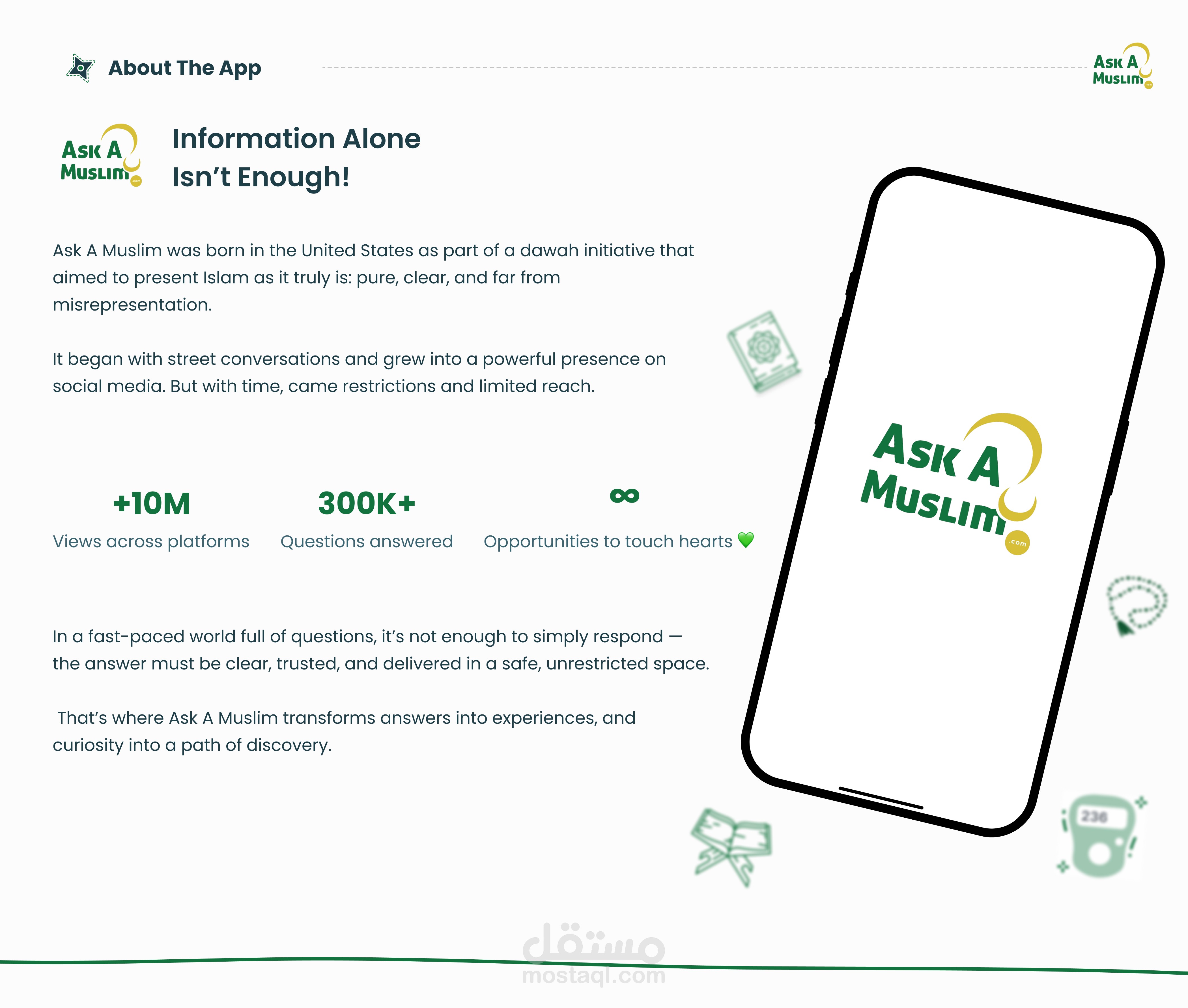 "Ask A Muslim" - مؤسسة غير ربحية ومقرها الولايات المتحدة الأمريكية، تسعى لتقديم محتوى إسلامي موثوق، وتسهيل الوصول إلى المعرفة الدينية عبر منصة رقمية.