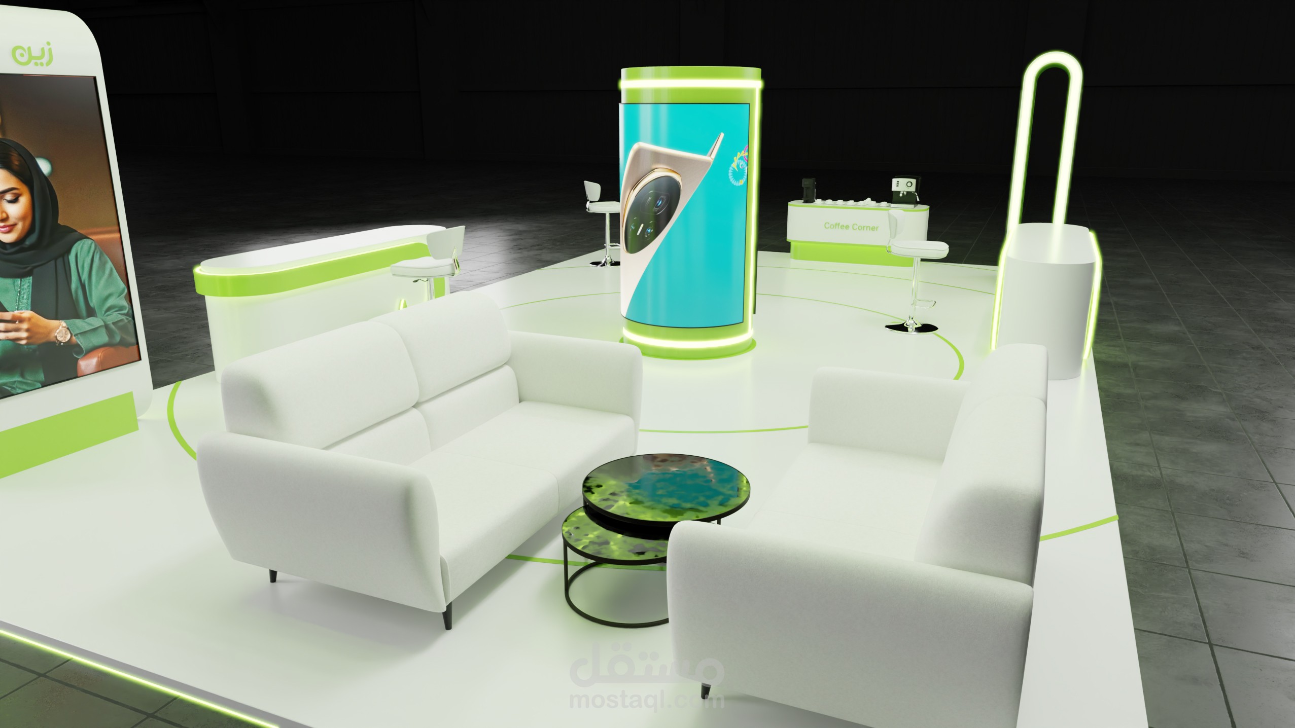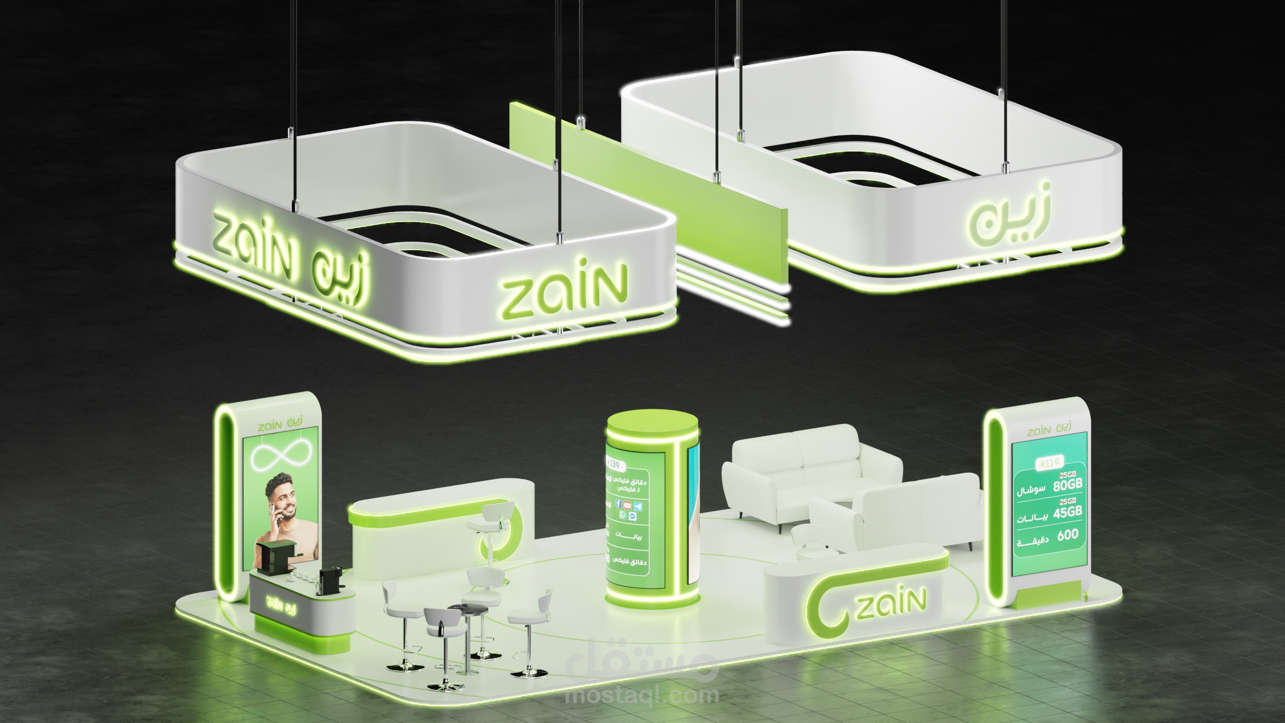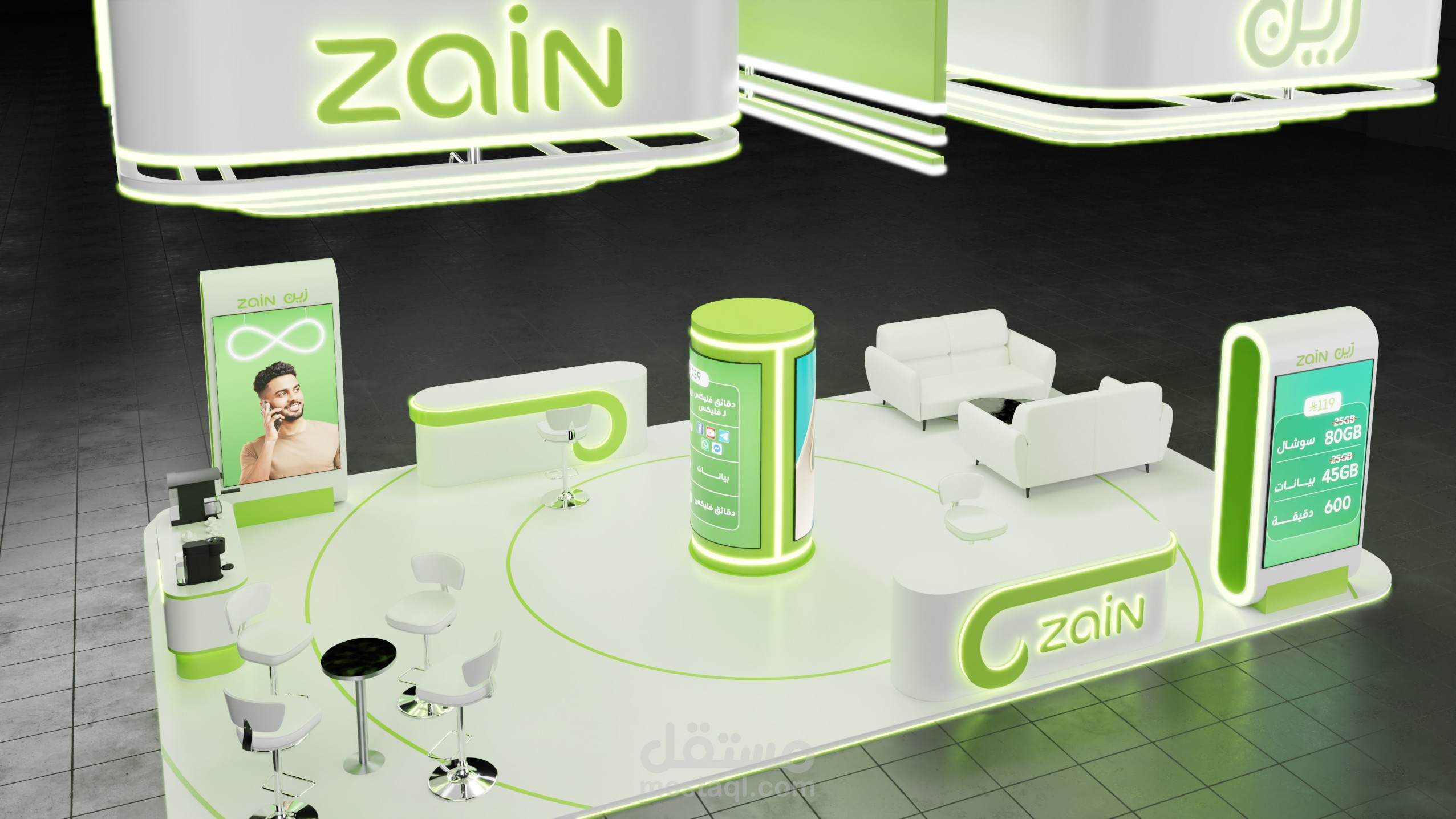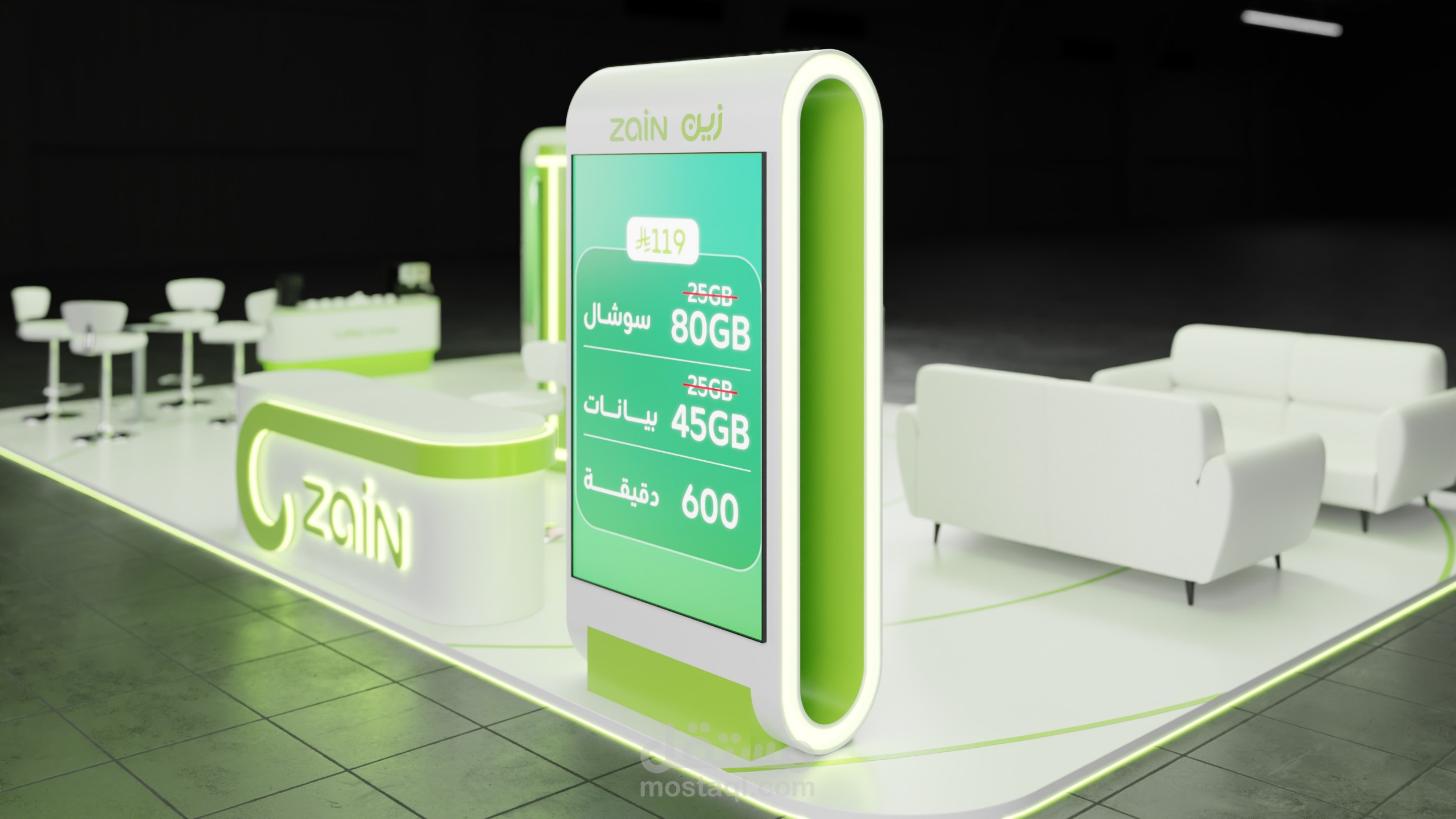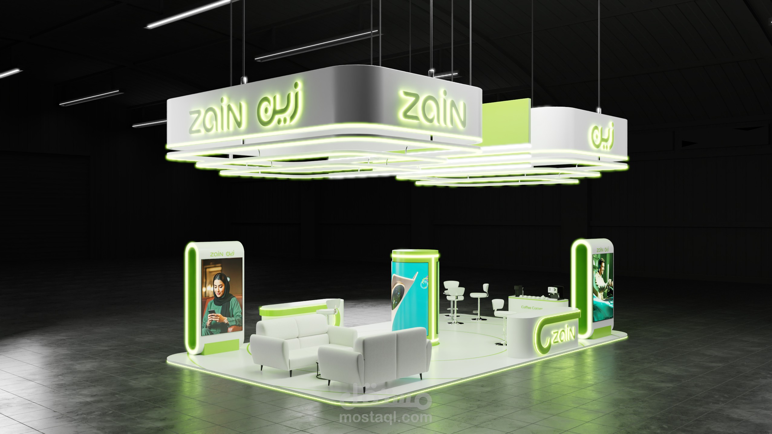 This booth was designed for Zain to reflect a modern and dynamic brand identity. The concept uses clean lines, bright lighting, and the iconic green and white colors to create a fresh and engaging atmosphere. A floating illuminated ceiling with the Zain logo ensures high visibility, while interactive digital screens and a central LED pillar highlight the company’s offers and innovative spirit. The booth also includes a minimal lounge area and a coffee corner, providing both comfort and hospitality. The design blends aesthetics with functionality, delivering an immersive and memorable experience for visitors.