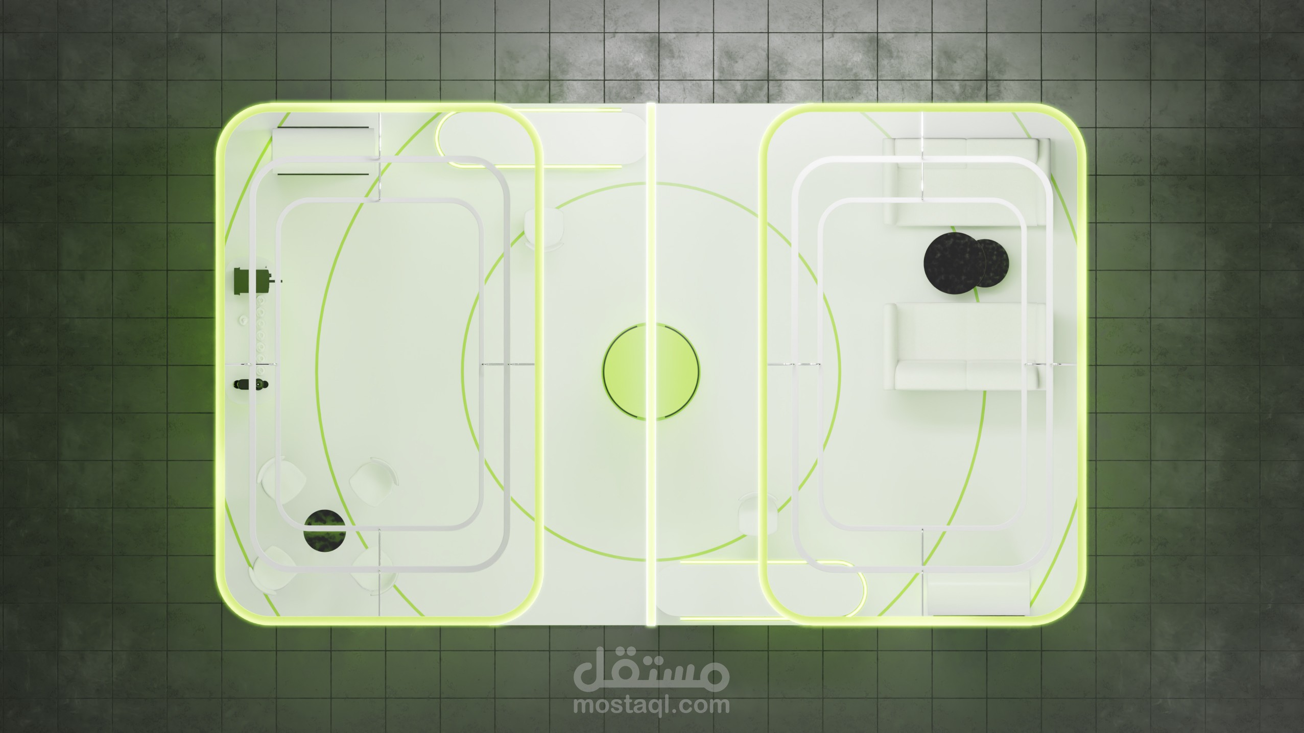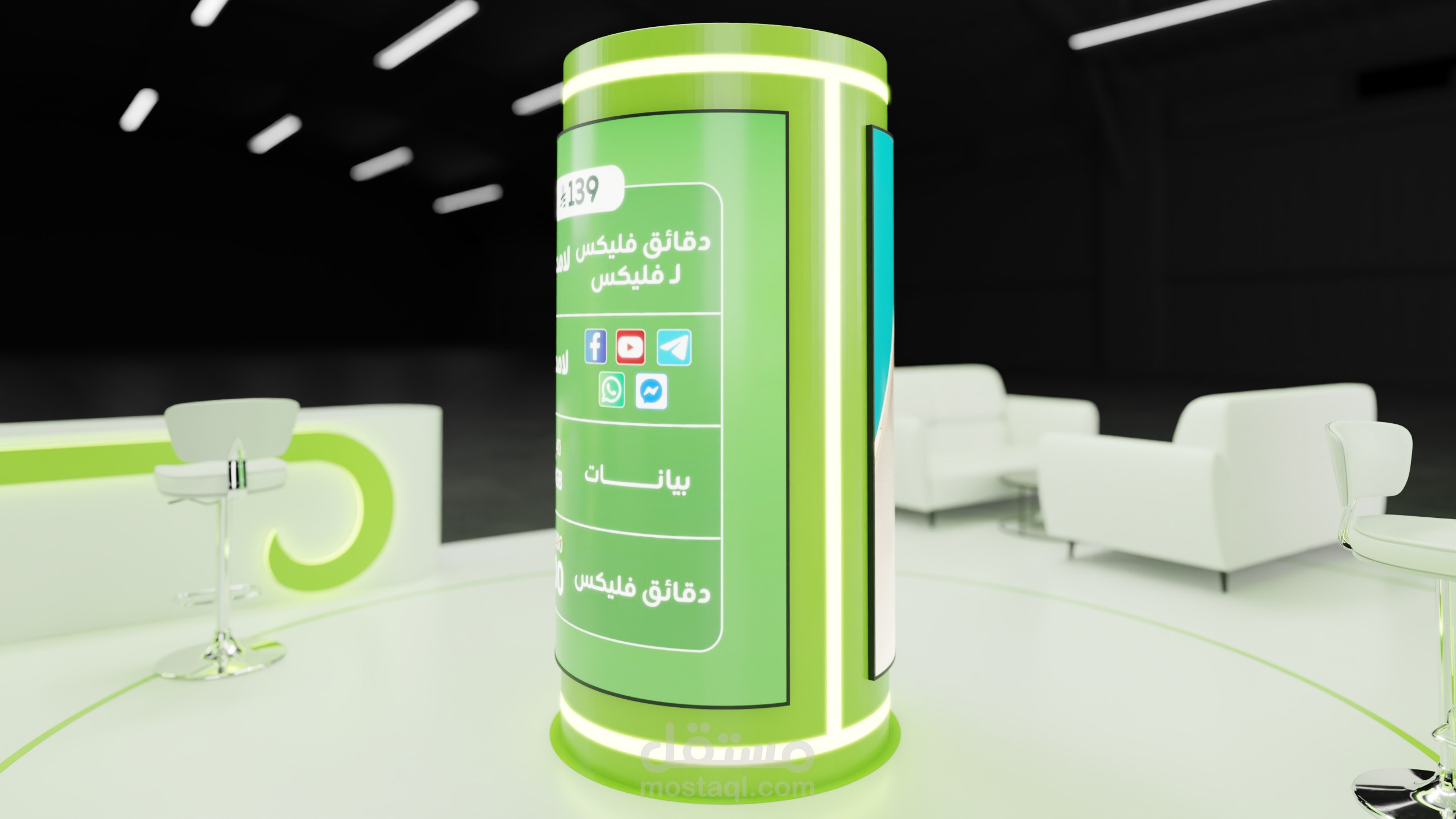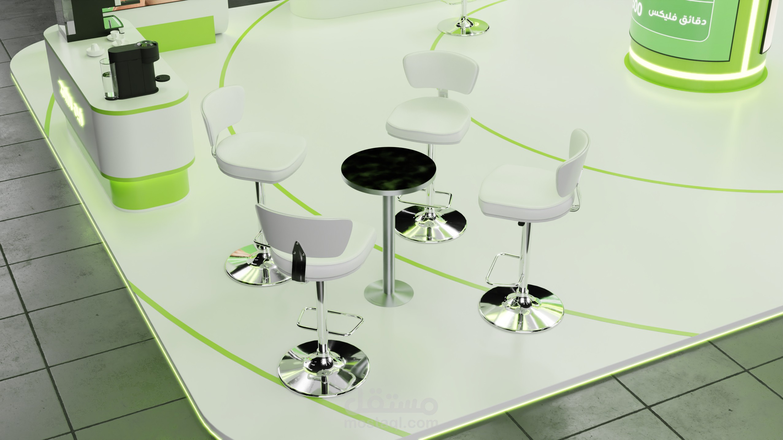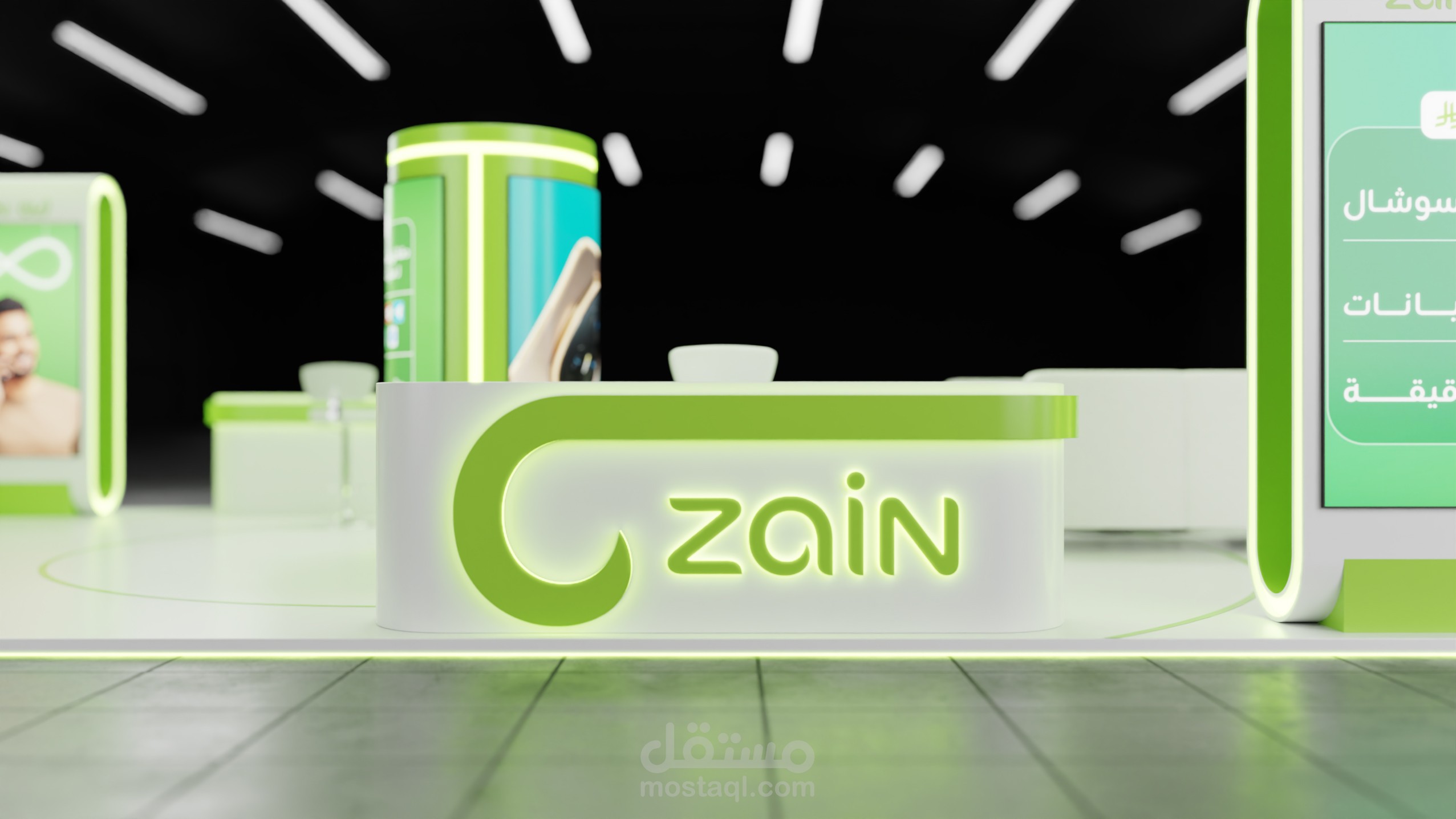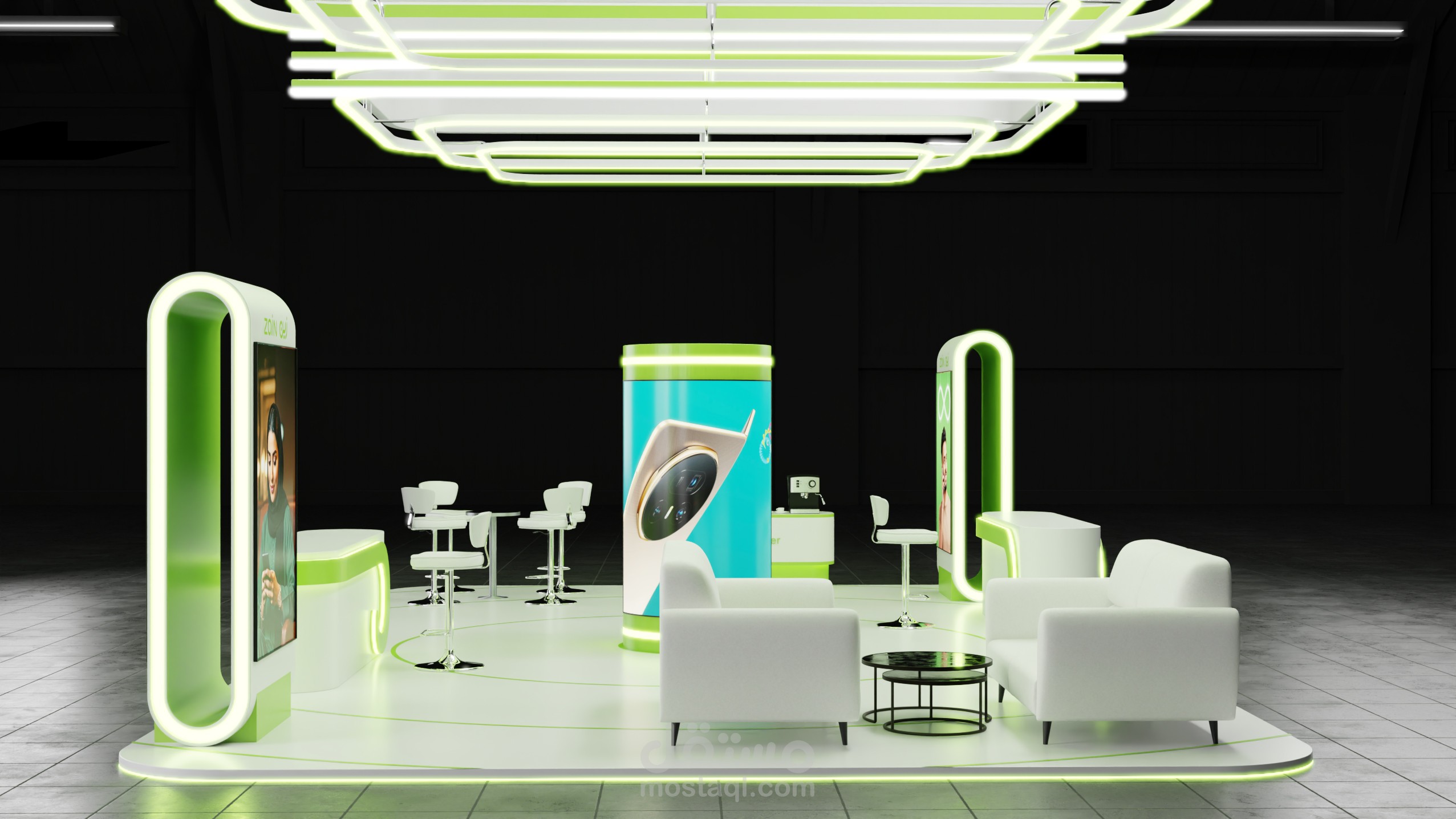 This booth was designed for Zain to reflect a modern and dynamic brand identity. The concept uses clean lines, bright lighting, and the iconic green and white colors to create a fresh and engaging atmosphere. A floating illuminated ceiling with the Zain logo ensures high visibility, while interactive digital screens and a central LED pillar highlight the company’s offers and innovative spirit. The booth also includes a minimal lounge area and a coffee corner, providing both comfort and hospitality. The design blends aesthetics with functionality, delivering an immersive and memorable experience for visitors.