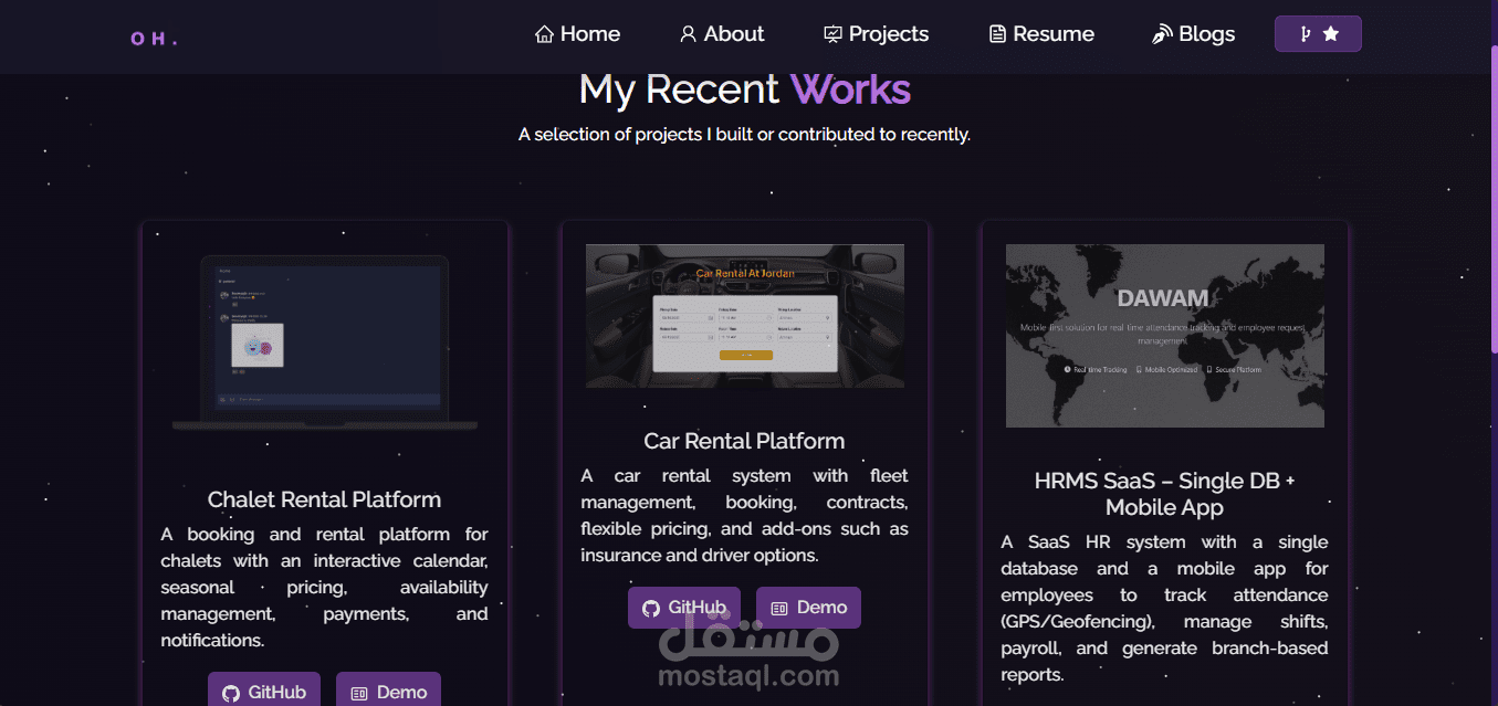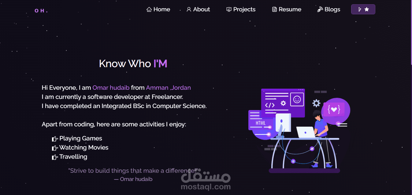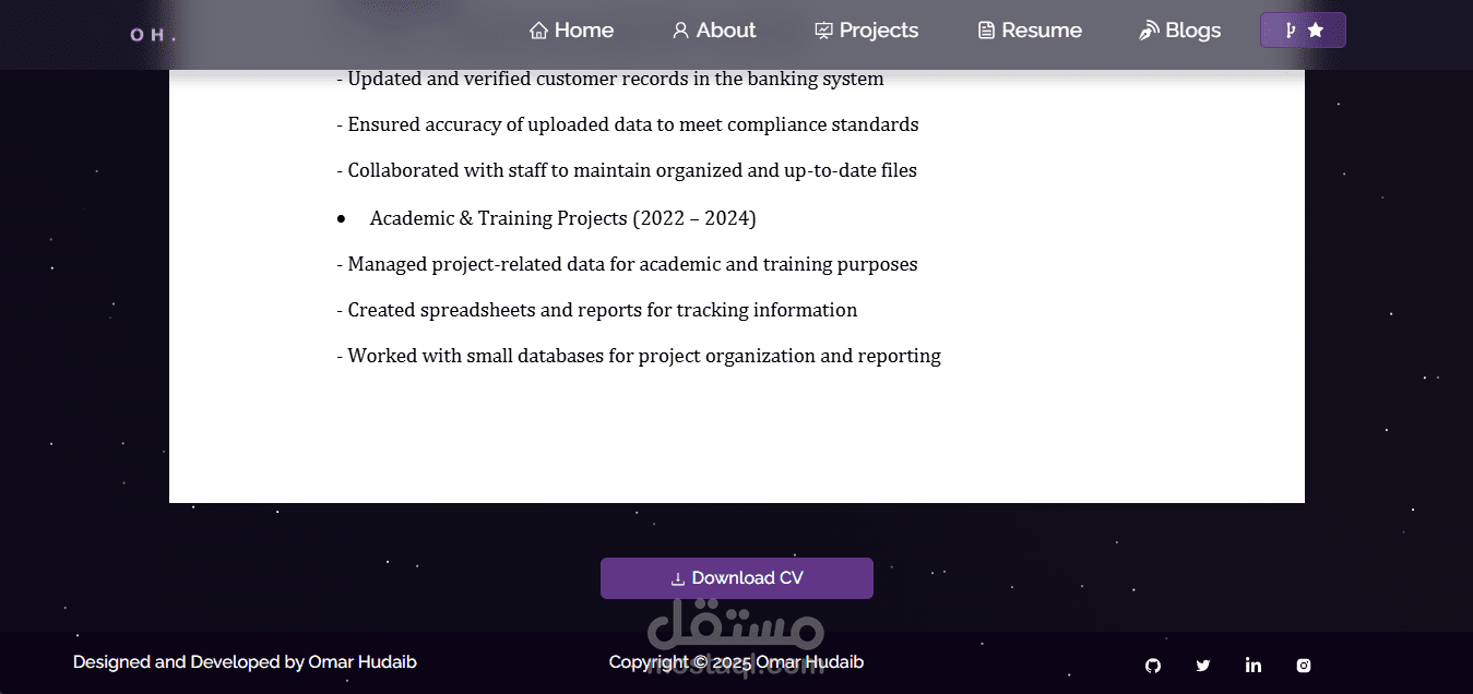 يتضمن أقسام ديناميكية مثل: من أنا، المشاريع، السيرة الذاتية، والتواصل، مع مؤثرات ورسوم متحركة وخلفية تفاعلية.
