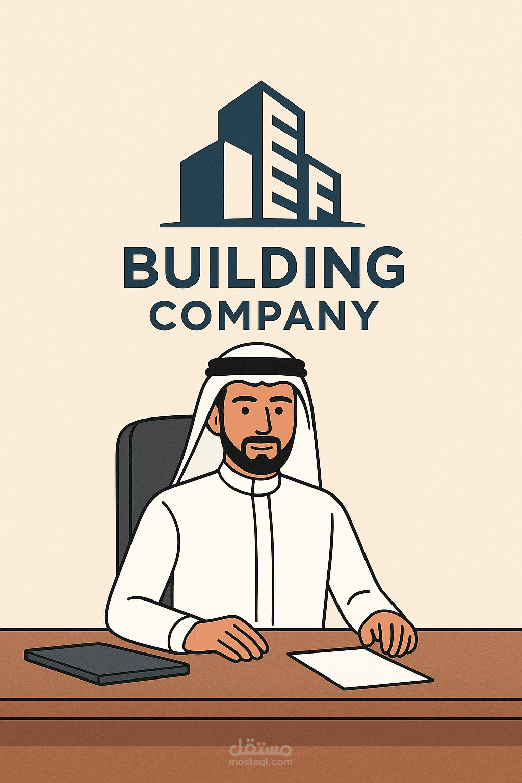 قمت بتصميم رسم رقمي ثنائي الأبعاد لرجل بالزي الخليجي التقليدي يجلس خلف مكتب أنيق، مع وضع شعار شركة البناء في الخلفية.
