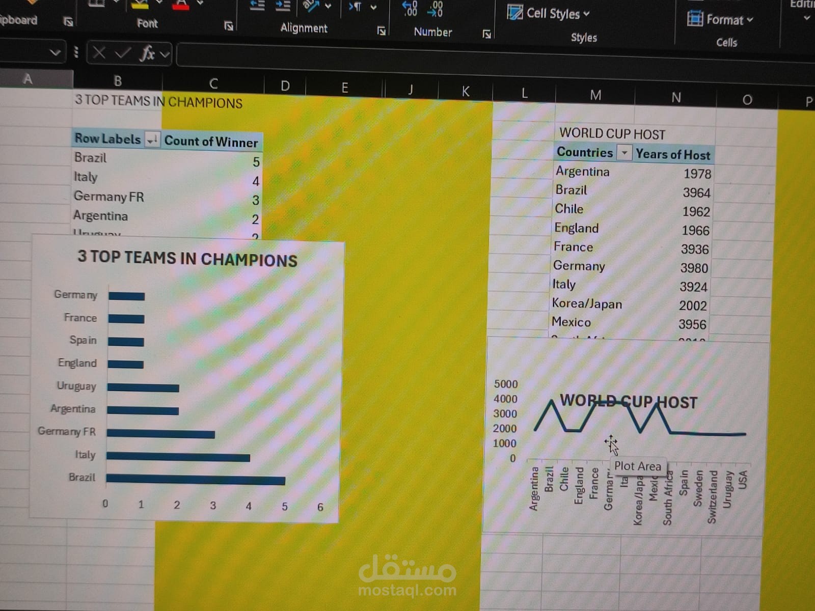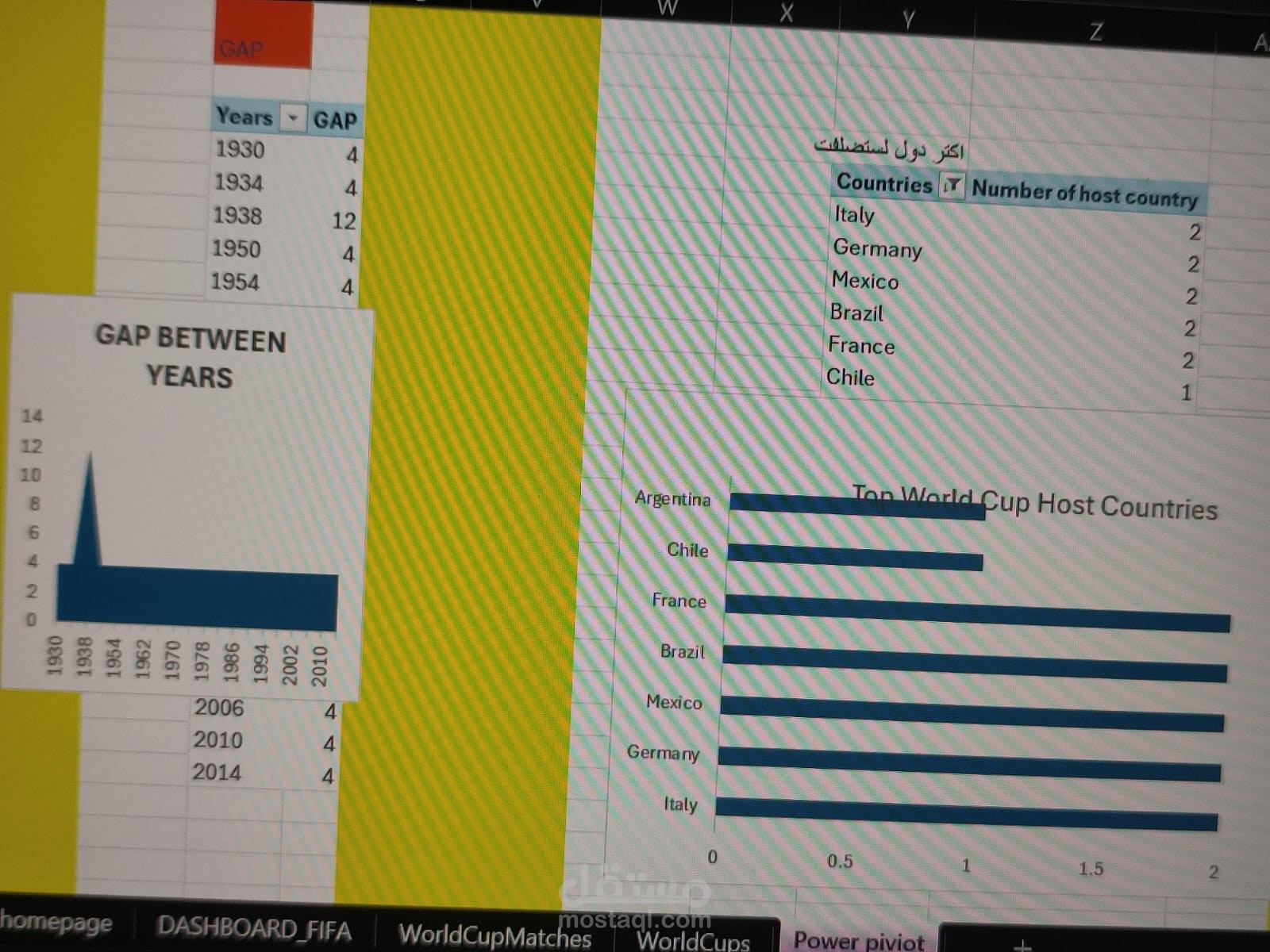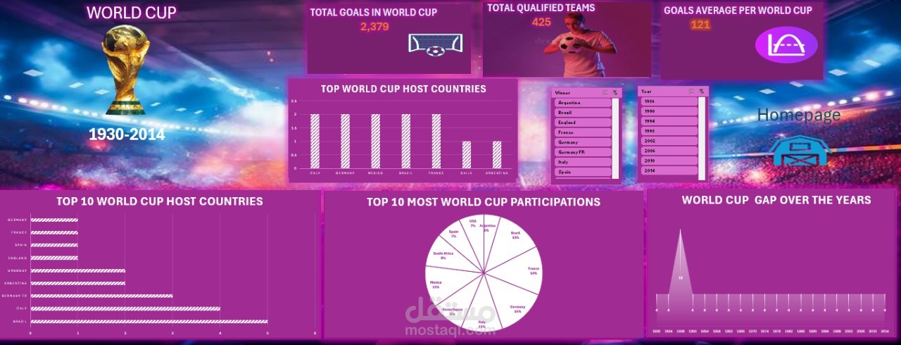 مشروع لتحليل بيانات كأس العالم من 1930 حتى 2014 باستخدام Excel, Power Query, Power Pivot. اللوحة التفاعلية بتعرض إحصائيات أساسية زي عدد الأهداف، عدد الفرق المشاركة، متوسط الأهداف، أكتر الدول استضافة، أكتر المنتخبات مشاركة، وتحليل زمني للفجوات بين البطولات. الهدف من المشروع هو تحويل البيانات الخام لرؤى بصرية واضحة تدعم الفهم والتحليل.
