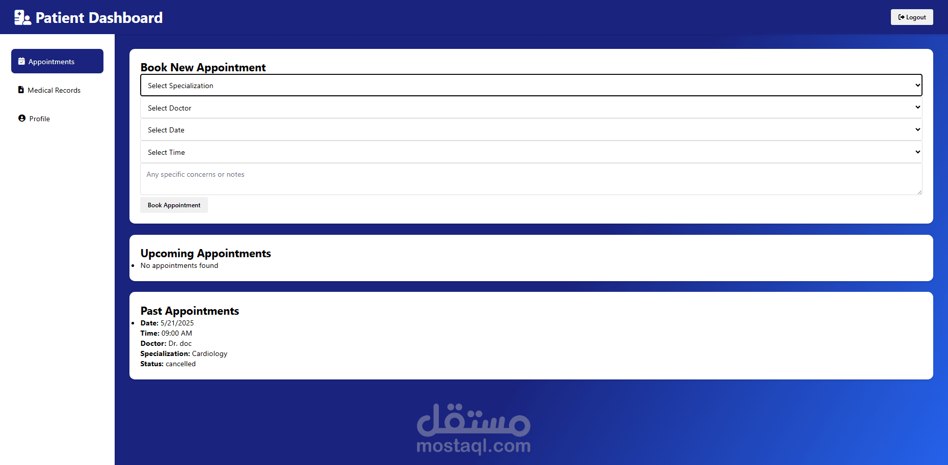 حجز المواعيد: بعد تسجيل الدخول، يستطيع المريض اختيار الطبيب أو التخصص المناسب وحجز الموعد بسهولة.