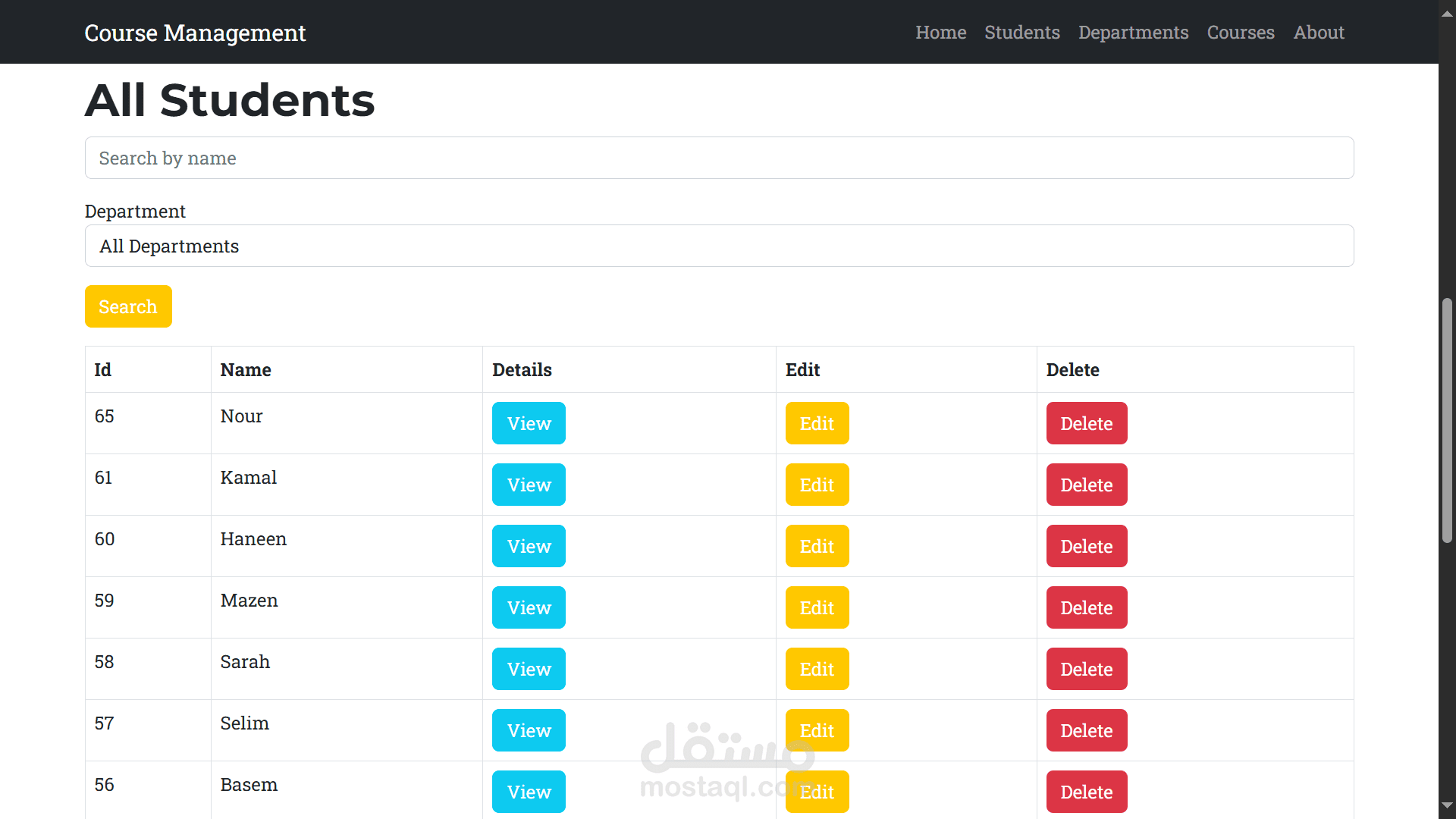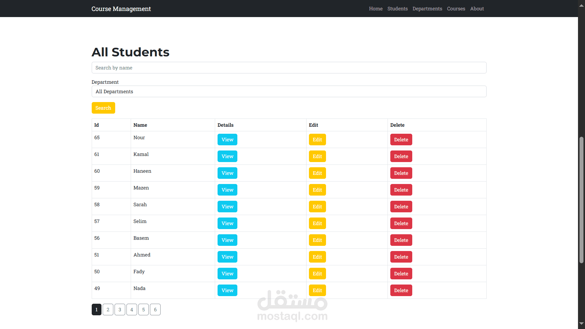 إدارة الطلاب (Students): جدول شامل للطلاب مع خاصية البحث بالاسم، التصفية حسب القسم، والتنقل بين الصفحات، مع أزرار View، Edit، و Delete.