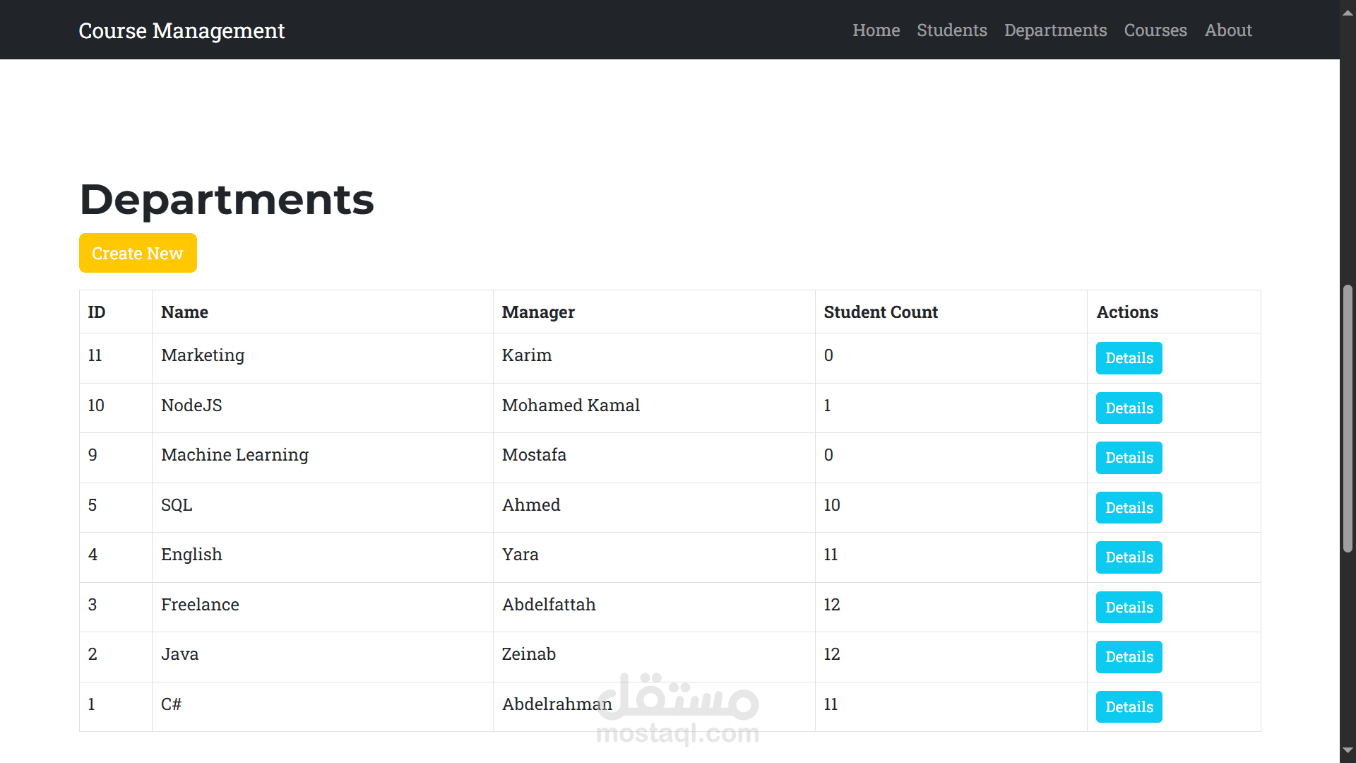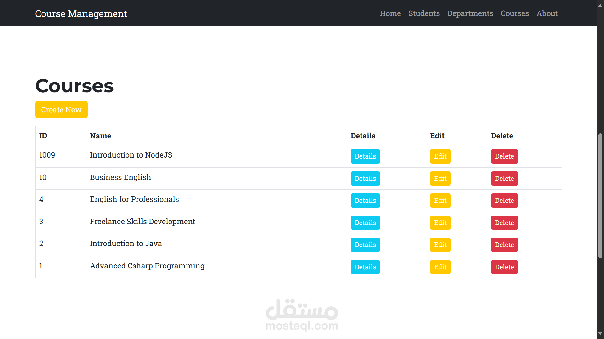 إدارة الدورات (Courses): عرض قائمة الدورات في جدول منظم مع أزرار Details، Edit، و Delete لكل دورة، بالإضافة لزر Create New.