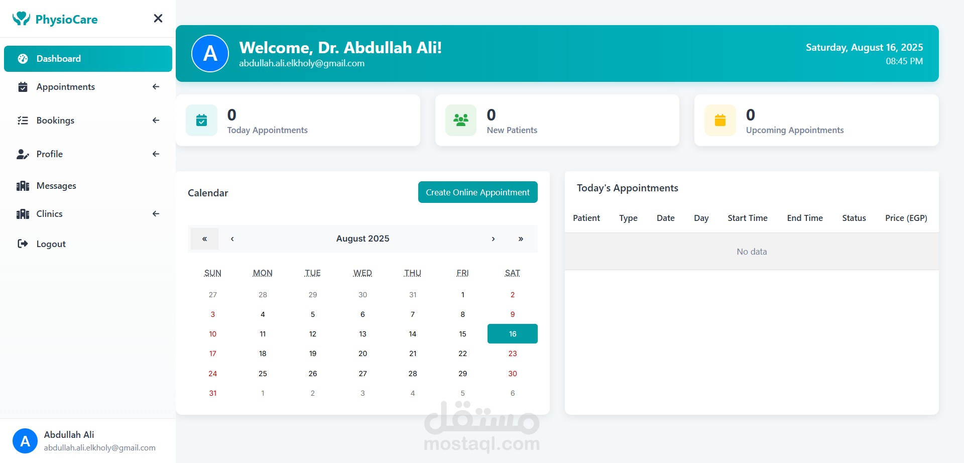الداشبورد الخاص بالدكتور يحتوي علي Appointments , Bookings حيث يمكنه من ادارة المواعيد والحجوزات الخاصه به واضافه clinics خاصه به في اكتر من بلد مع اتاحه تغيير الباسورد والصورة وعمل real time chat app بين المريض والدكتور