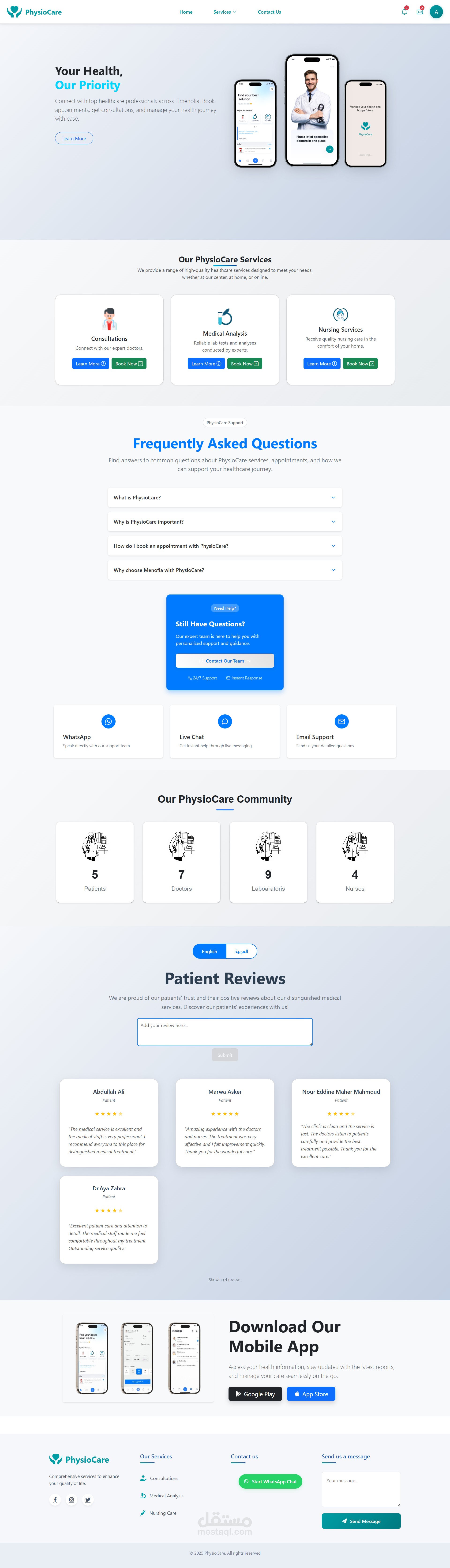 تم تصميم صفحة Patient لموقع PhysioCare لتكون واجهة سهلة الاستخدام ومتكاملة للمرضى من أجل إدارة رحلتهم الصحية عبر الإنترنت.