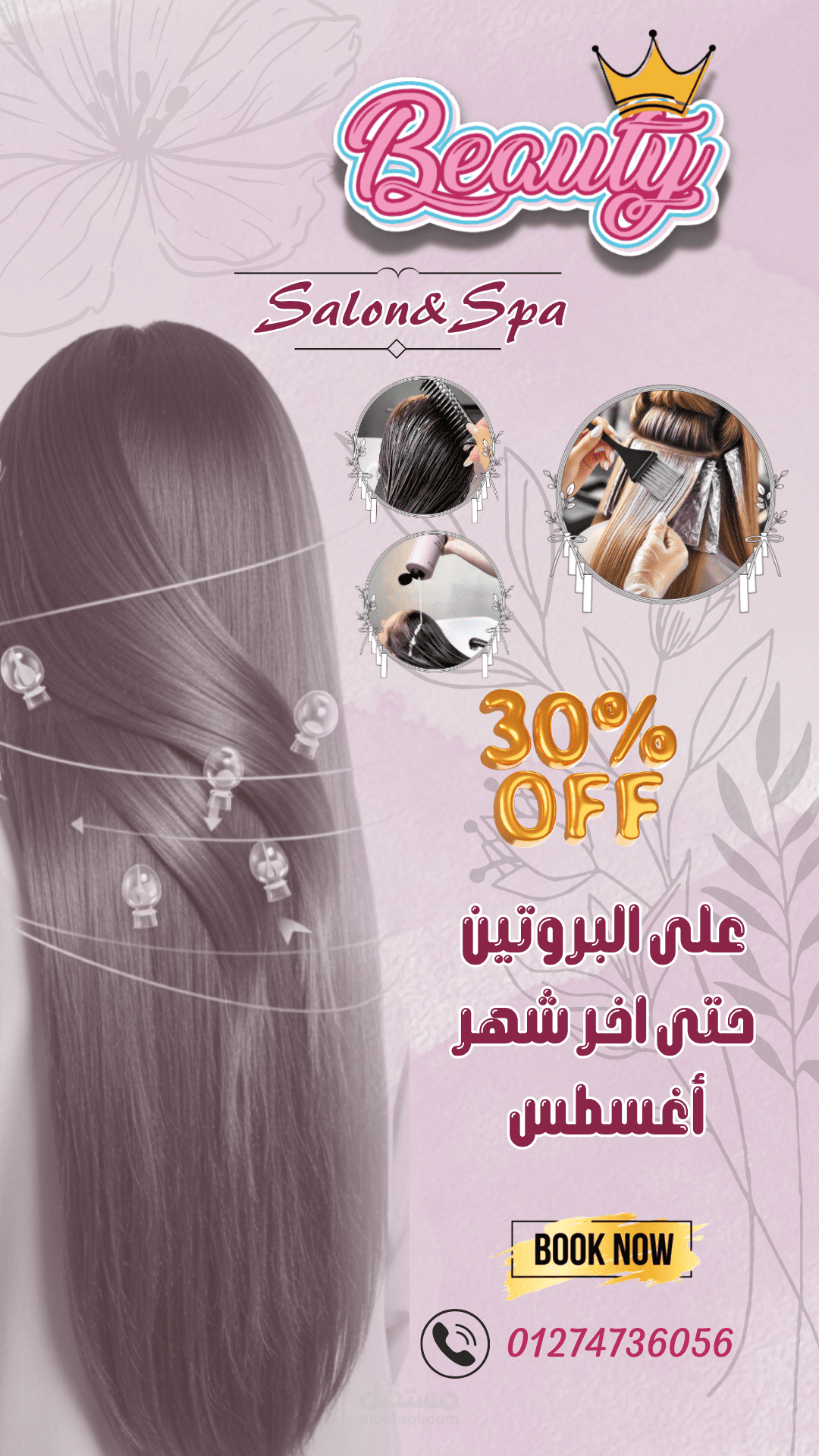تم تصميم إعلان دعائي احترافي لصالح مركز "Beauty Salon & Spa"، ويُروّج الإعلان لعرض خاص على جلسات البروتين للشعر بنسبة خصم تصل إلى 30%، ساري حتى نهاية شهر أغسطس.
