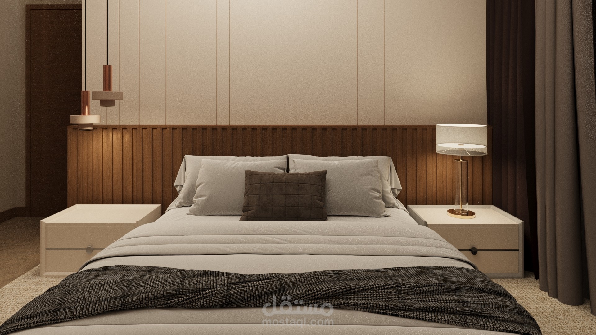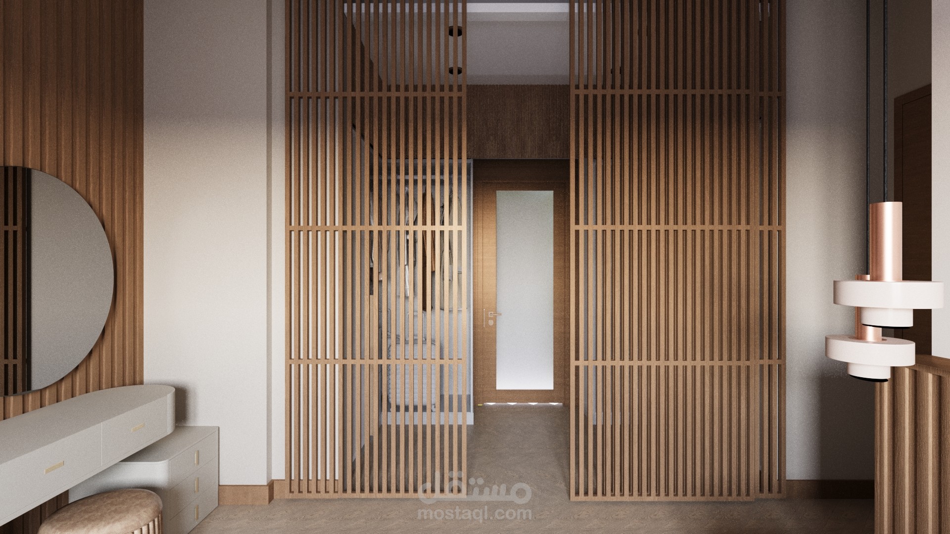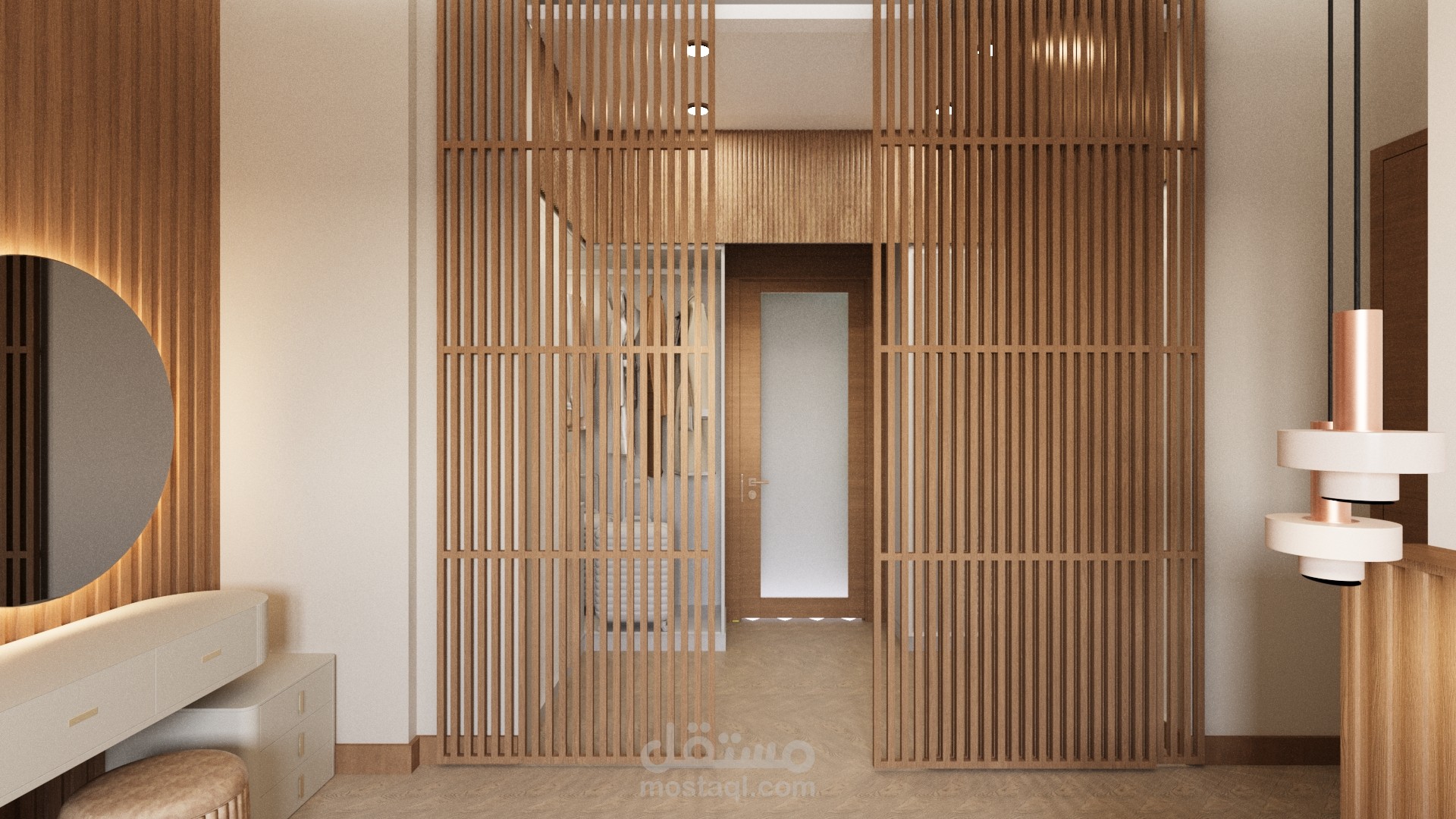 مشروع تصميم داخلي شامل لغرفة النوم الرئيسية في فيلا سكنية، يشمل تخصيص مساحة متكاملة لغرفة تغيير الملابس ، بأسلوب عصري يعكس الفخامة والبساطة معًا.