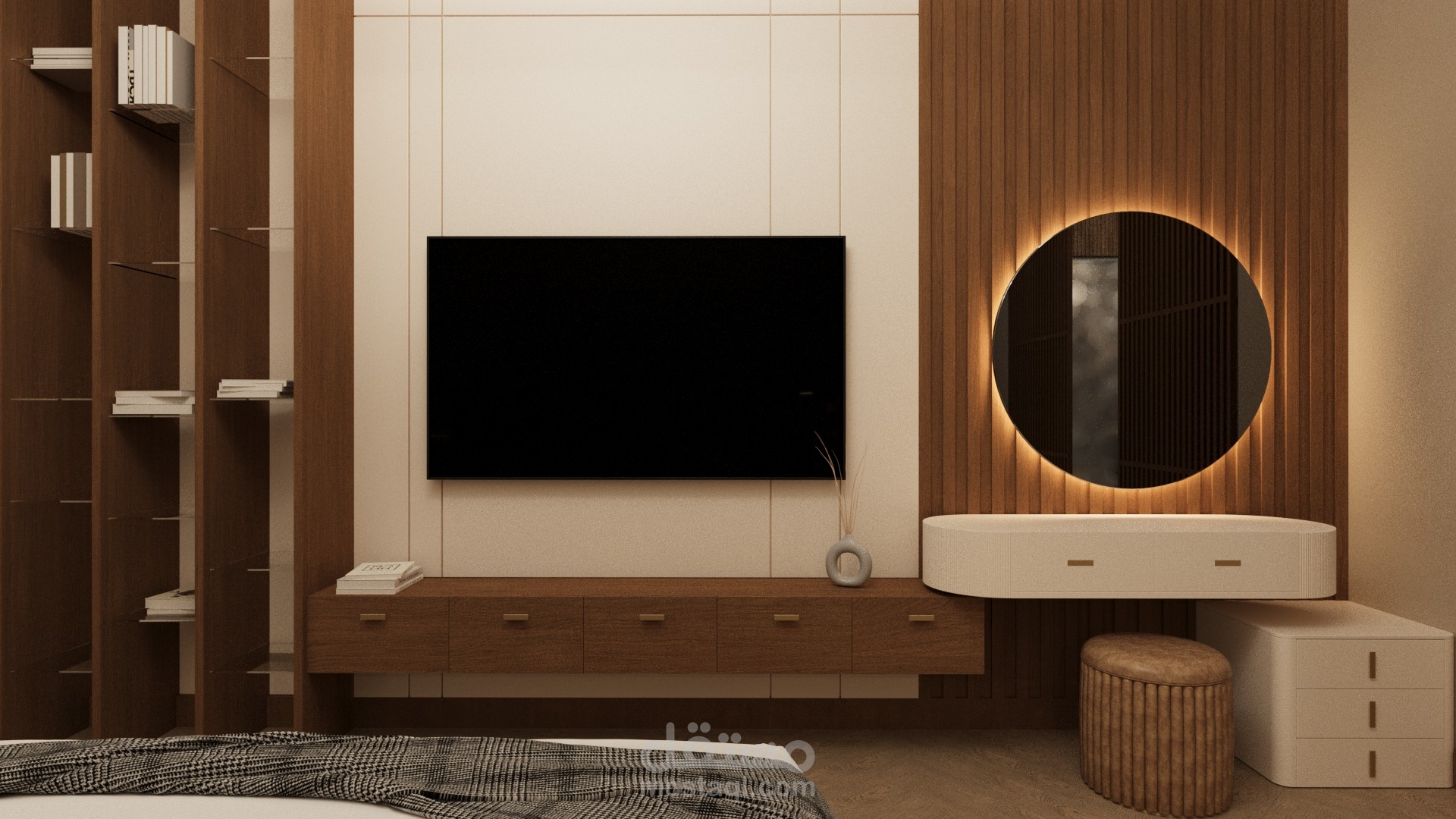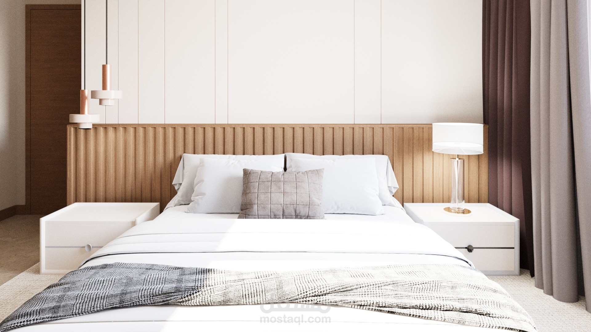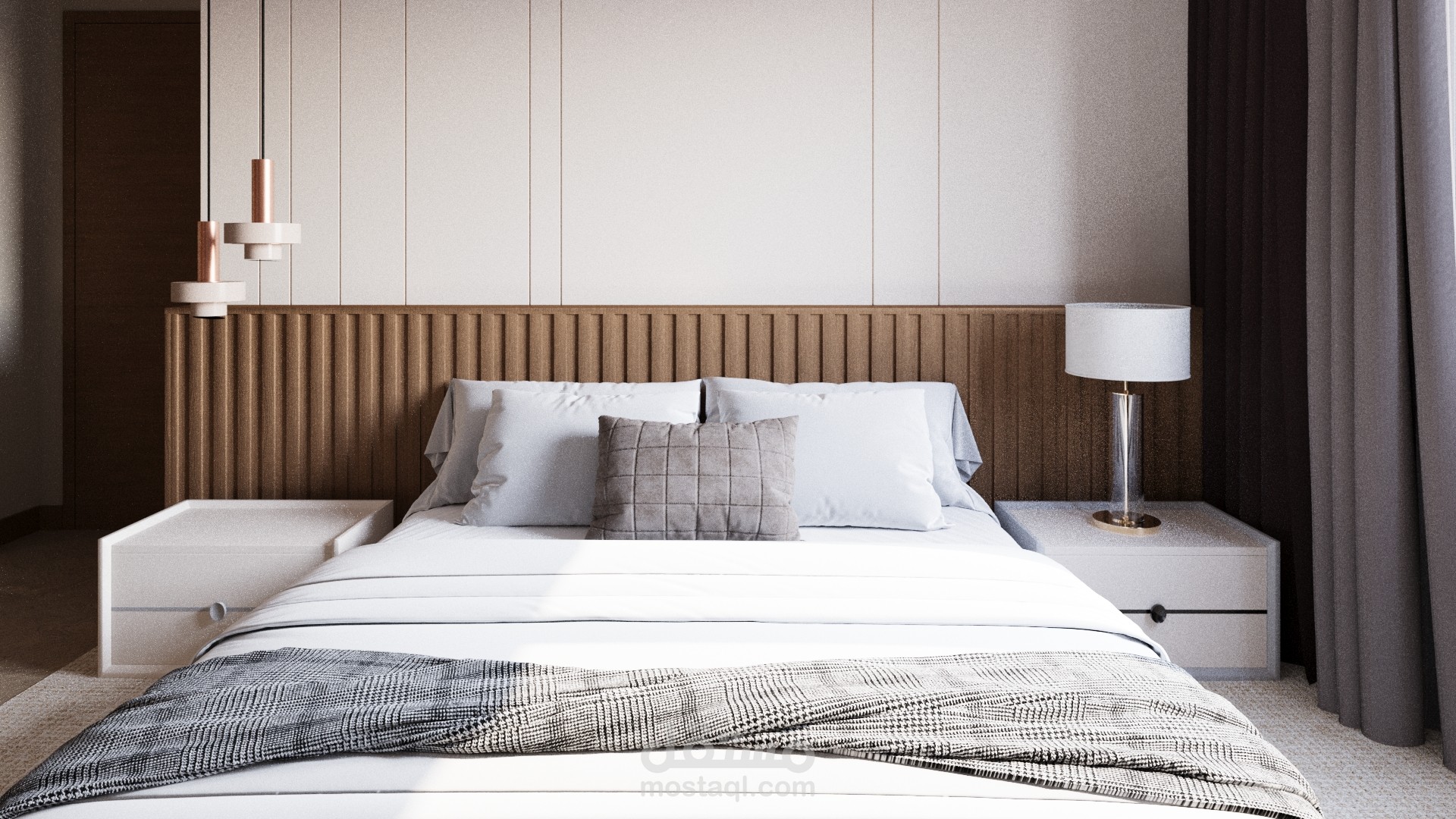 مشروع تصميم داخلي شامل لغرفة النوم الرئيسية في فيلا سكنية، يشمل تخصيص مساحة متكاملة لغرفة تغيير الملابس ، بأسلوب عصري يعكس الفخامة والبساطة معًا.