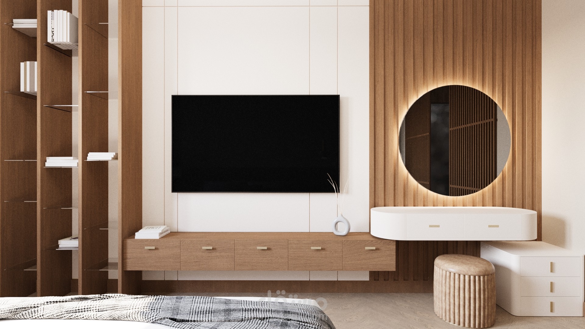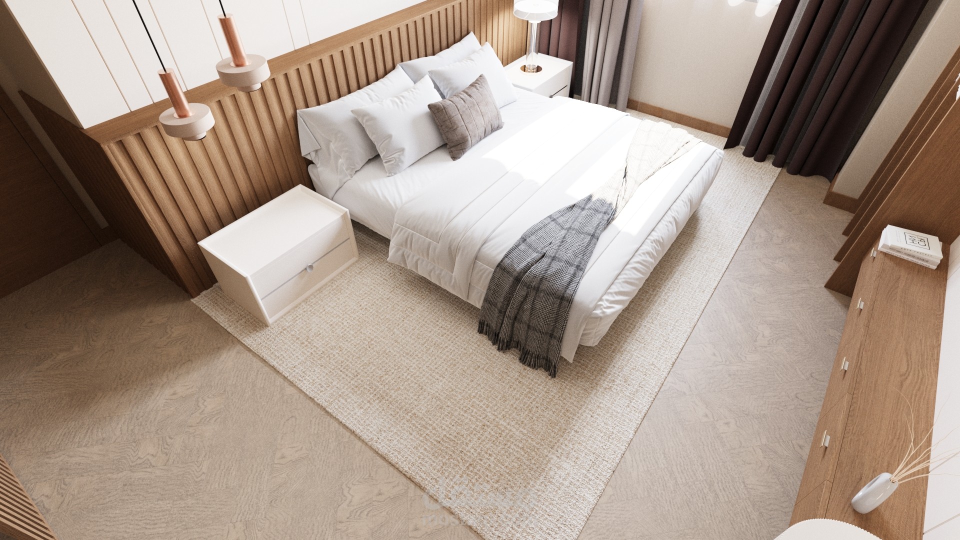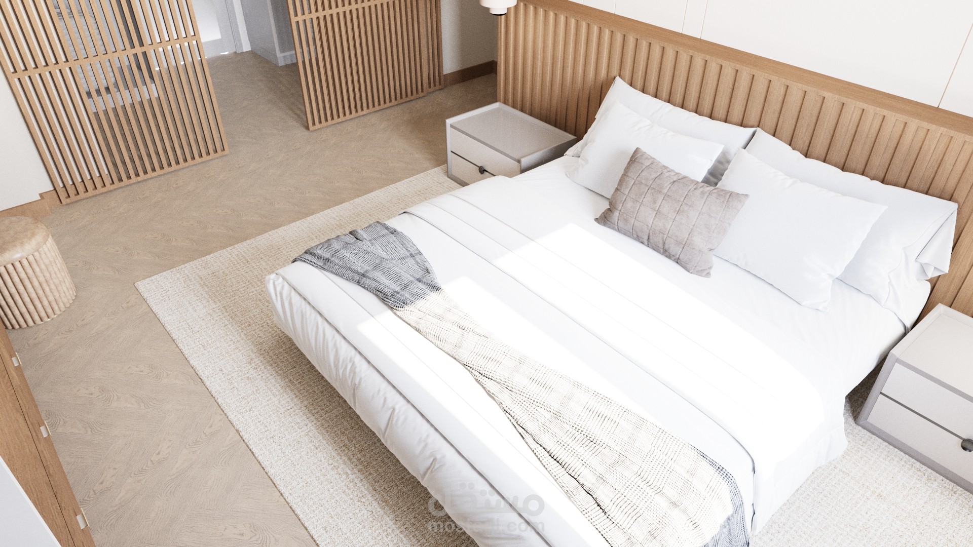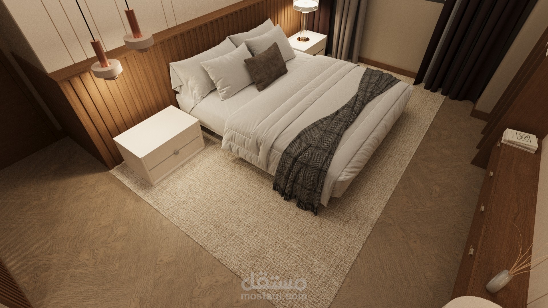 تم تنفيذ التصميم وفق أحدث معايير الراحة والوظيفية، مع التركيز على توزيع المساحات بشكل ذكي لتعظيم الاستخدام وتحقيق تدفق سلس بين مناطق الغرفة. اعتمدنا على خطوط نظيفة، وألوان محايدة مدعومة بدرجات من الرمادي والبيج الدافئ، مع لمسات من الخشب الطبيعي لإضفاء دفء وفخامة عصرية.