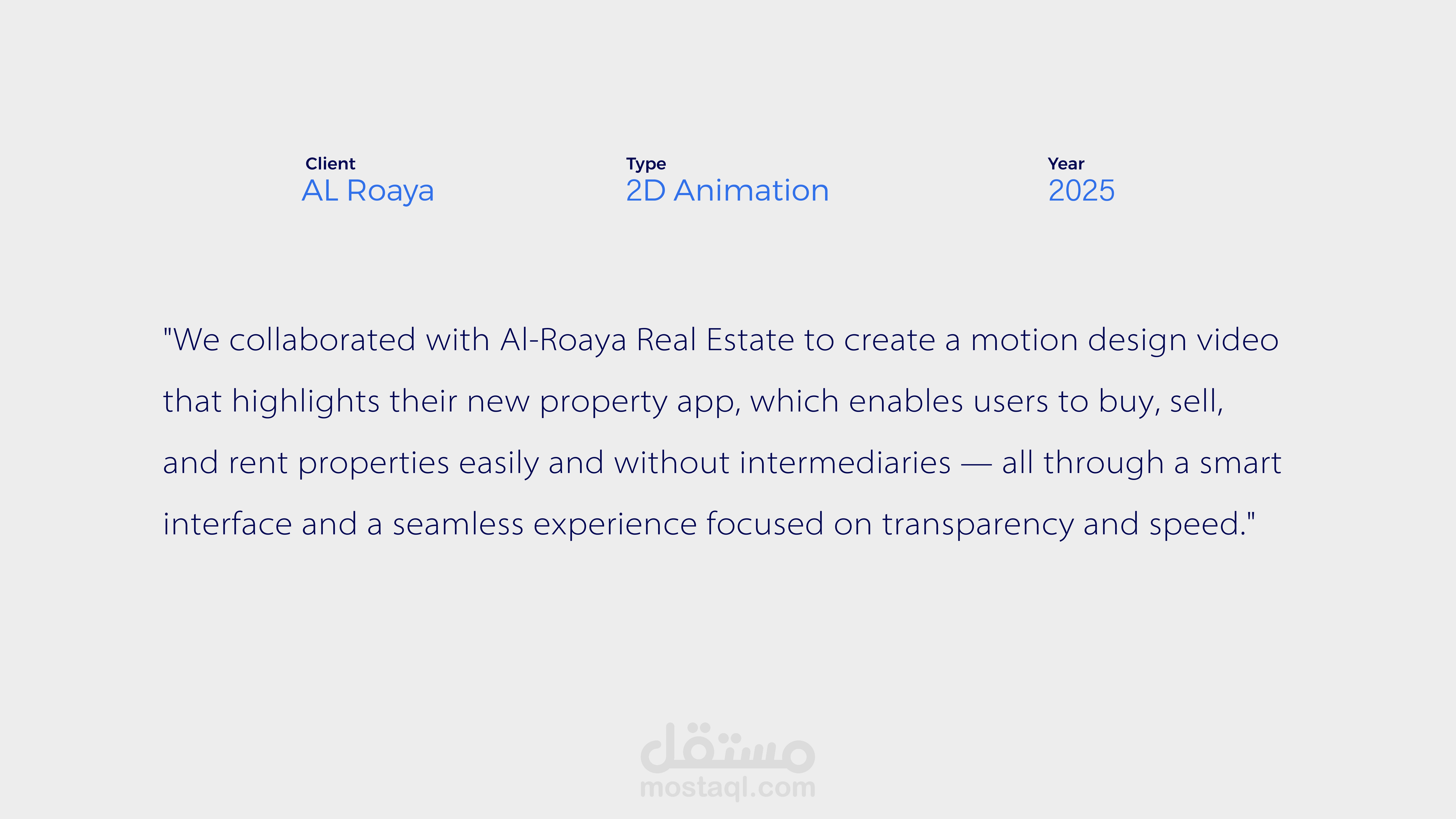 "تعاونّا مع شركة الرؤية لتصميم فيديو موشن جرافيك يُسلّط الضوء على تطبيقهم العقاري الجديد، الذي يُمكّن المستخدمين من بيع وشراء وتأجير العقارات بسهولة ودون وسطاء، مع واجهة استخدام ذكية وتجربة سلسة ترتكز على الشفافية والسرعة."