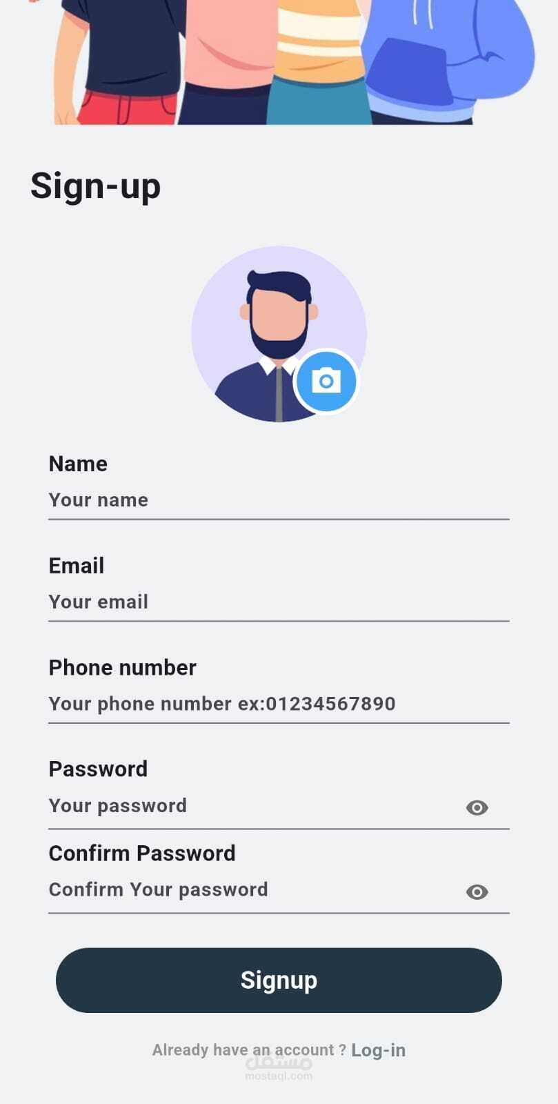 الاسم، الإيميل، رقم الهاتف، كلمة المرور، رفع صورة شخصية.