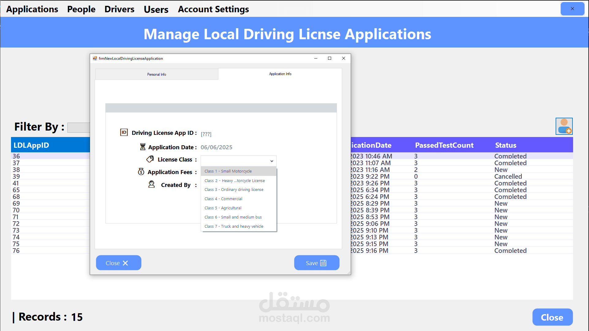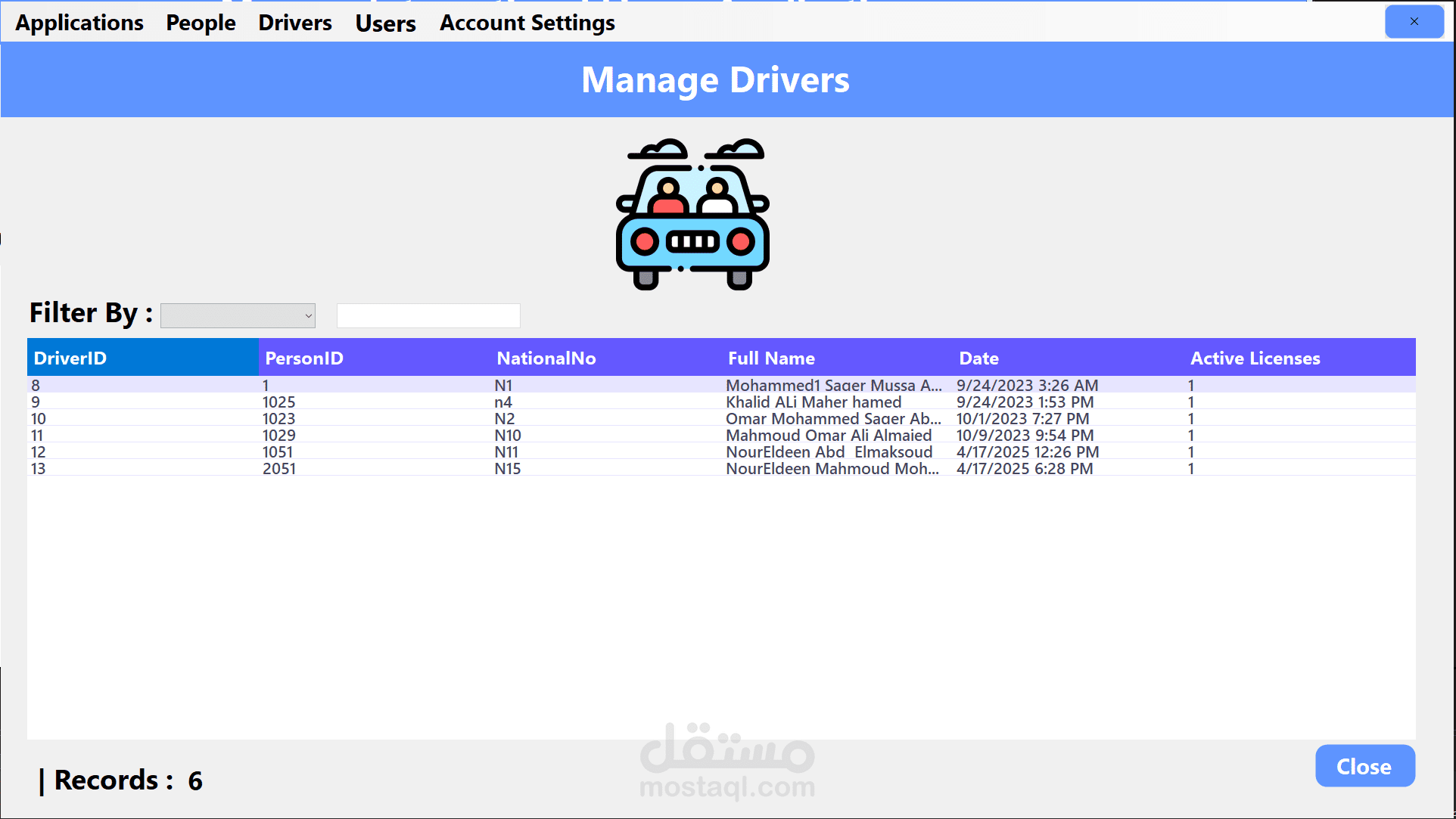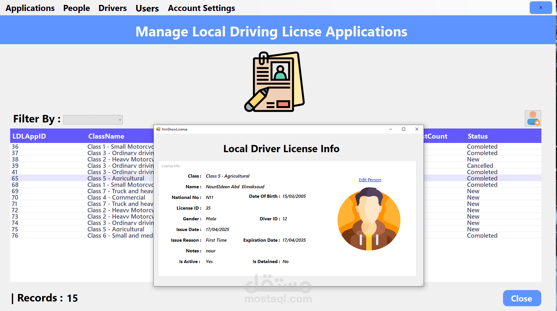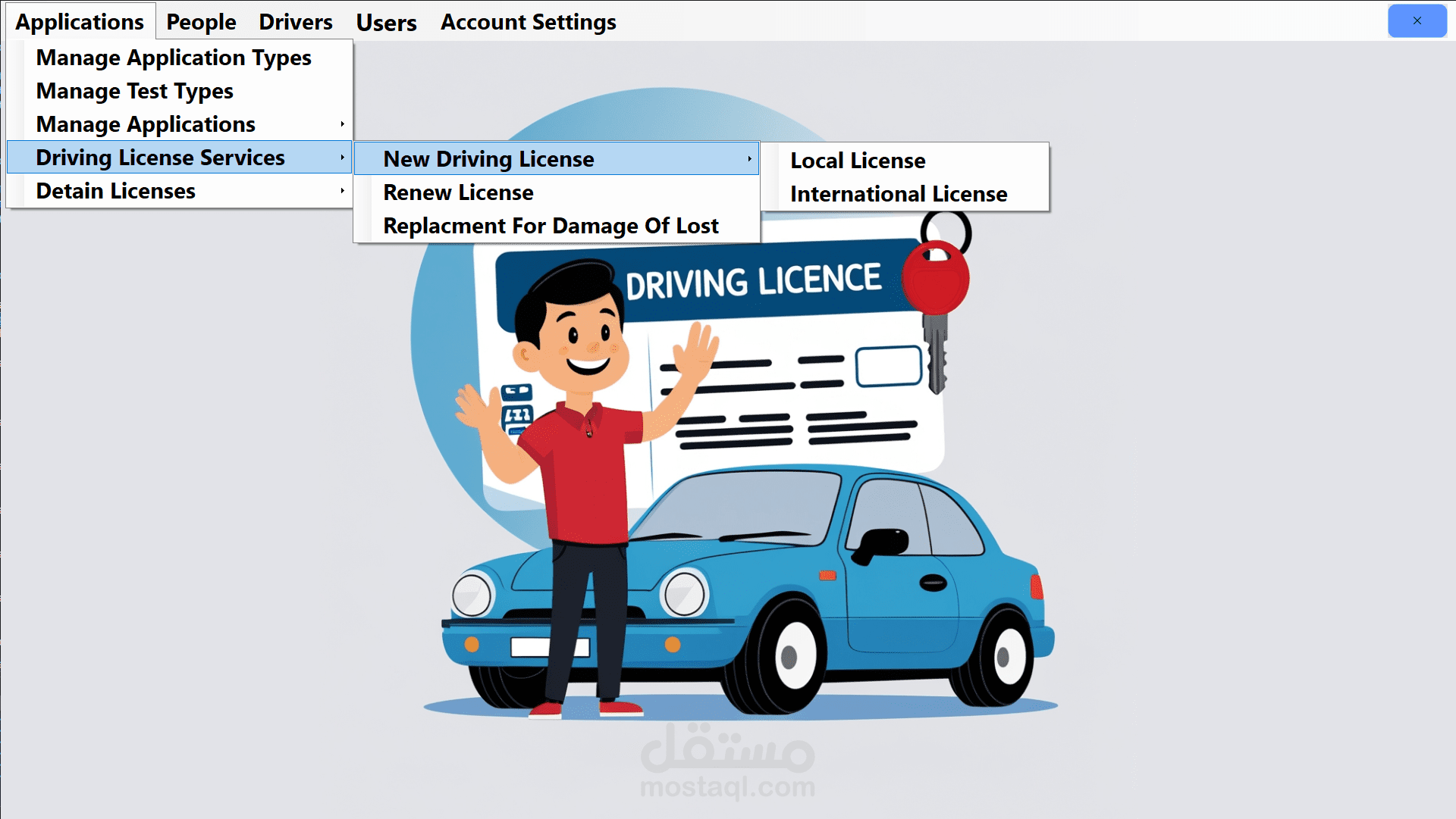 نظام مكتبي متكامل صُمم لإدارة جميع جوانب رُخص القيادة وتسجيل المركبات. تم بناء هذا النظام باستخدام C# بتقنية Windows Forms، ويعتمد على هيكلية من ثلاث طبقات تفصل بين واجهة العرض، منطق الأعمال، وطبقة الوصول إلى البيانات.