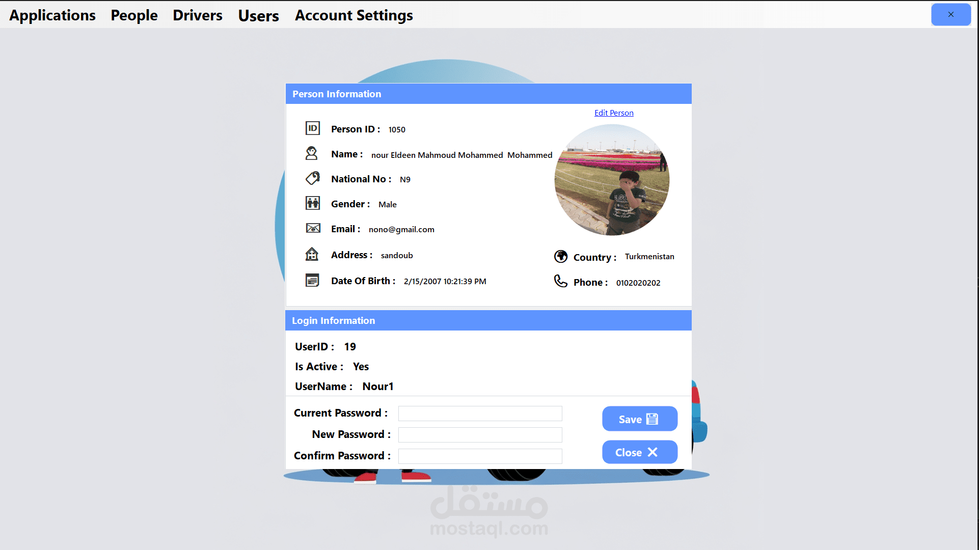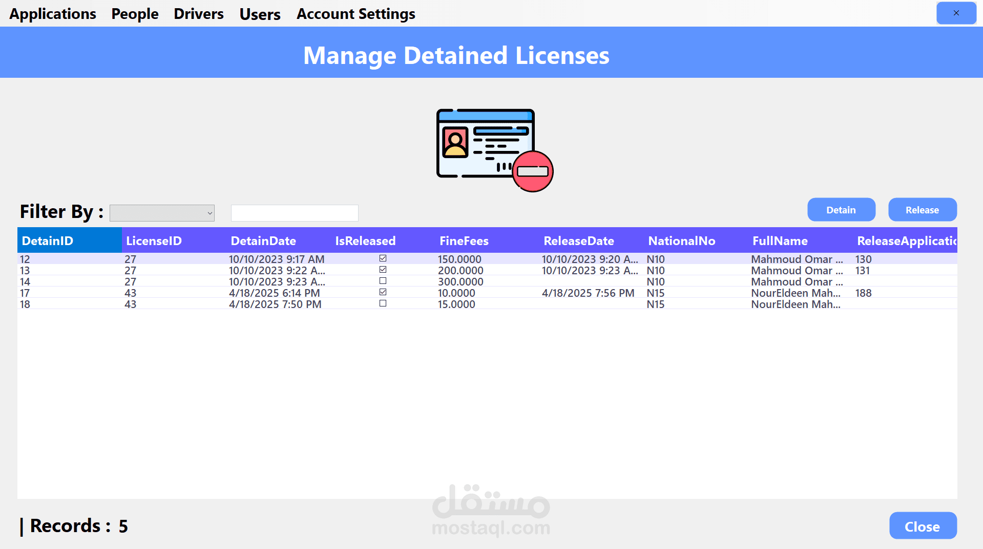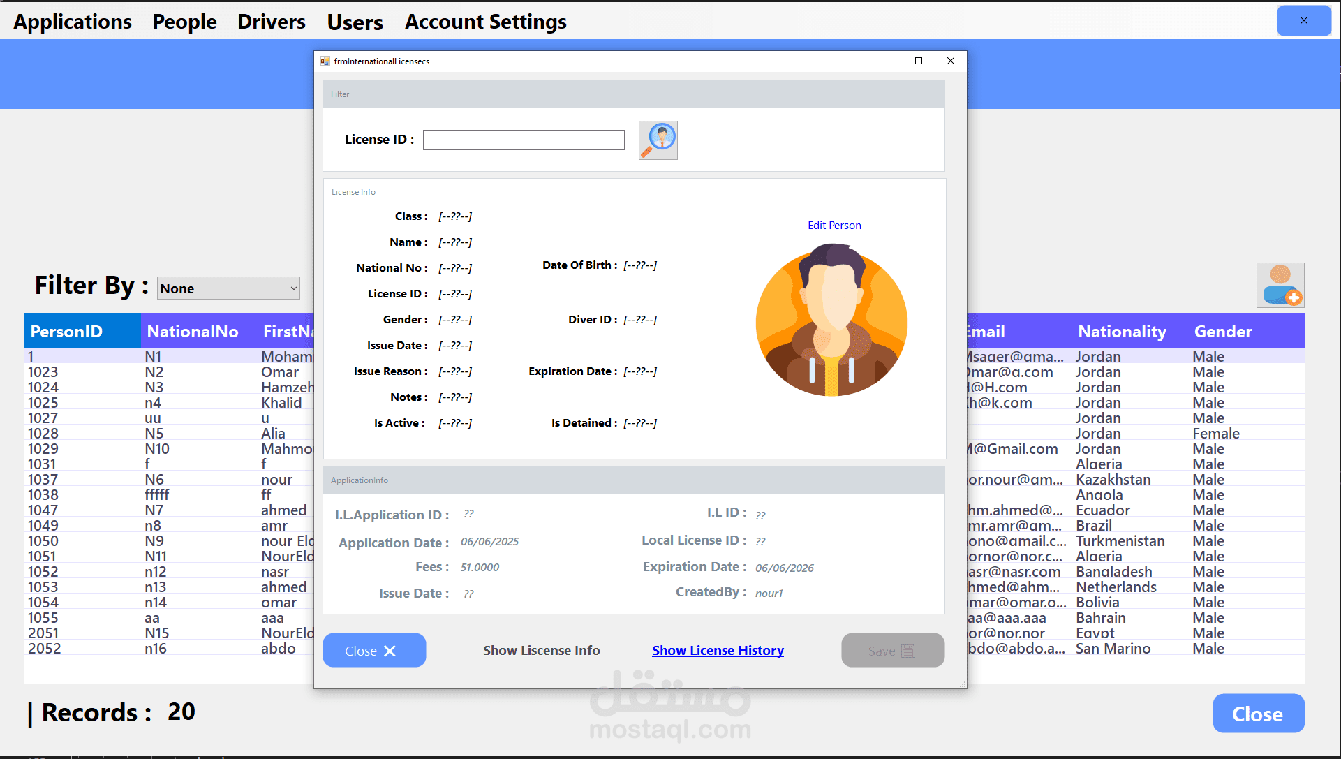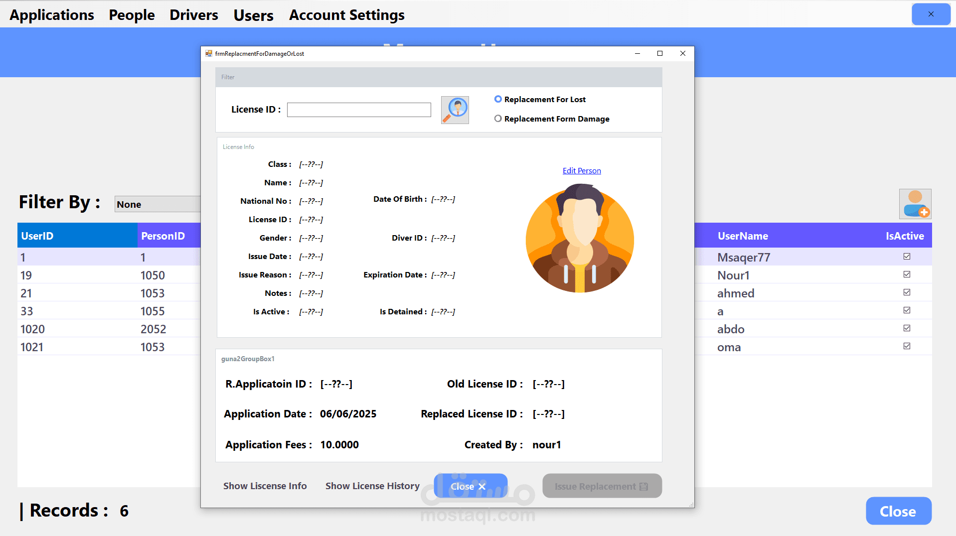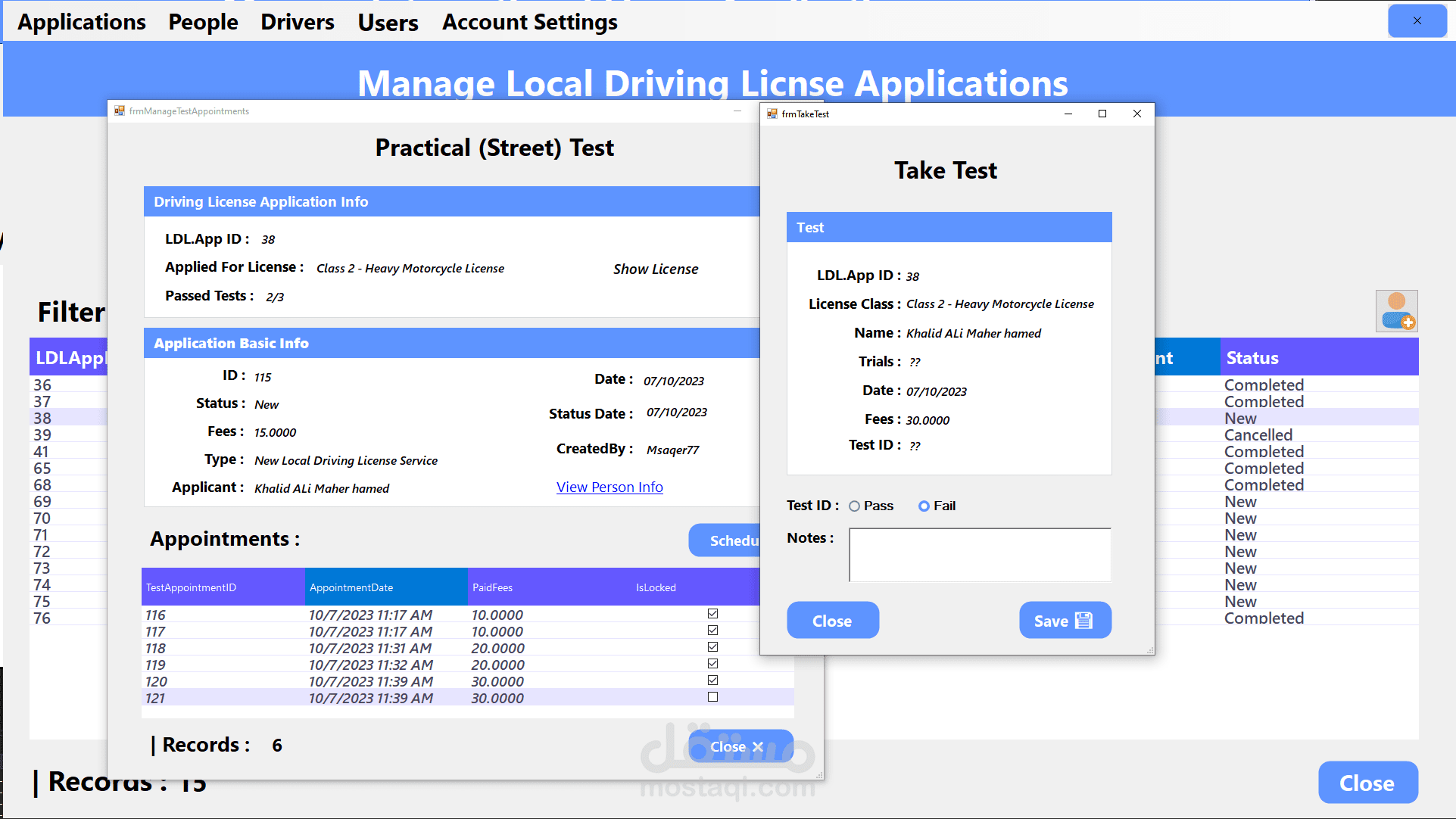 نظام مكتبي متكامل صُمم لإدارة جميع جوانب رُخص القيادة وتسجيل المركبات. تم بناء هذا النظام باستخدام C# بتقنية Windows Forms، ويعتمد على هيكلية من ثلاث طبقات تفصل بين واجهة العرض، منطق الأعمال، وطبقة الوصول إلى البيانات.