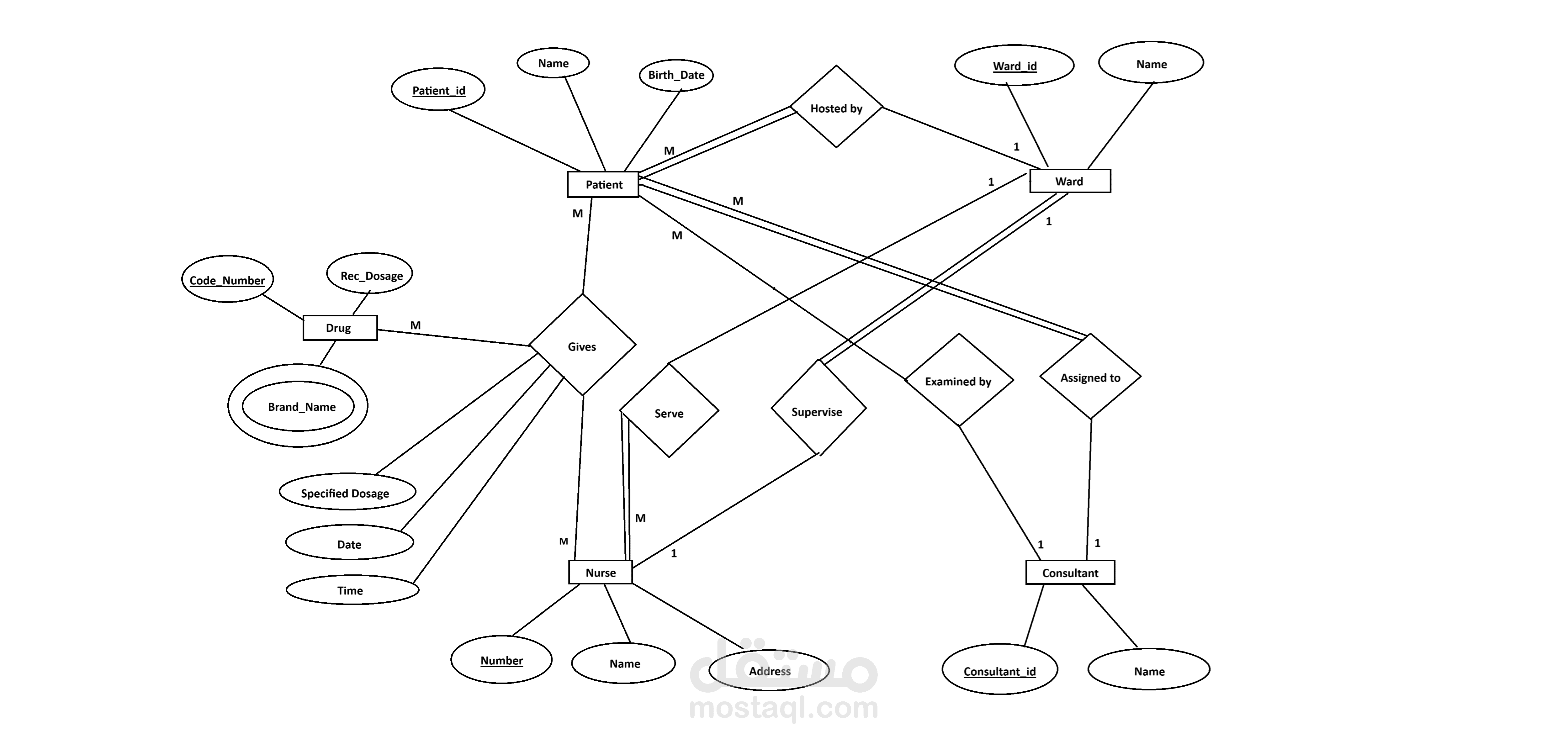 المخطط يعكس العلاقات متعددة-إلى-متعددة (M:N) والعلاقات واحد-إلى-واحد (1:1) بشكل دقيق، مما يجعله أساسًا قويًا لتصميم قاعدة بيانات علائقية لمستشفى.